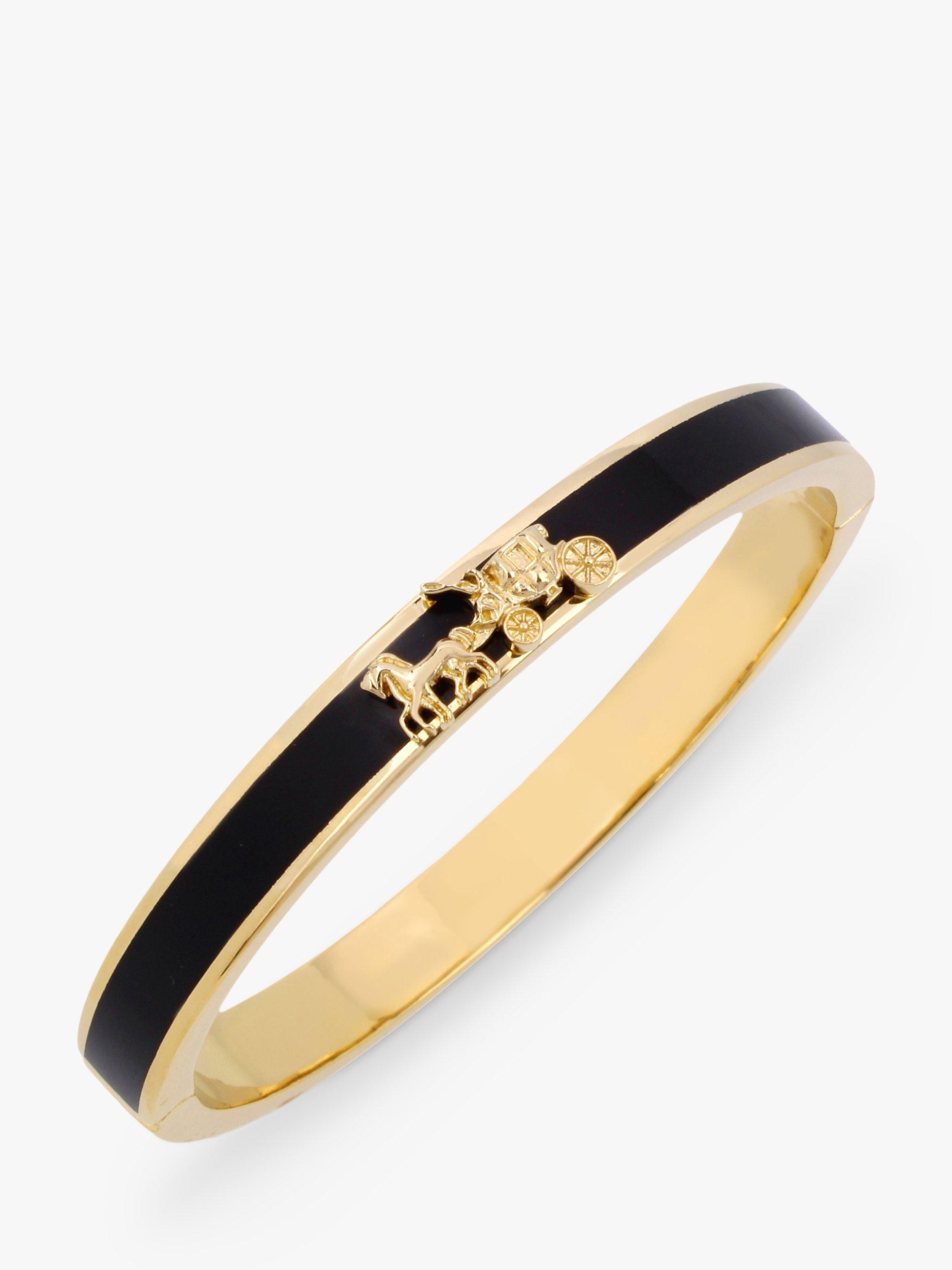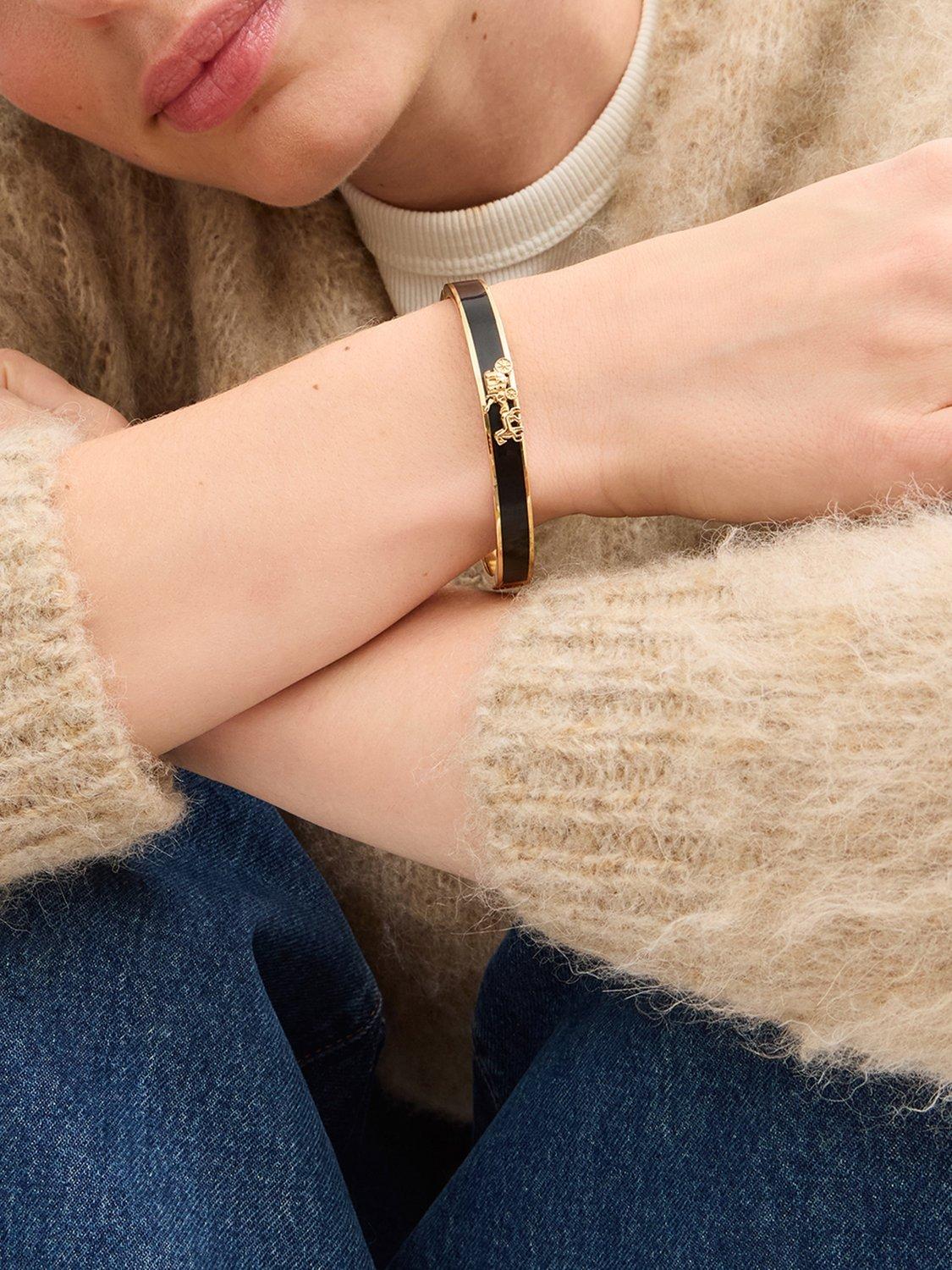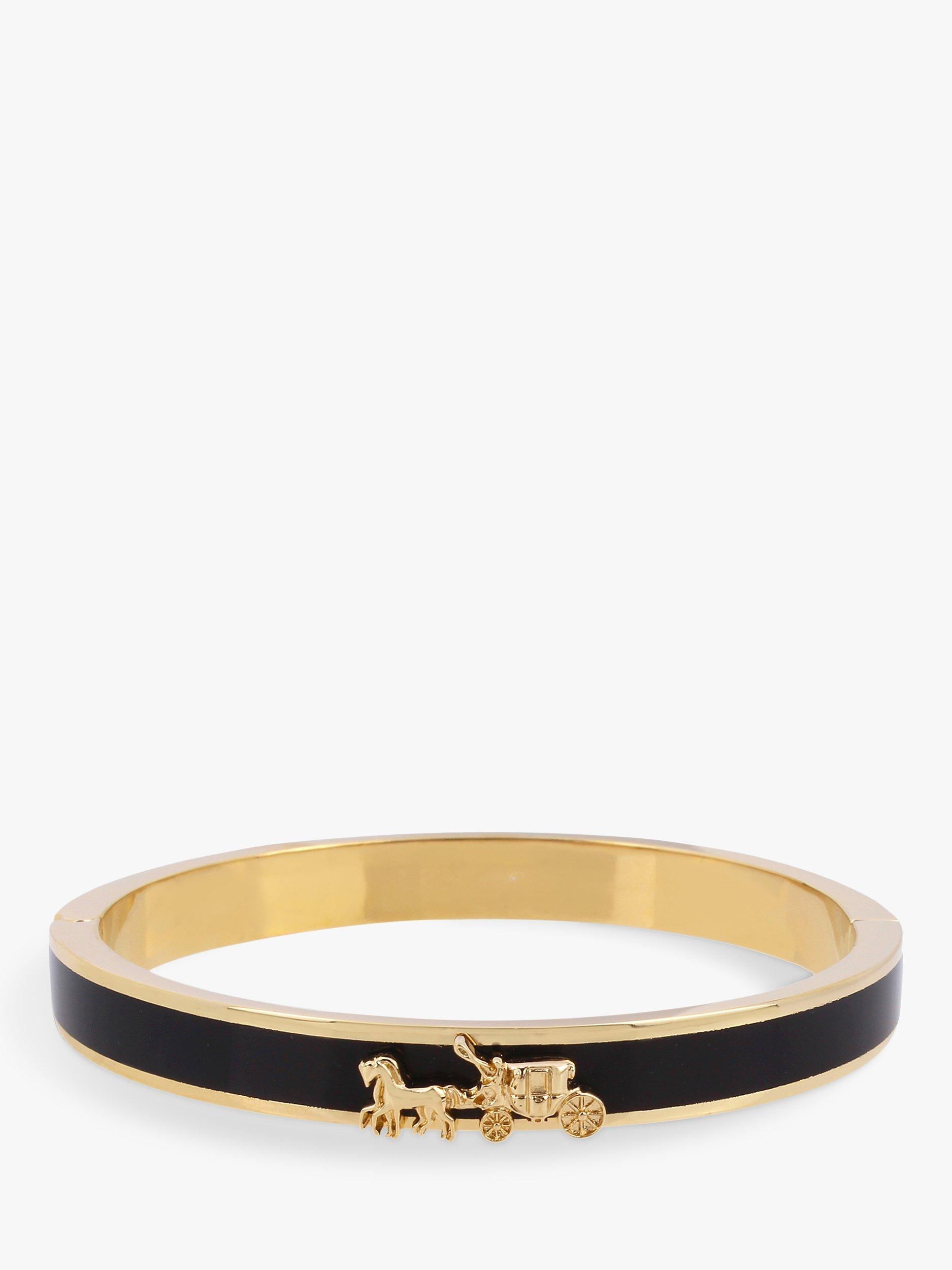 With sleek Coach style, this bangle features the iconic Coach horse & carriage motif atop sleek enamel detailing. The bangle is designed with a hinge for easy on and offs.