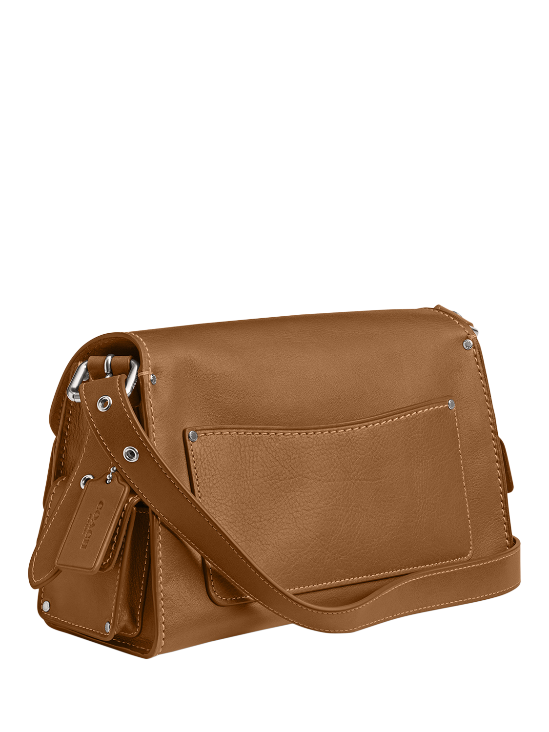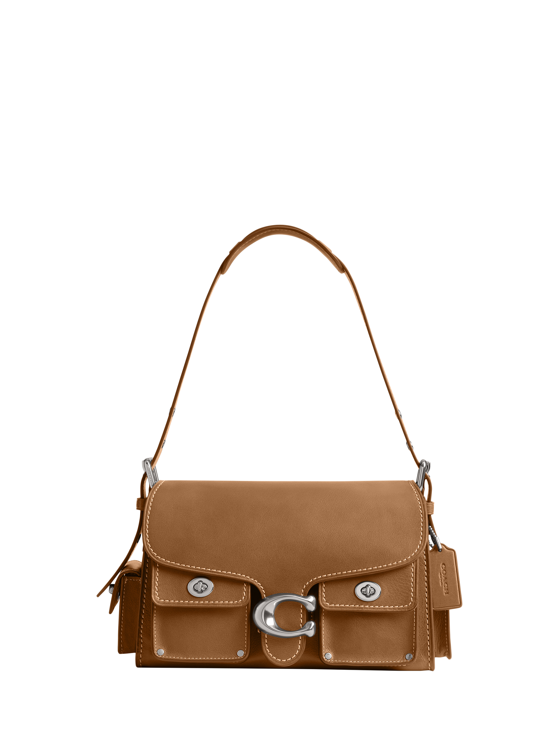 The Soft Tabby reimagines Coach's structured take on an archival 1970s Coach design with a relaxed feel. Finished with cargo pockets detailed with iconic turnlock closures, polished stud accents and signature hardware, this natural grain leather shoulder bag features pockets inside and out to organise small accessories and two straps to carry by hand, style as a short shoulder bag or wear crossbody.