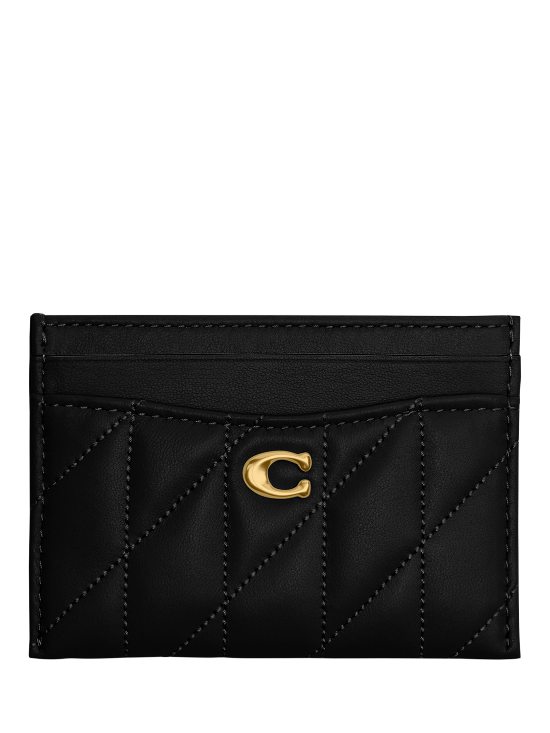 A card holder from Coach. Crafted of quilted plush, ultra-soft leather detailed with the brand's signature hardware, this case has four card slots and a centre compartment to hold more cards or cash. Slip it in your pocket or stash inside your bag.