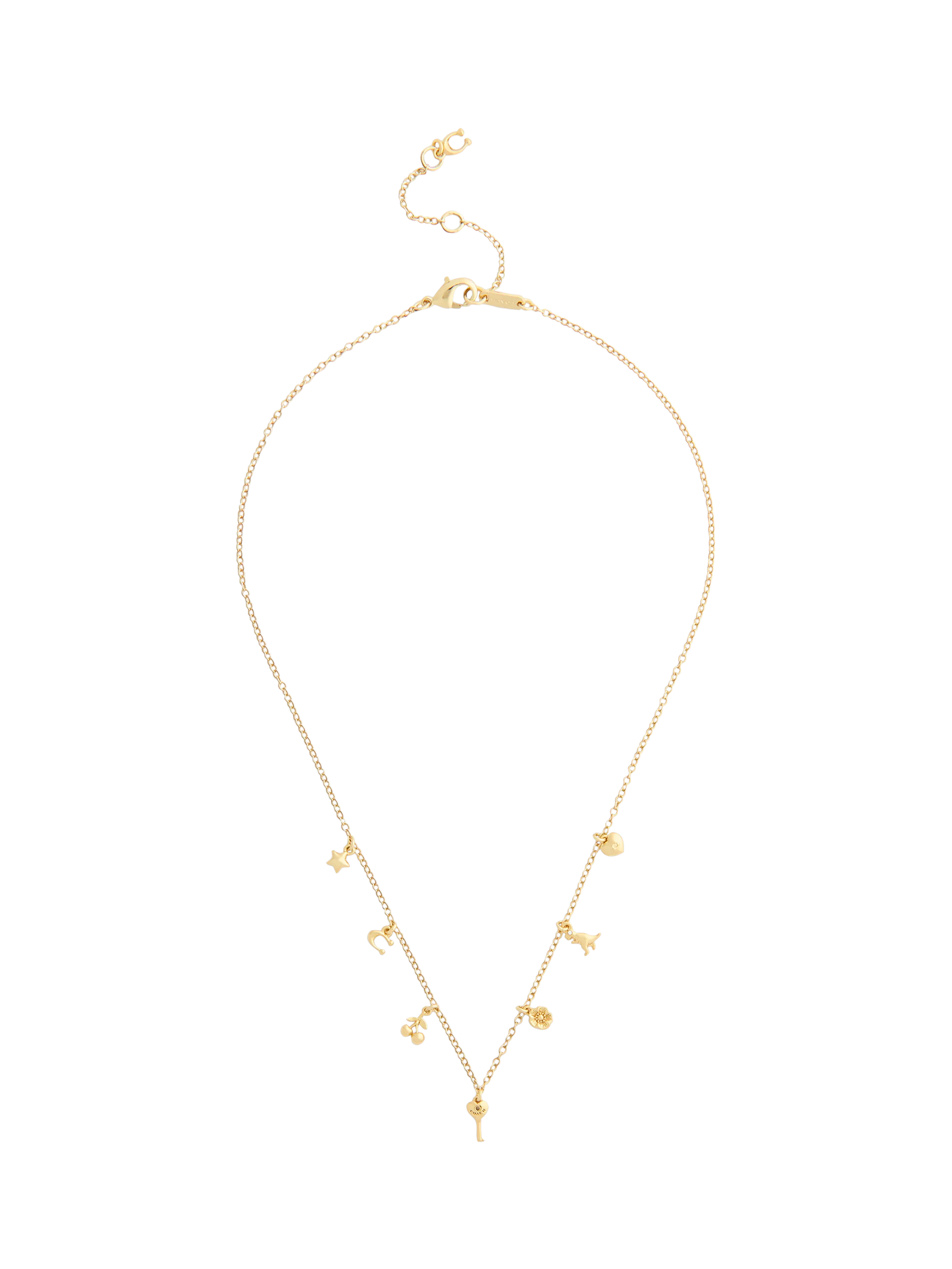 Perfect for everyday, this refined chain necklace features iconic mini charms at the front, including signature the iconic sculpted C, Rexy dino, tea rose, cherry, key and heart. Fastens with an adjustable lobster clasp closure. Made from brass and glass crystal.