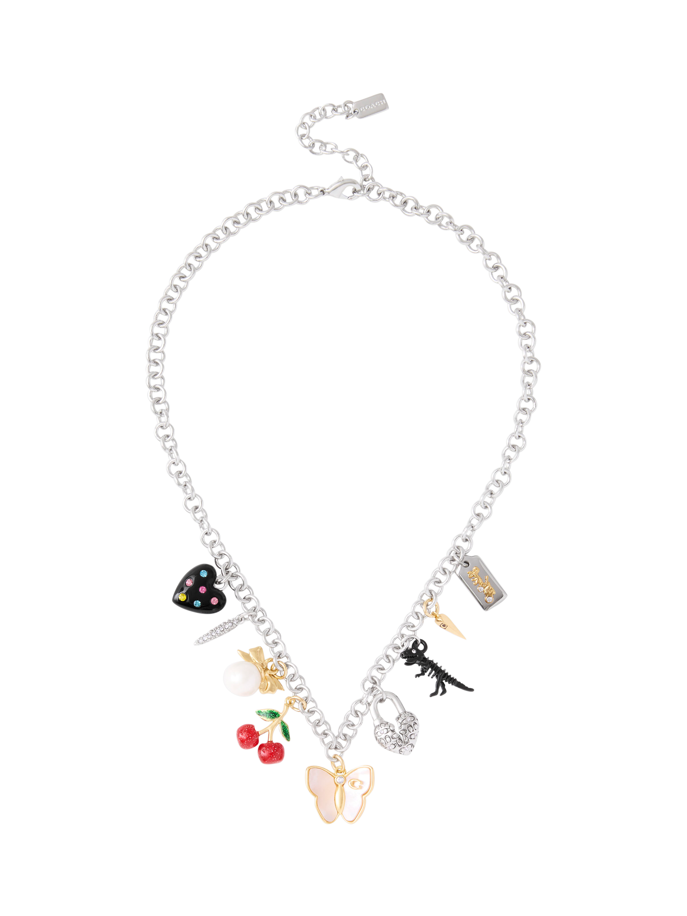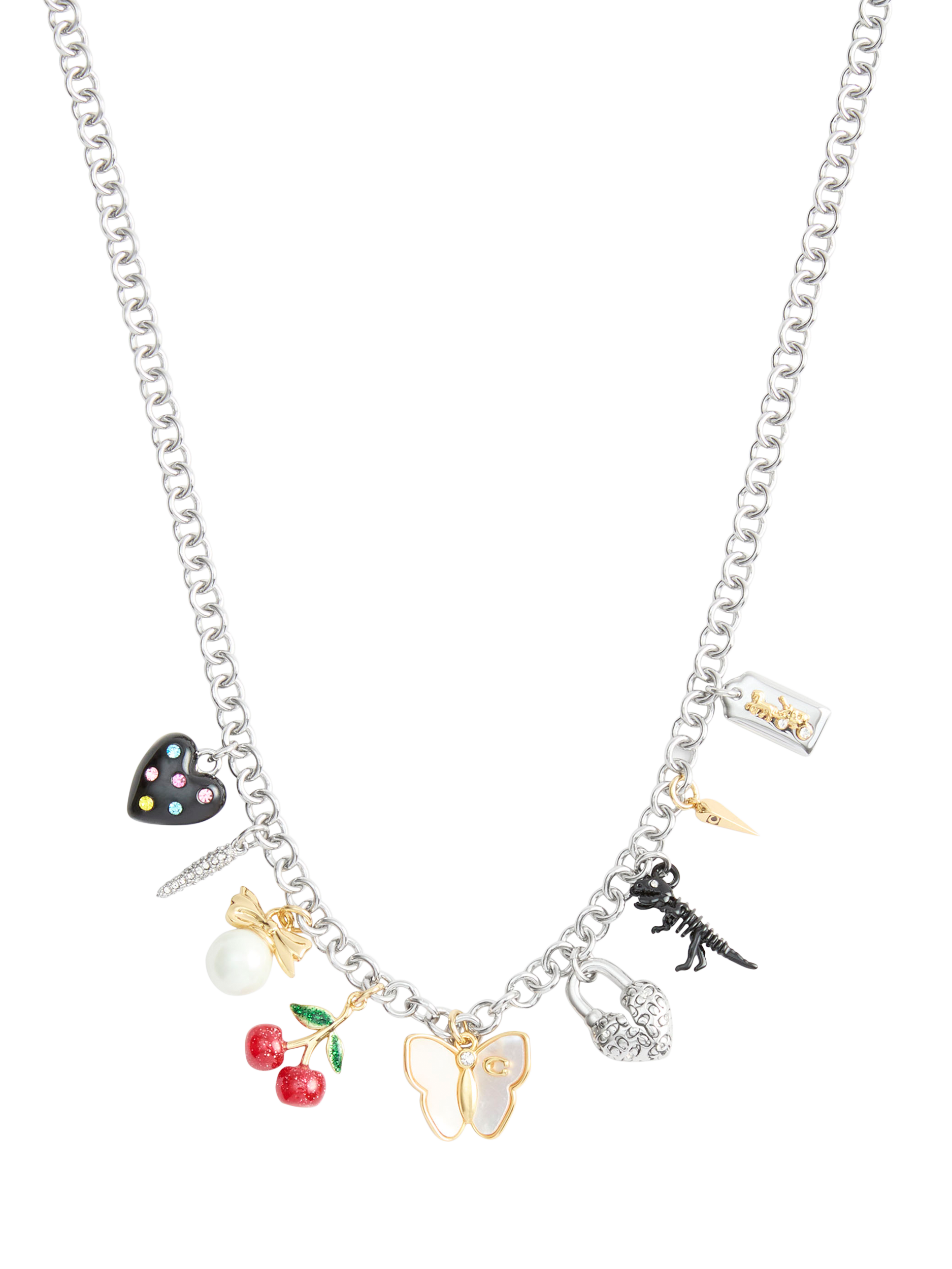Decorating your décolletage, this statement necklace from Coach features playful mixed motif signature charms including a heart with colourful stones, pearl with a feminine bow, cherry cluster, dreamy mother of pearl butterfly, broken heart padlock adorned with quilted signature sculpted C's, skeletal Rexy dino and a hangtag with iconic horse and carriage. Designed with a lobster claw clasp, it ensures a safe fit. Includes a signature Coach jewellery pouch.