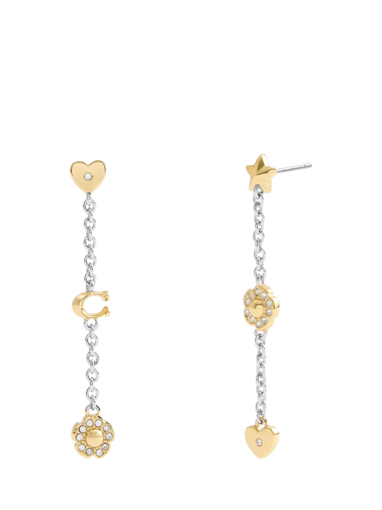 Designed by Coach, these linear chain earrings feature signature mixed motifs including a sculpted C, tea rose, heart and celestial star. Complete with post fittings, they are suitable for pierced ears only. Includes a signature Coach jewellery pouch.
