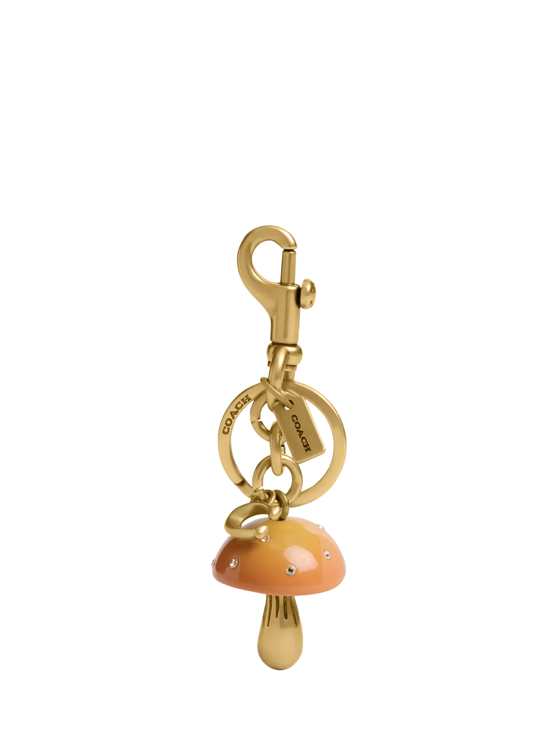 The whimsical Mushroom bag charm from Coach celebrates the optimism of nature and a sense of wonder in the everyday. Detailed with brilliant crystal accents for a touch of sparkle, clip it to a bag or use it to organize keys.