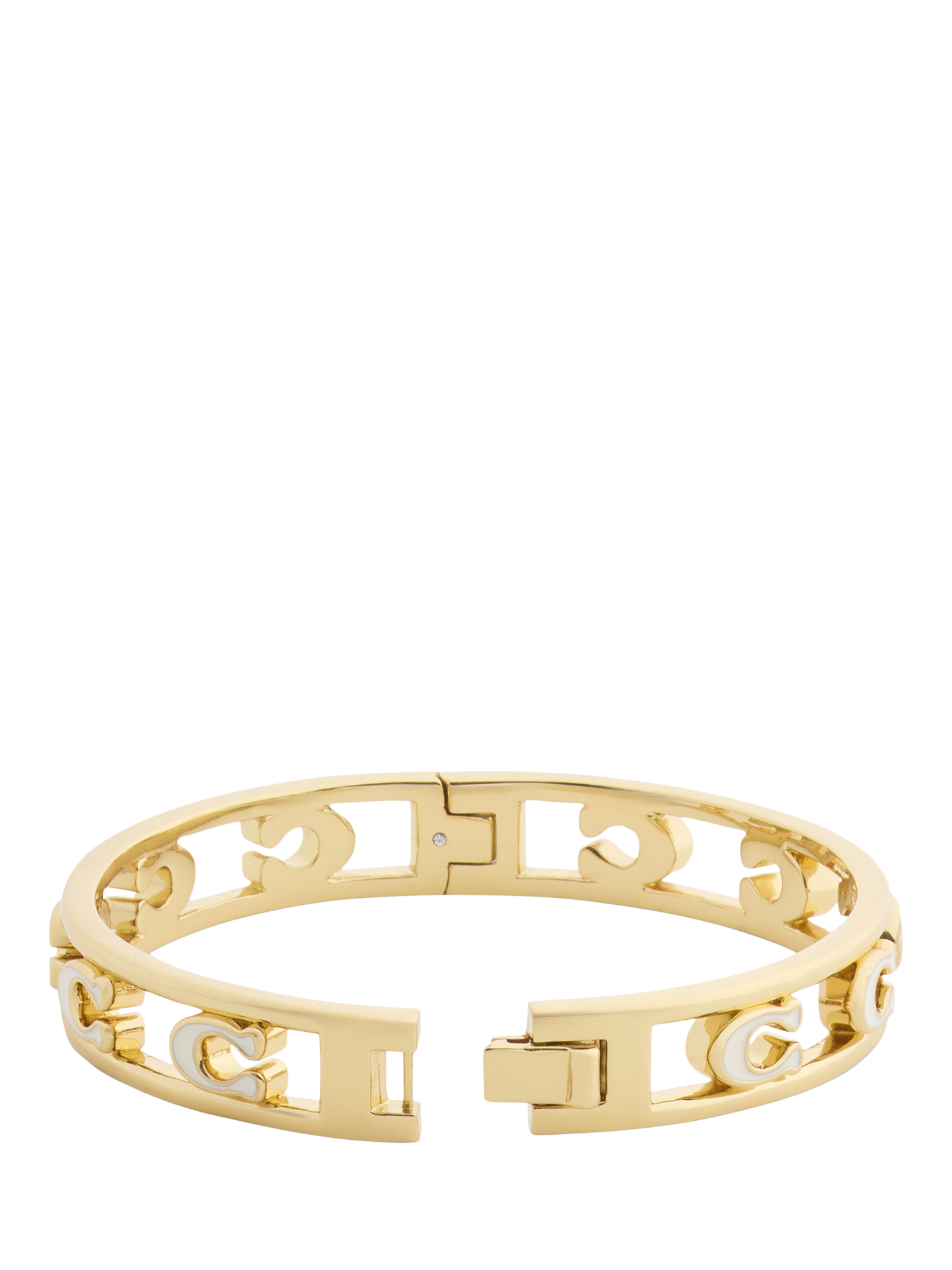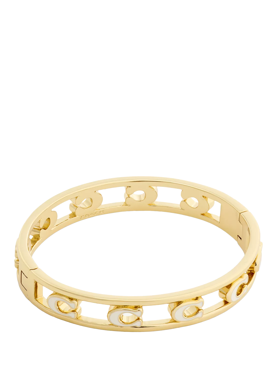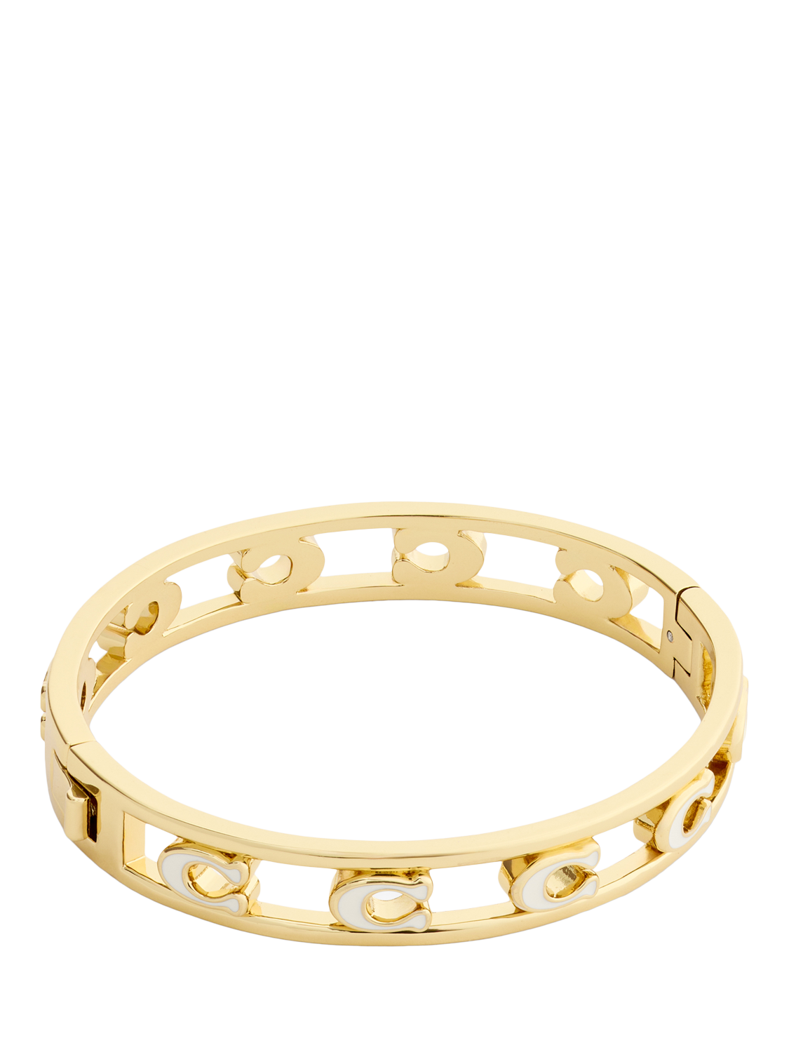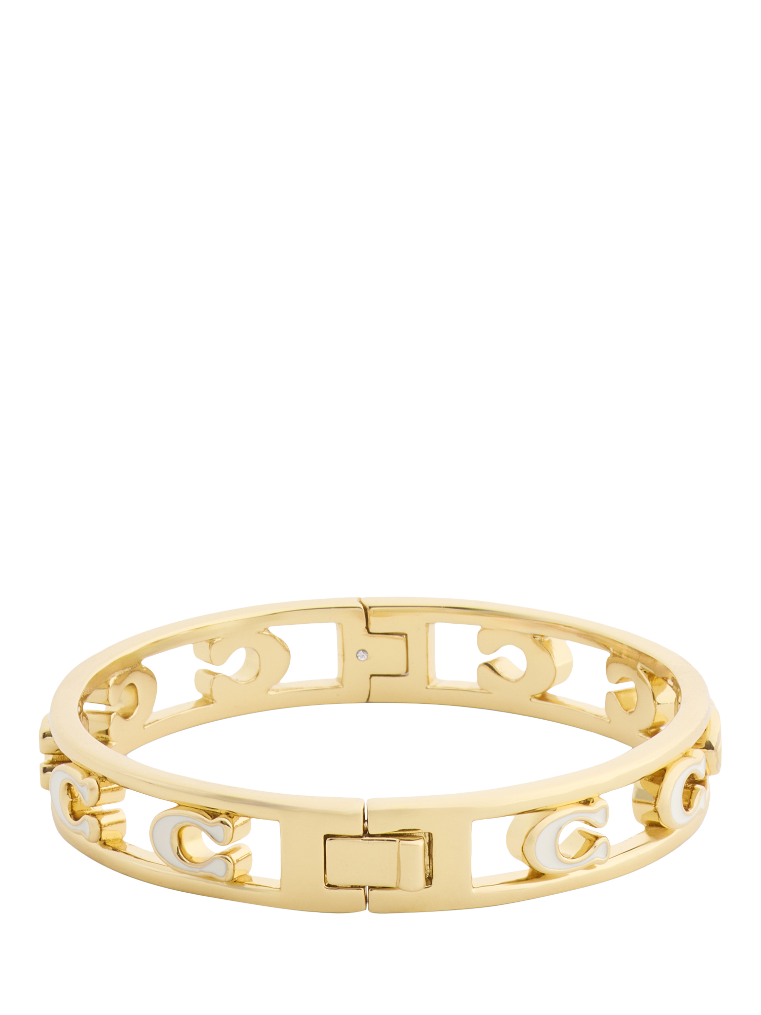 Refined bangle bracelet featuring openwork signature sculpted C hardware, perfect for everyday. Secured with an easy push-button hinge closure. Made from brass and enamel.