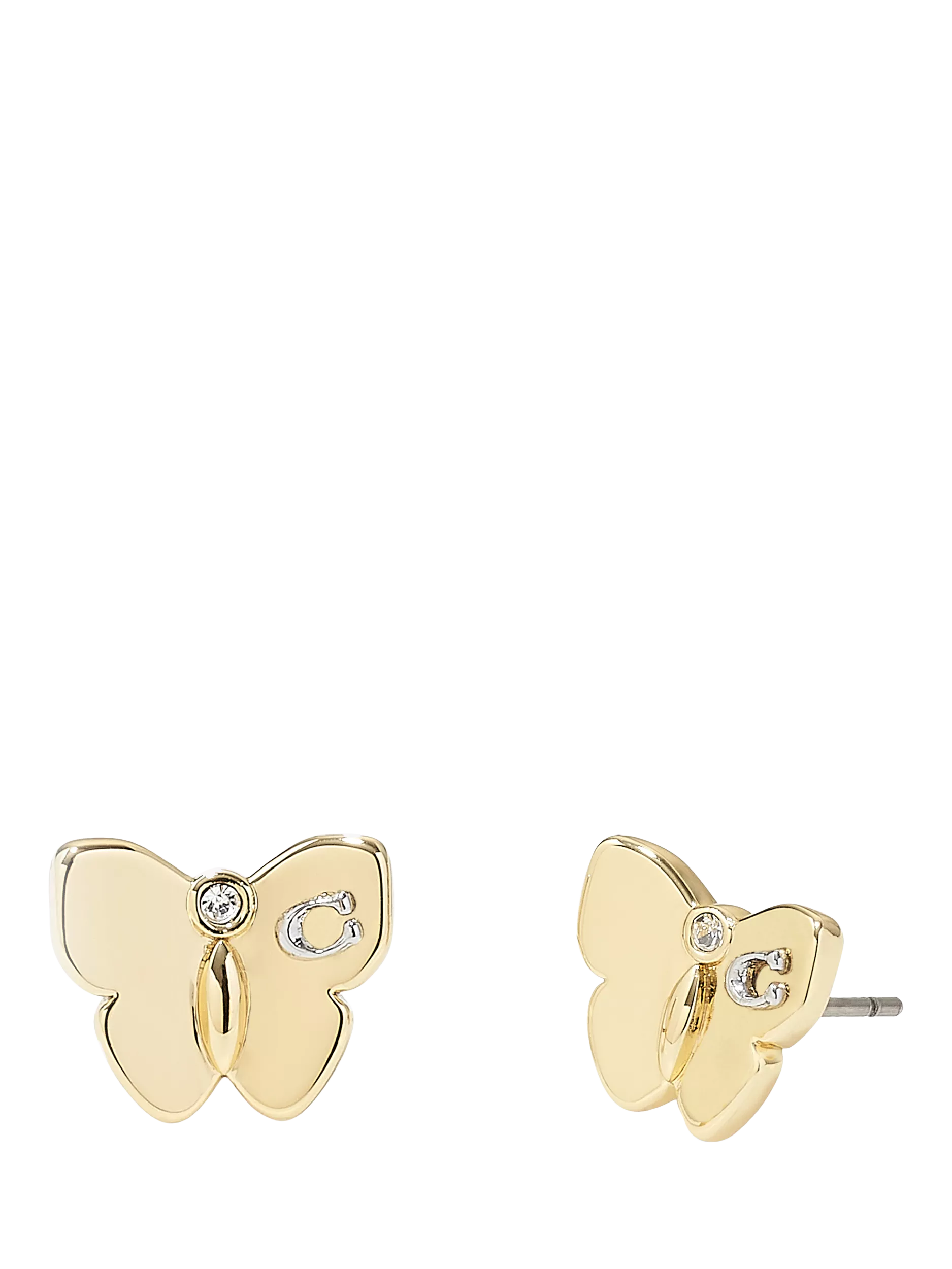 Butterfly stud earrings adorned with minimal stone accent and signature sculpted C. Earrings have a post back closure, suitable for pierced ears only. Made from brass and glass with a titanium post. Includes COACH pouch.
