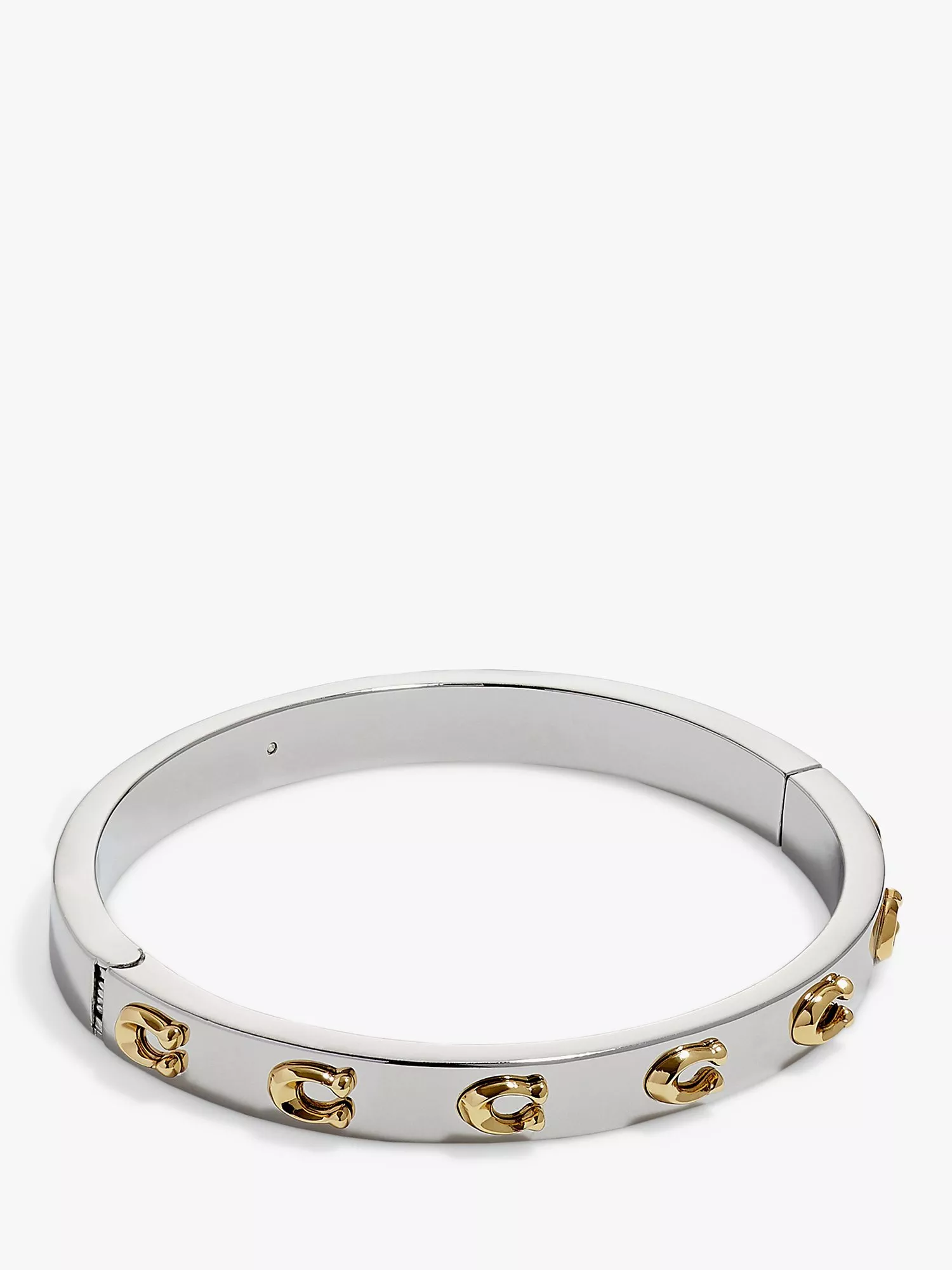 Signature style from Coach. This bangle bracelet is detailed with a line of Signature C motifs across the front and is secured with a hinged closure.