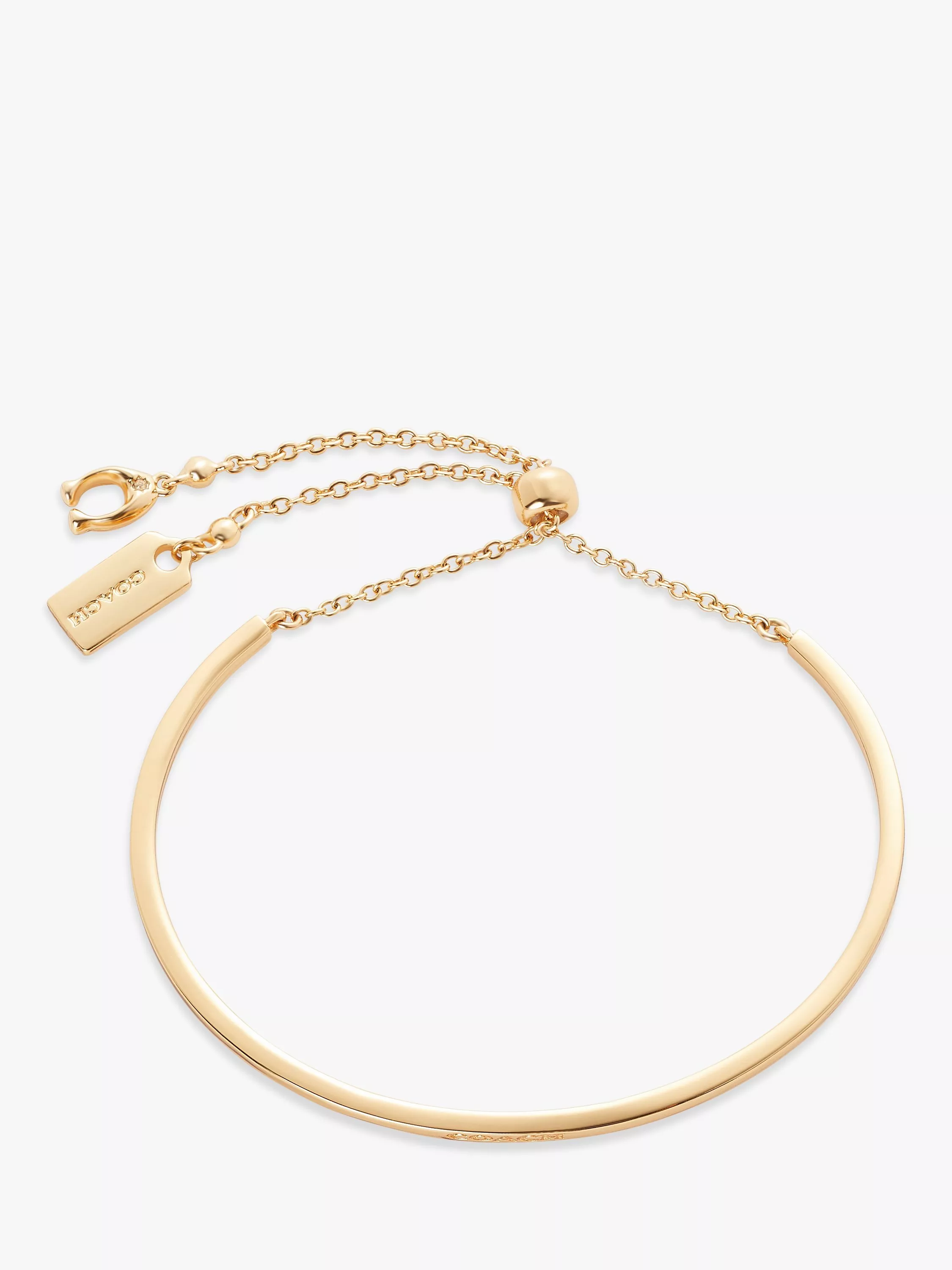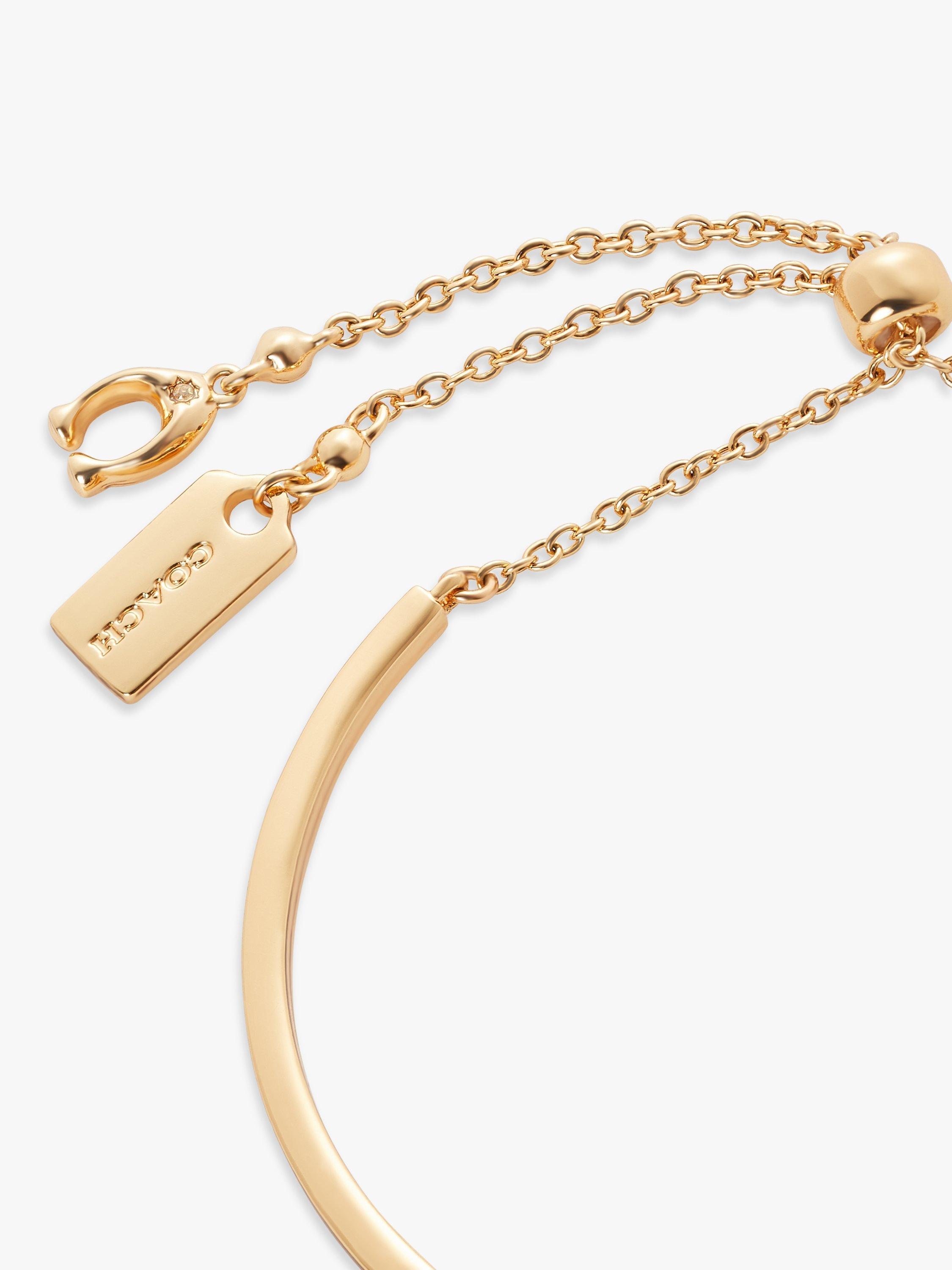 This modern minimalist bracelet signed Coach features a diminutive hangtag and the staple brand's signature for heritage Coach style. The sliding bead closure adjusts to most wrists and adapts perfectly to the wrist.