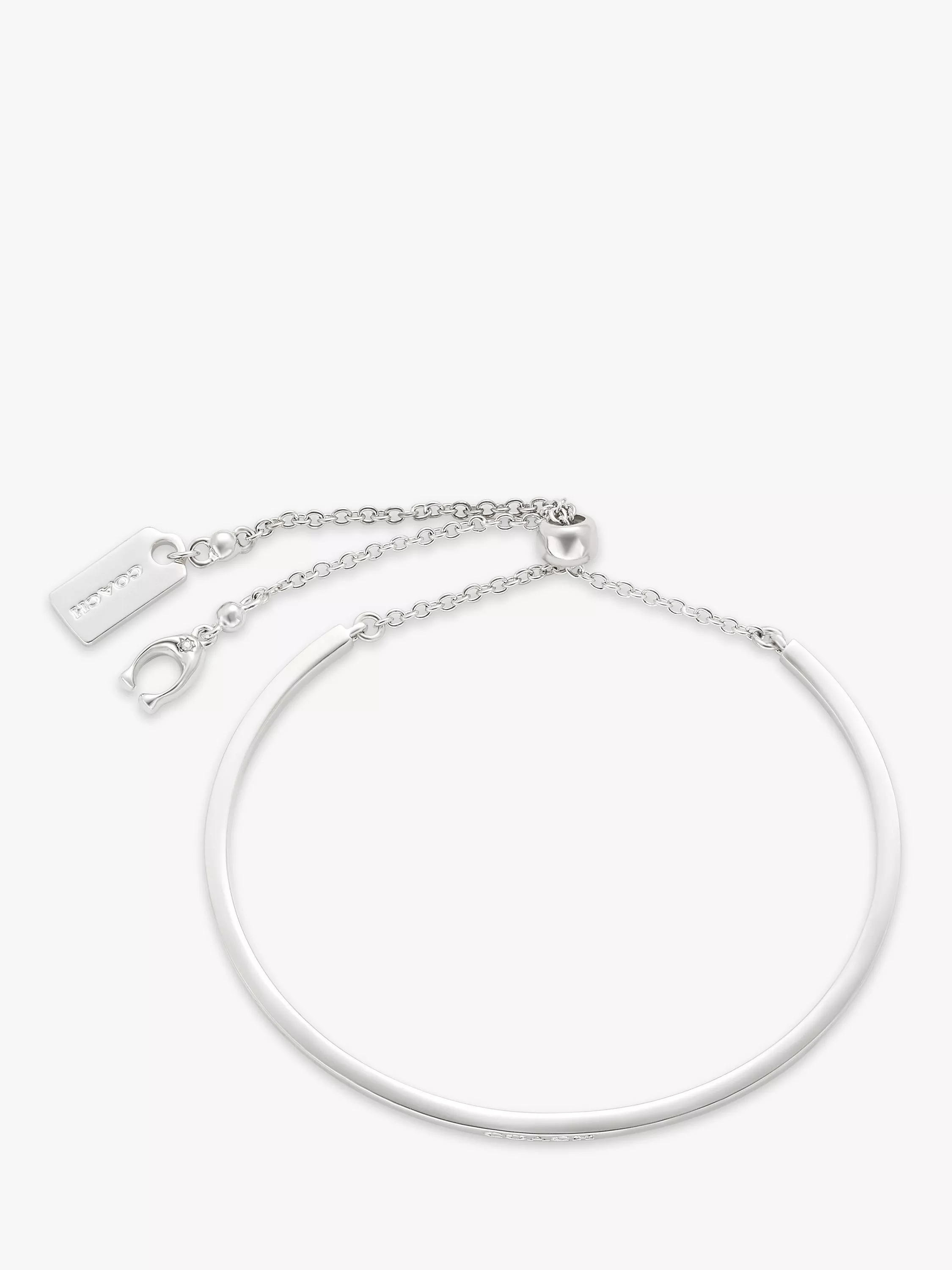This modern minimalist bracelet signed Coach features a diminutive hangtag and the staple brand's signature for heritage Coach style. The sliding bead closure adjusts to most wrists and adapts perfectly to the wrist.