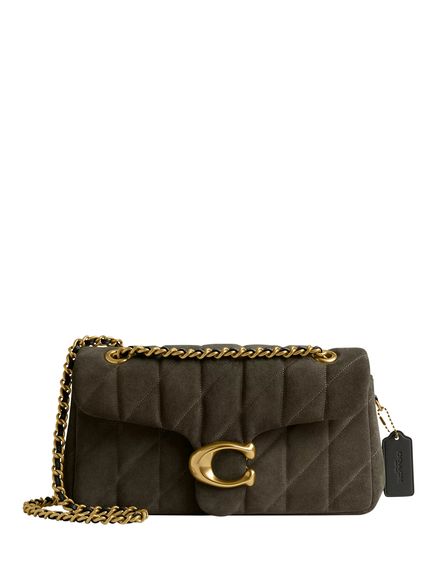 A modern take on an archival 1970s Coach design, the structured Tabby shoulder bag is crafted of quilted velvety suede. Finished with Signature hardware for an iconic touch, the compact 26 features a long leather chain strap to wear crossbody or double up for a shorter, dressier look.