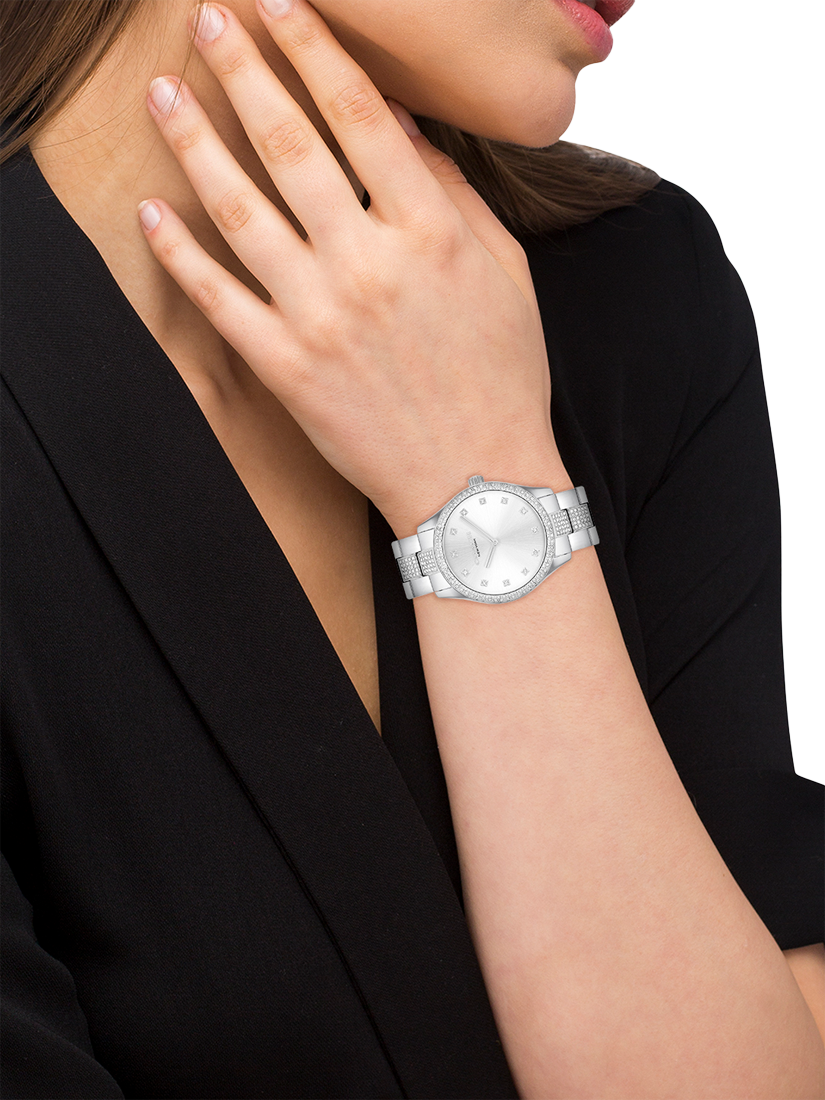 Secured by a supportive three link stainless steel bracelet with crystal centre links, it is sure to complement your looks with its gleaming polished finish. Plus, it's water resistant to 3ATM.