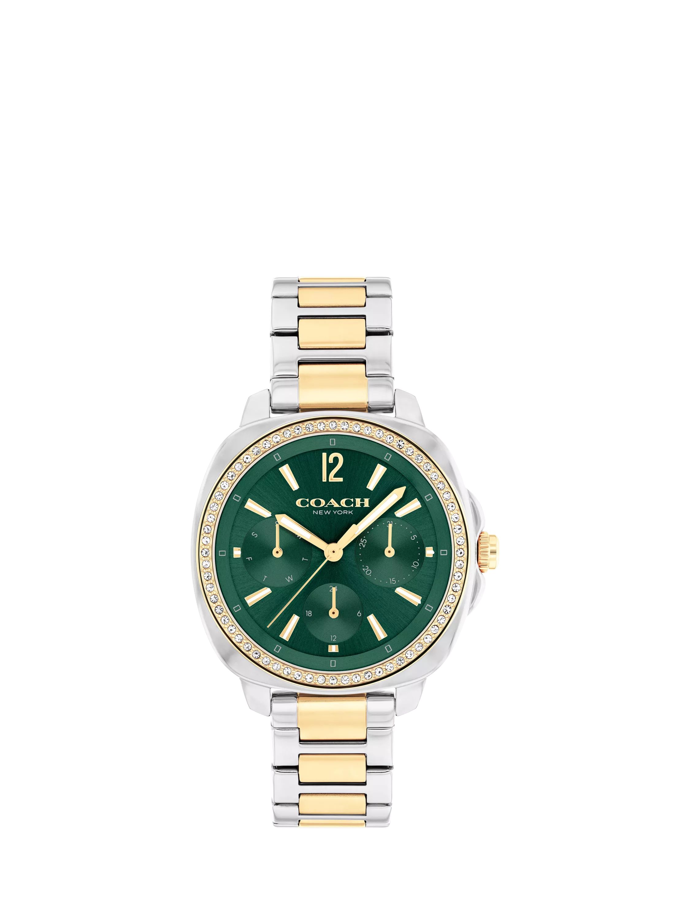 From the Kitt family, this watch from Coach is a luxurious piece to add to your timepiece collection. Housed within a 34mm cushion shaped two tone stainless steel and gold IP case, it also has a crystal set bezel and a green sunray dial.