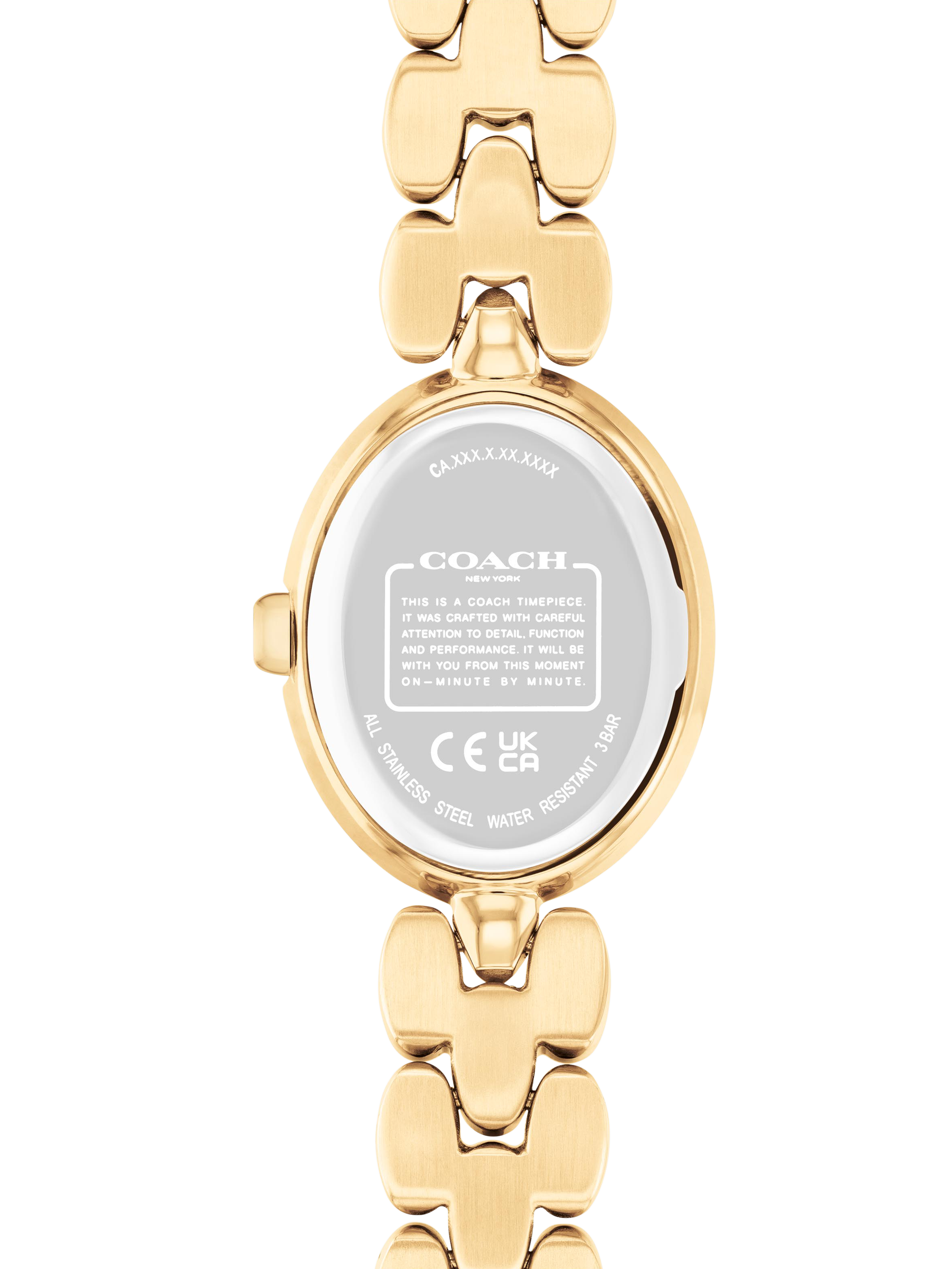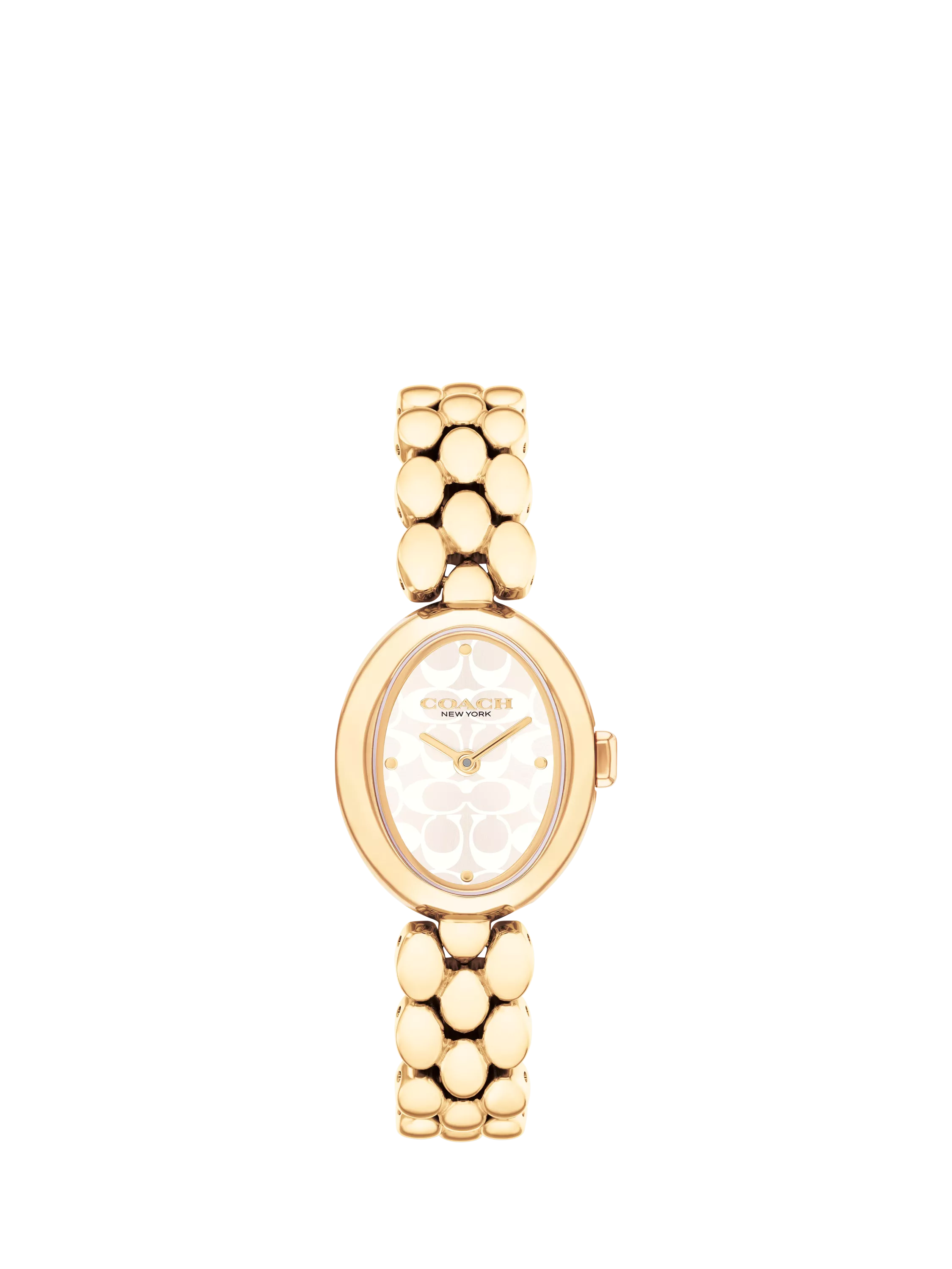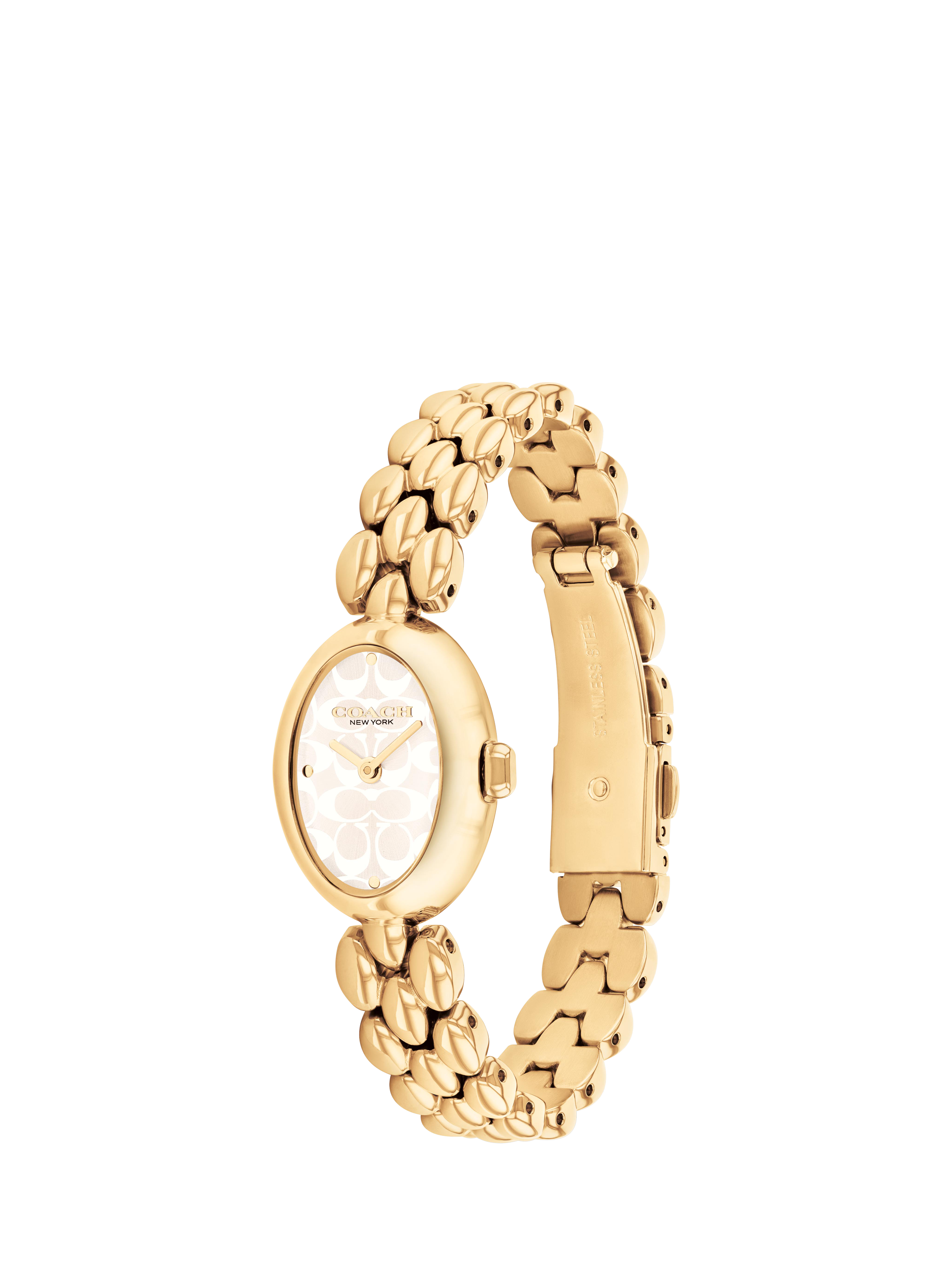 Fashion-forward and elegant, the Sammy watch from Coach has a 22mm oval shaped gold IP case with a white sunray signature C dial.