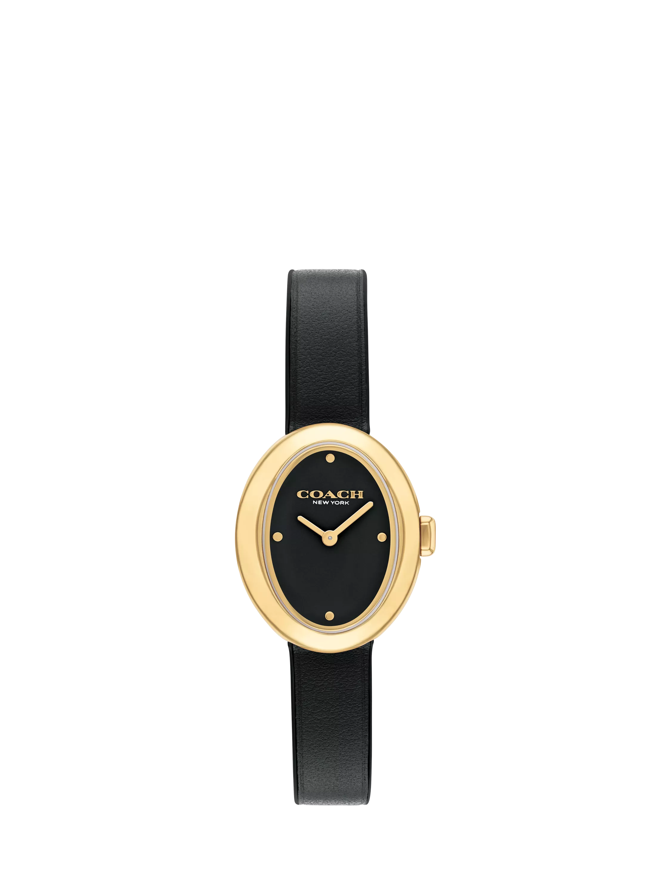 Fashion-forward and elegant, the Sammy watch from Coach has a 22mm oval shaped gold IP case with a black lacquer dial.
