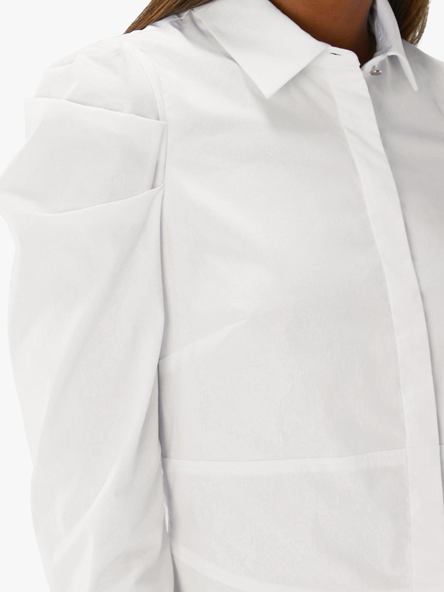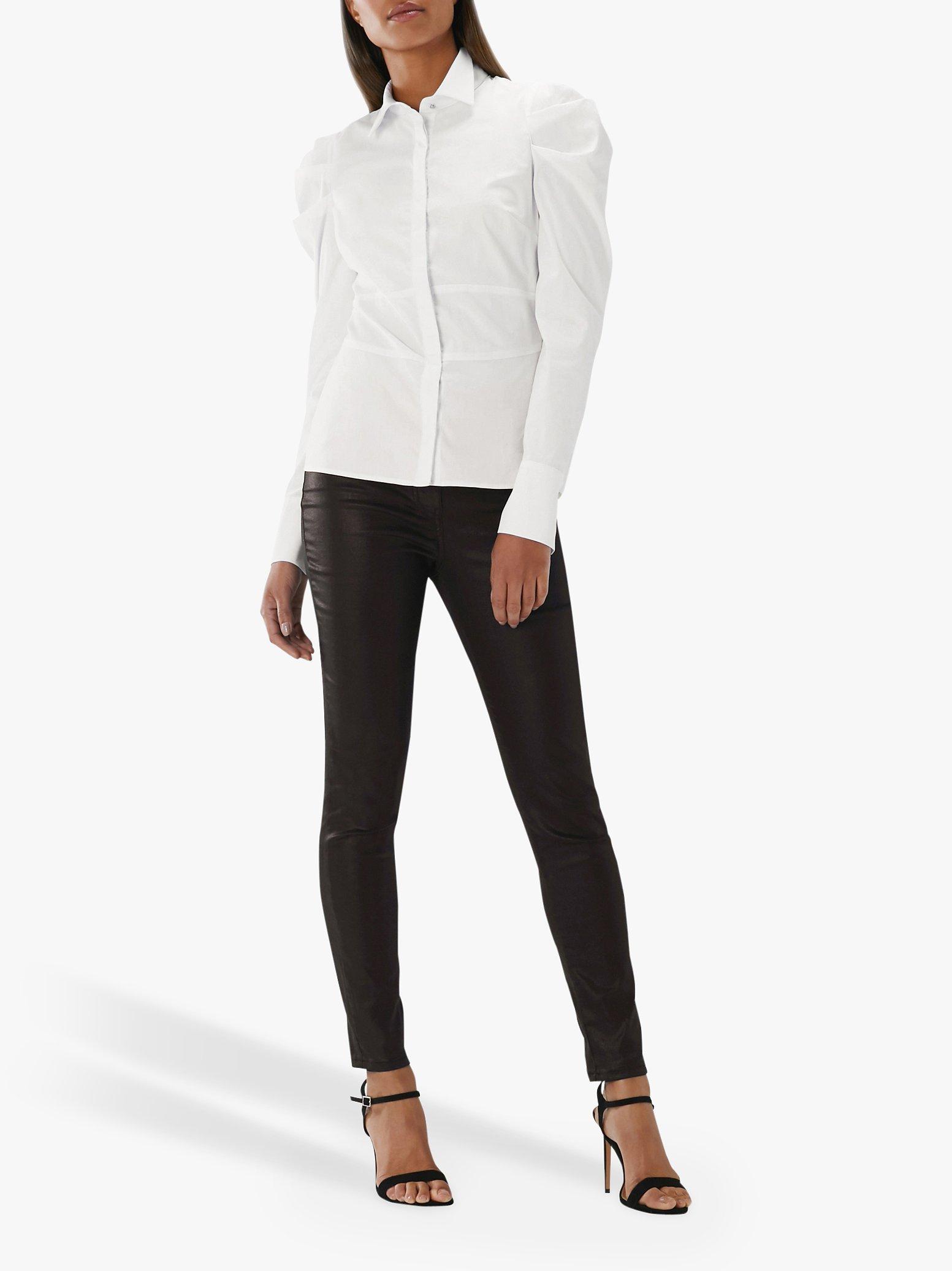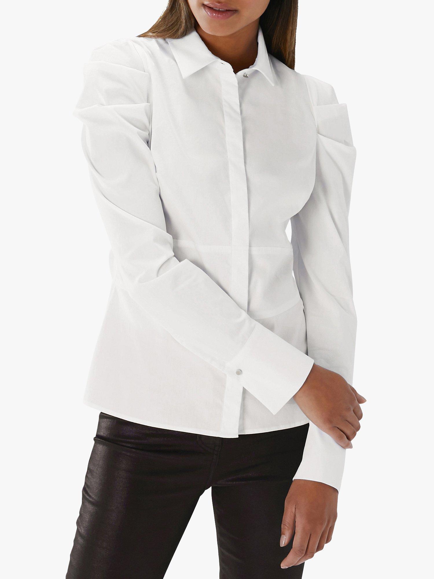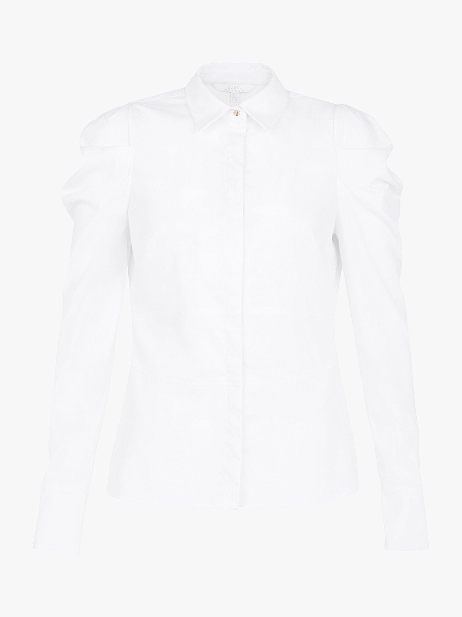 A refresh on the classic white shirt, it features gathered sleeves and a covered button up middle for a new season twist that looks chic and stylish with simple tailored jeans.