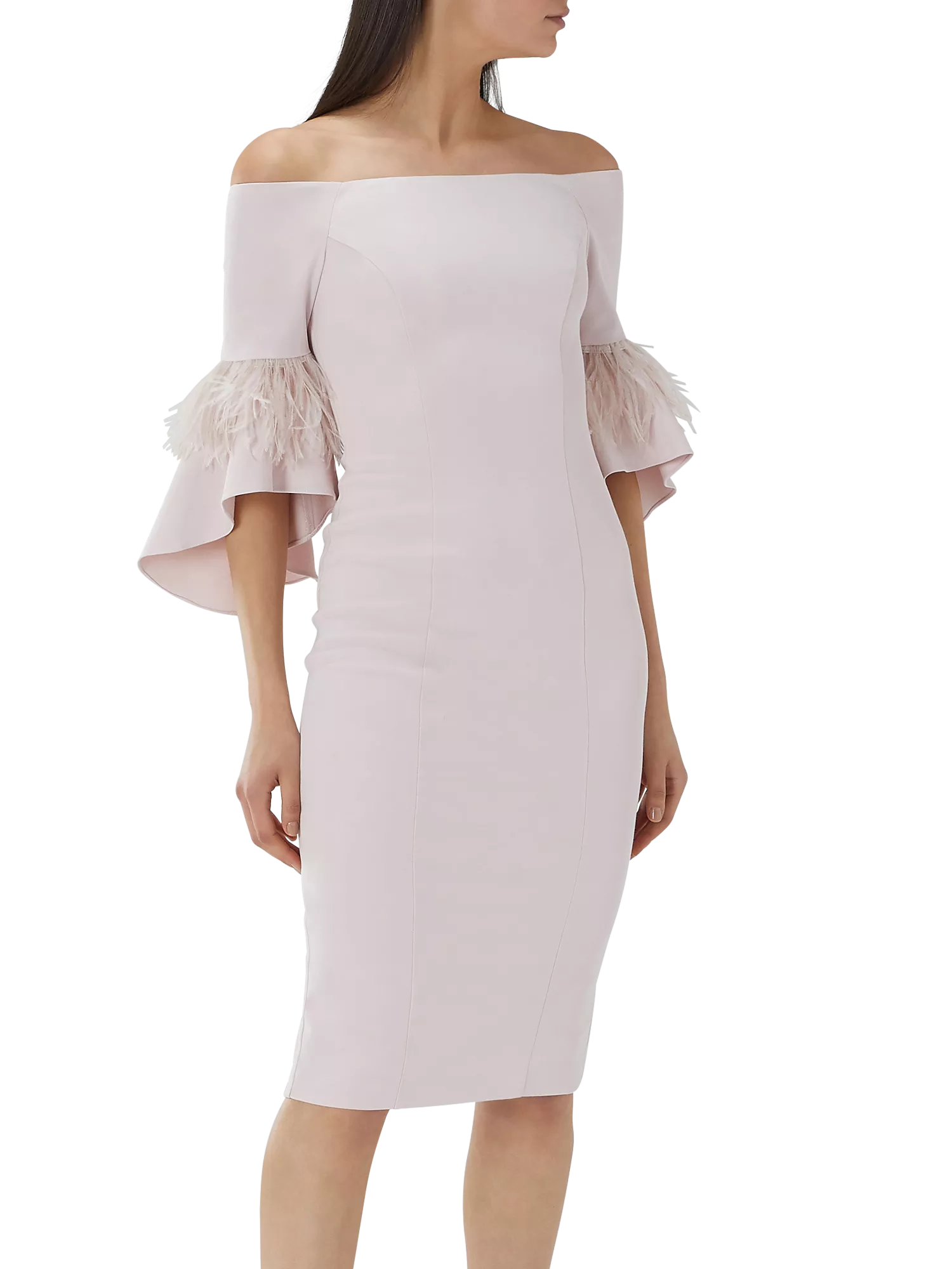 Designed for various special events, the dress is a true style statement. Its flattering bardot neckline, statement bell sleeves and feather details won't go unnoticed.