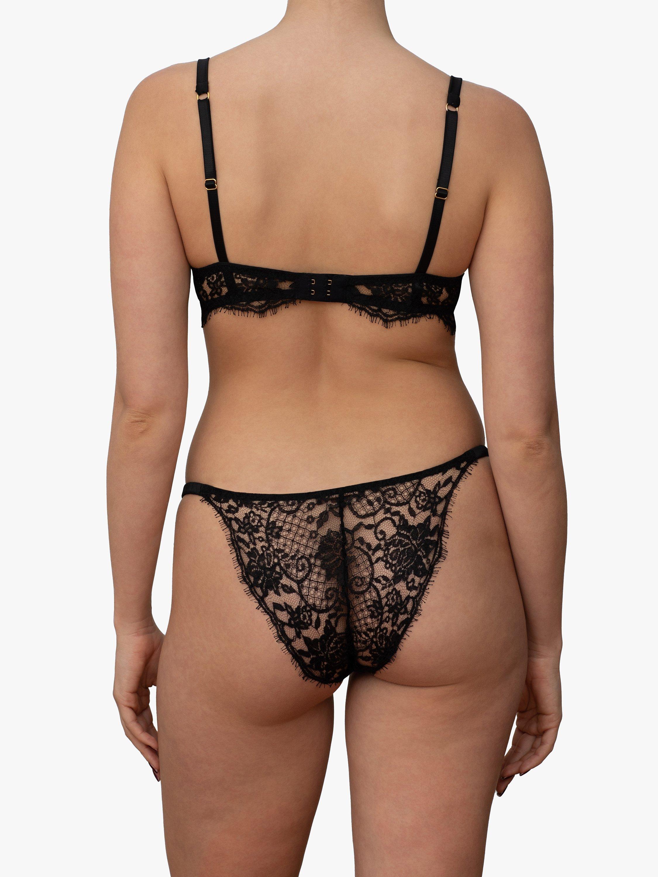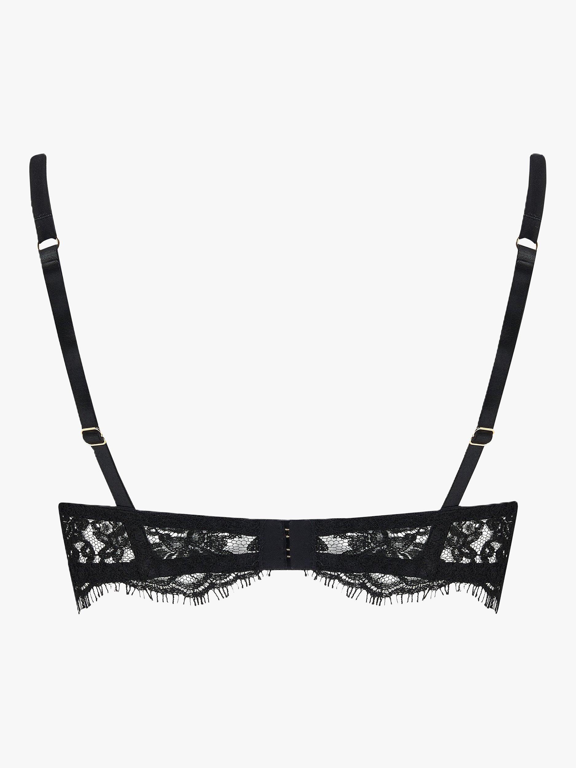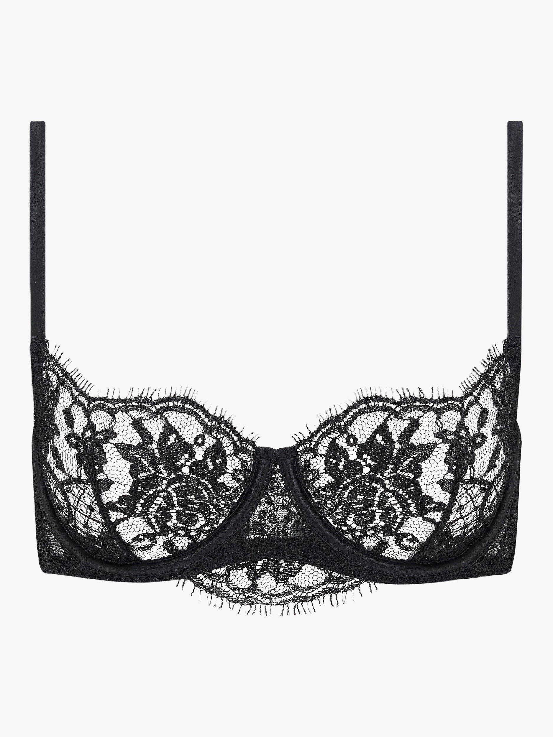 The Hera Balcony Bra is the epitome of iconic black lace lingerie. Designed meticulously, the intricacy of the lace is accentuated by the classic structure, creating the most flattering shape, with the eyelash scallop adding further delicacy. The adjustable silk straps are adorned with a double hook and eye fastening, ensuring seductive style without compromise on comfort.