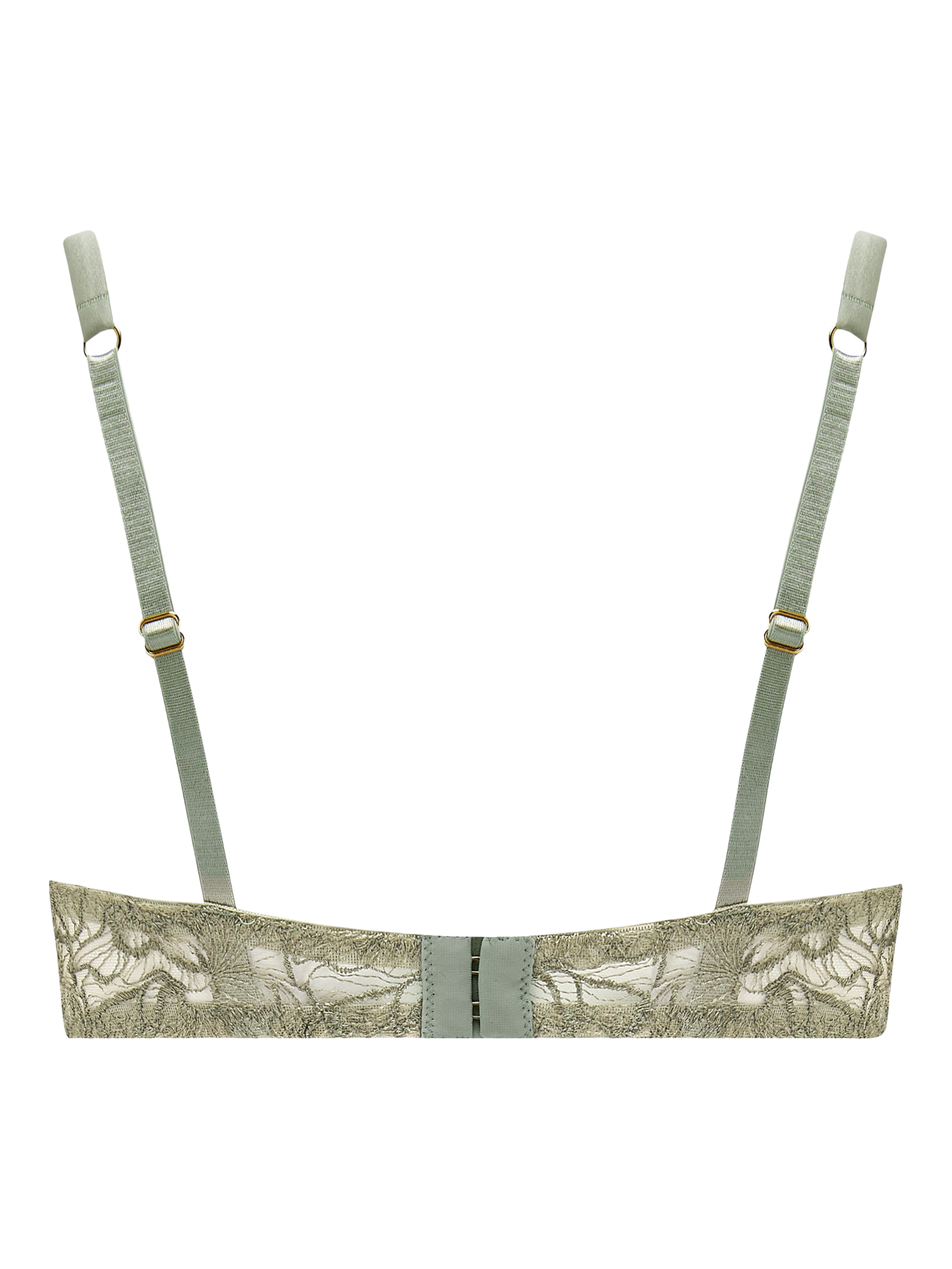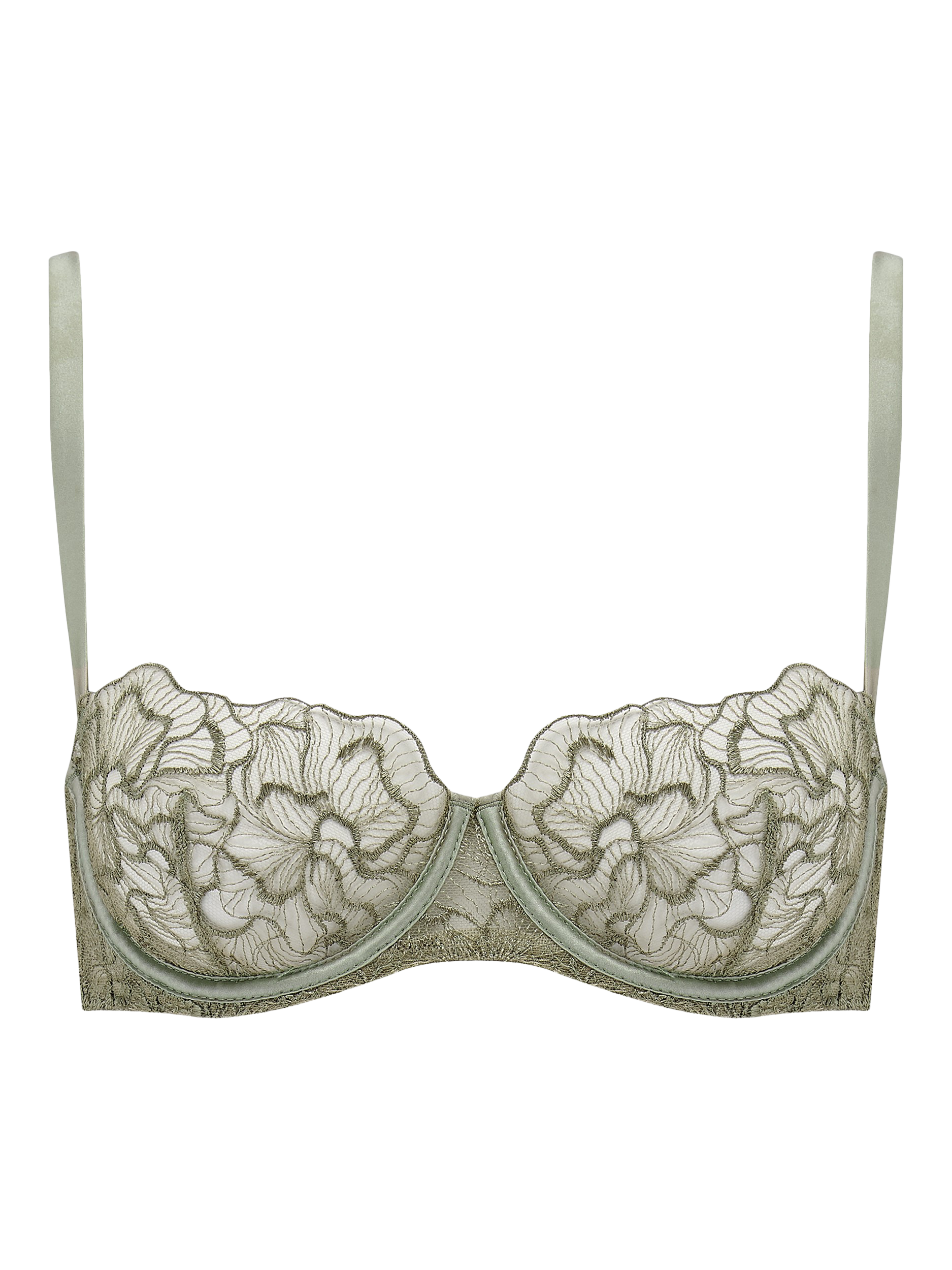 Tesselating flowers form the focus of this bespoke embroidery, the sumptuous sage shade adding further sophistication. A silk-cased underwire offers gentle structure to the modern feel of the half-cup shape, whilst the scalloped edge playfully graces the décolletage. The gentleness of the embroidery wraps around the band of the bra to give structure and grace, and the quiet luxury of the piece is finished with adjustable silk straps, a hook and eye closure and delicate golden hardware.