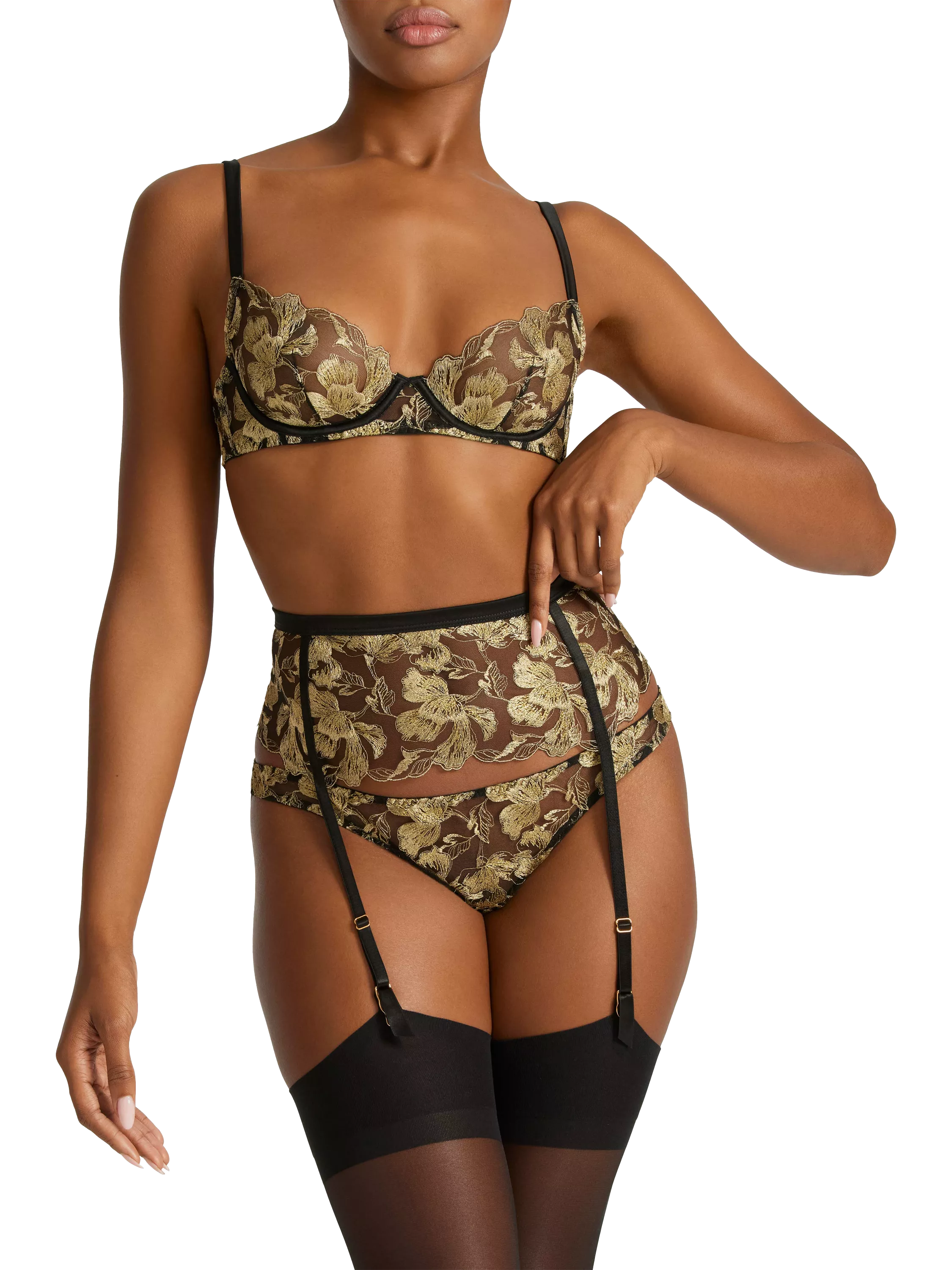 The bespoke black and gold embroidery gives it a truly majestic feel. The front of the knicker is a timeless clean cut, given extra comfort through soft elastication at the seams. Turning around, the scalloped embroidery grazes over the cheeks, concealing a silk gusset panel.