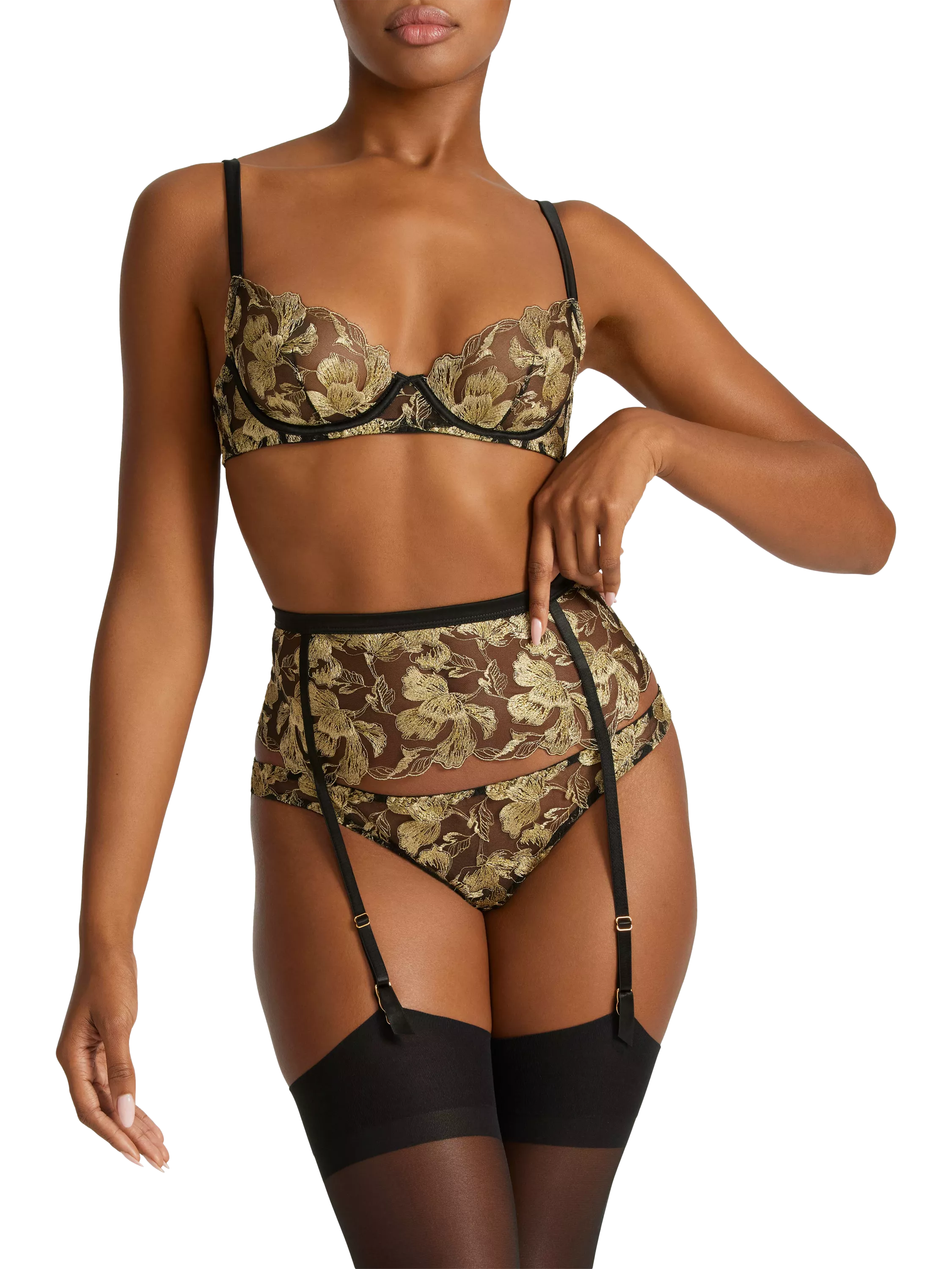 The bespoke botanical embroidery glides over the décolletage in a plunging silhouette, complimented by a silk-cased underwire. The vivacity of the golden embroidery blends perfectly with the simple strength of the jet-black silk. This style showcases a beautiful scalloped cup cut to lift and frame the breasts, wrapping around the body and fastening at the spine with a golden hook and eye. The piece is completed with silk-covered adjustable straps and golden hardware.