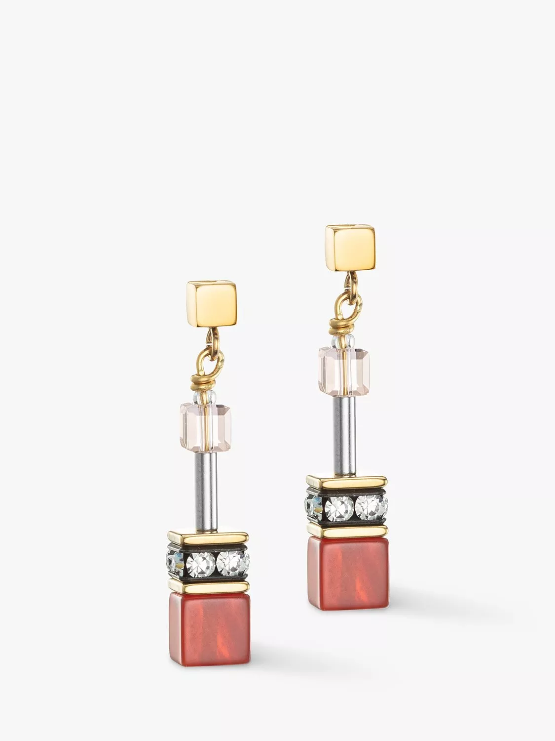 Falling into a simple yet elegant drop design, this pair of cube-shaped earrings from COEUR DE LION are accented in statement making carnelian, Swarovski crystals and rhinestone rondelles.