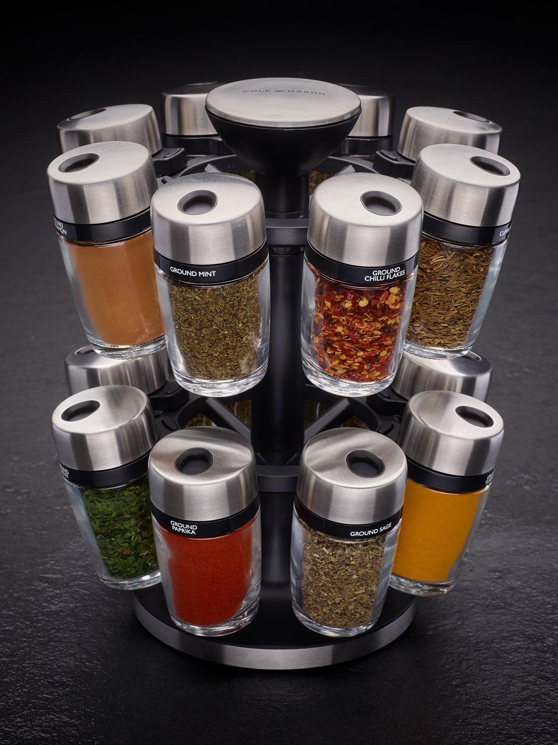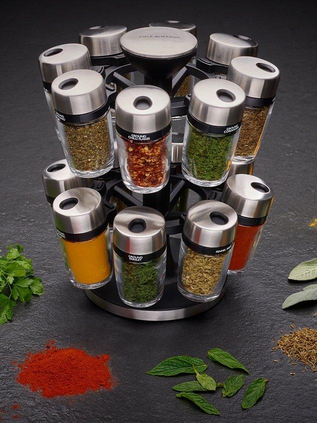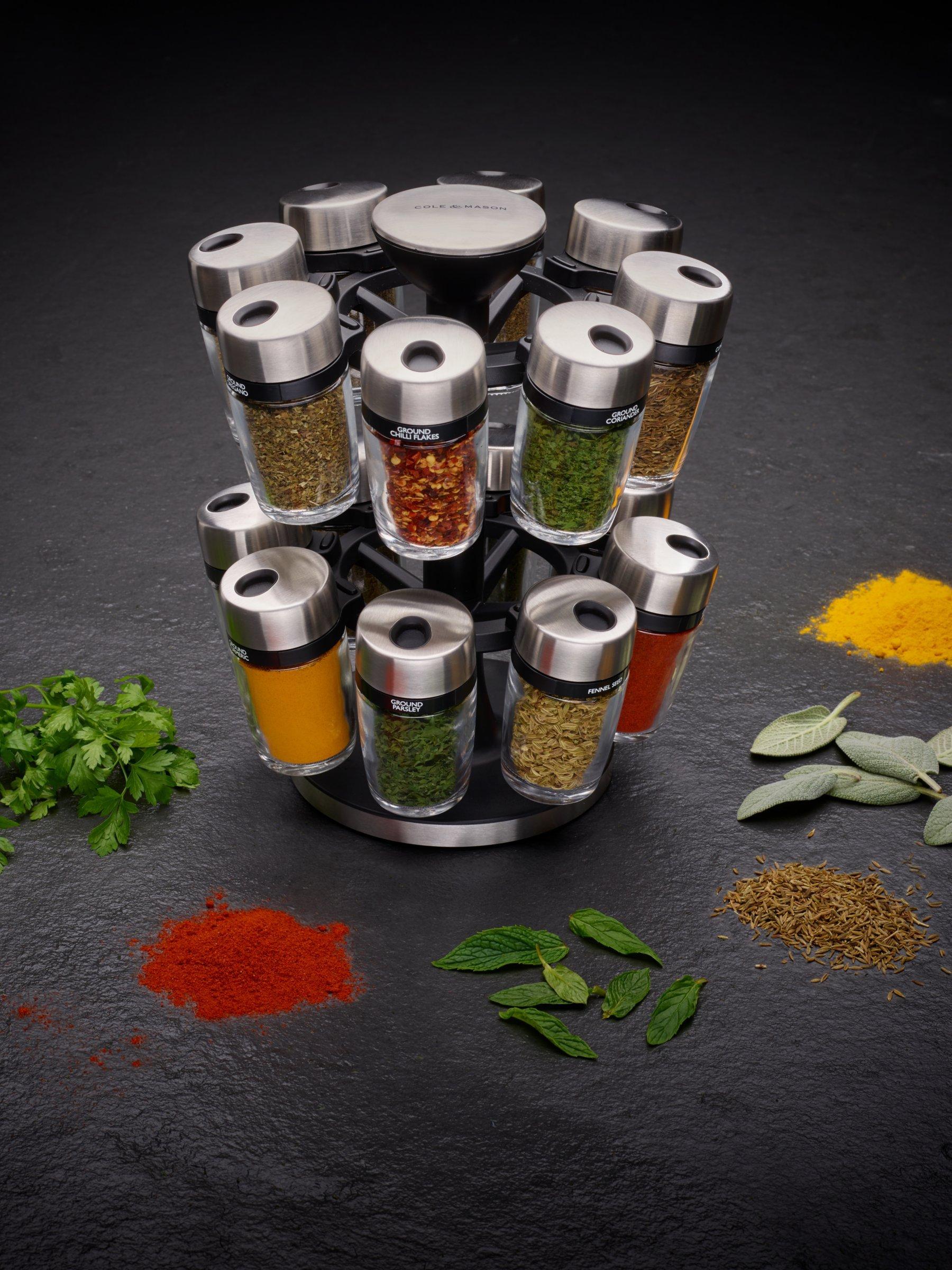 This filled spice rack from Cole & Mason allows you to efficiently combine a collection of your favourite flavours in the kitchen. The attractive glass jars are neatly suspended above the surface of the worktop for cleanliness, and it also features a handle on each side to conveniently transport it.