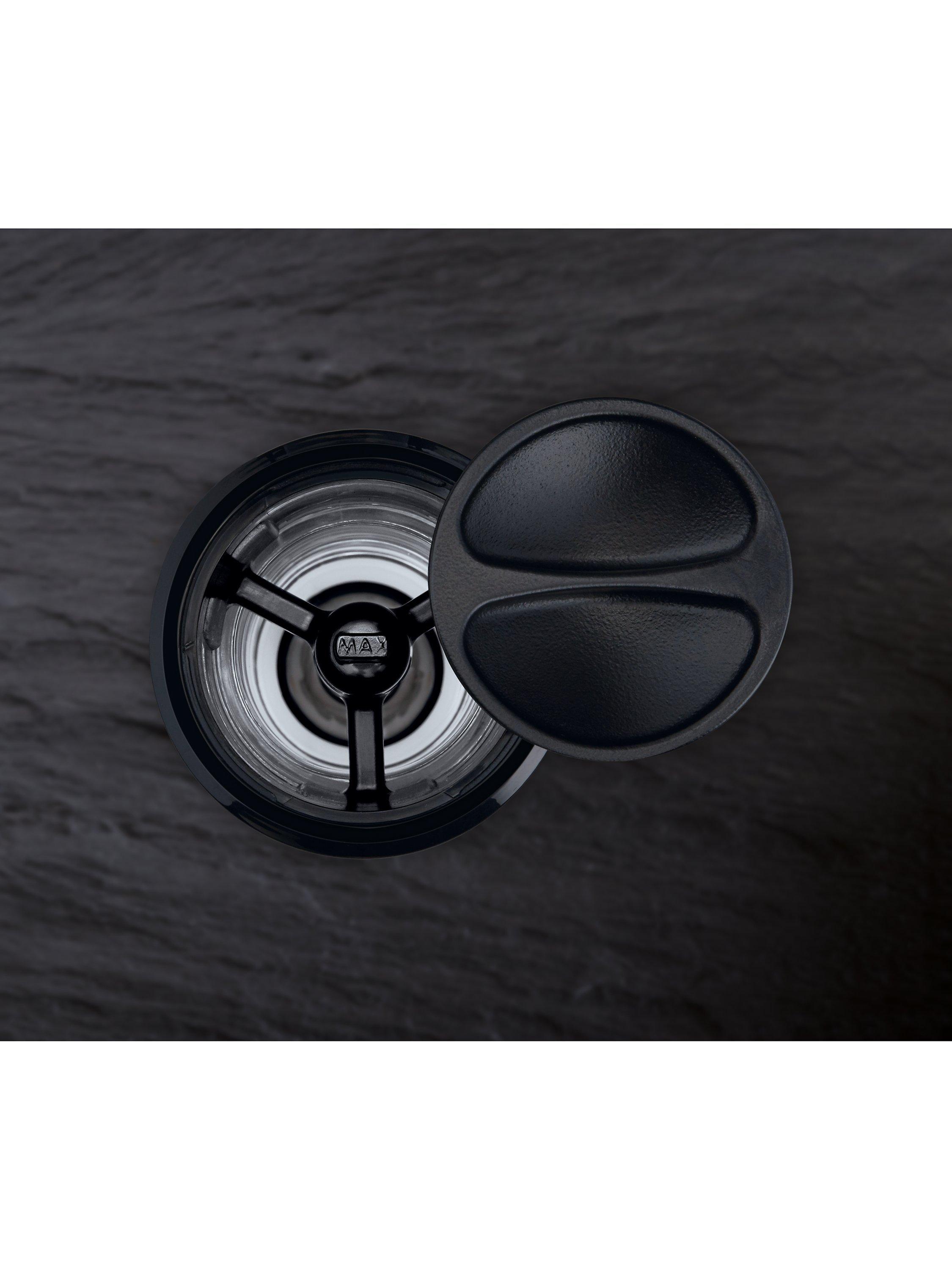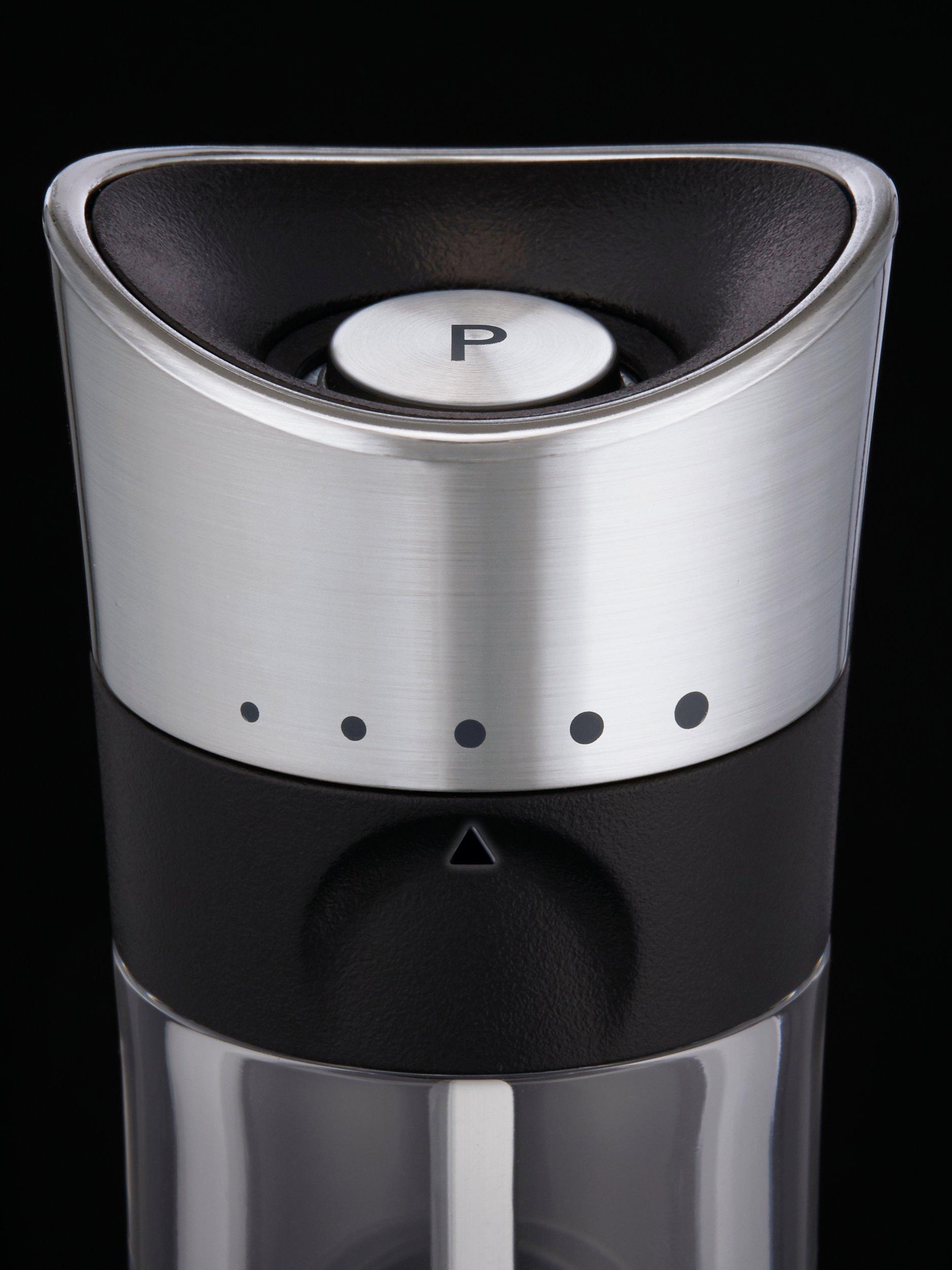 The premium chrome-finish mill has a modern shape and style meets function. It stands upside down to stop residue from being left behind on your table. The high-quality carbon steel grinding mechanism ensures the best output. To adjust the grind, simply twist the black textured band to move the arrow to line up with your preferred grind size.