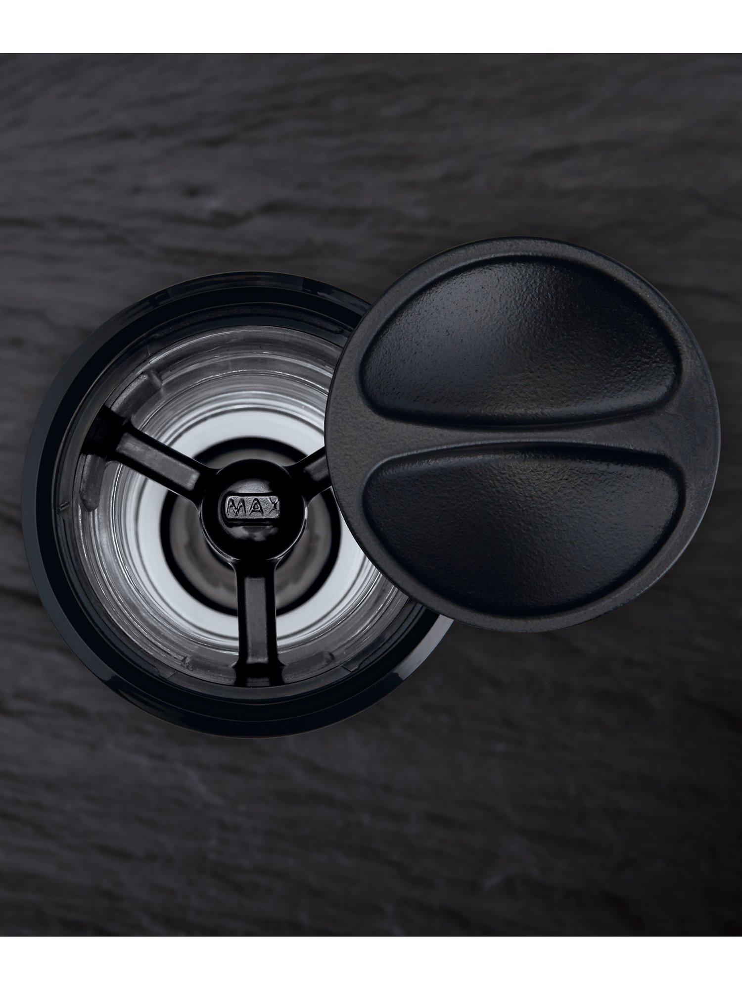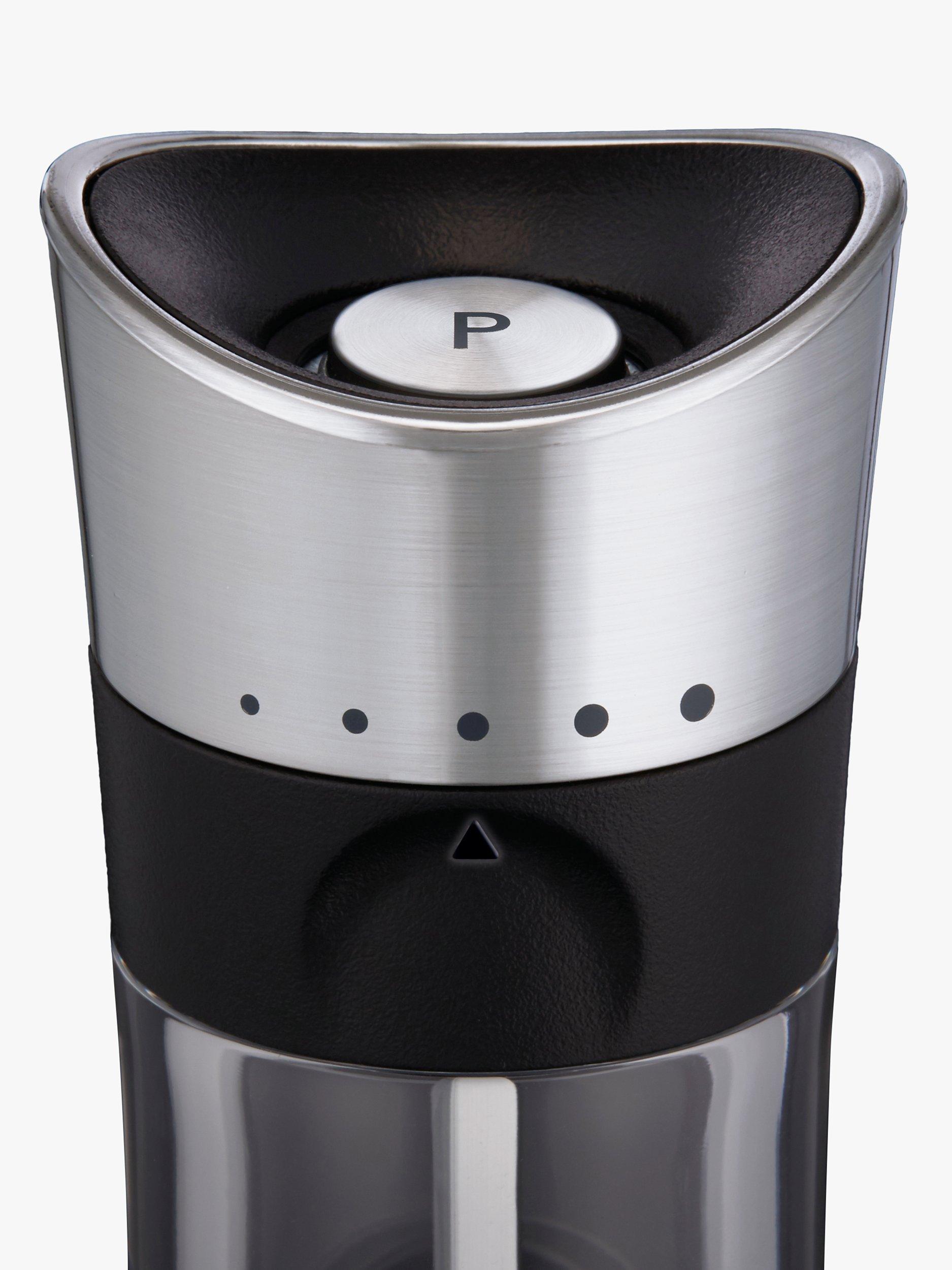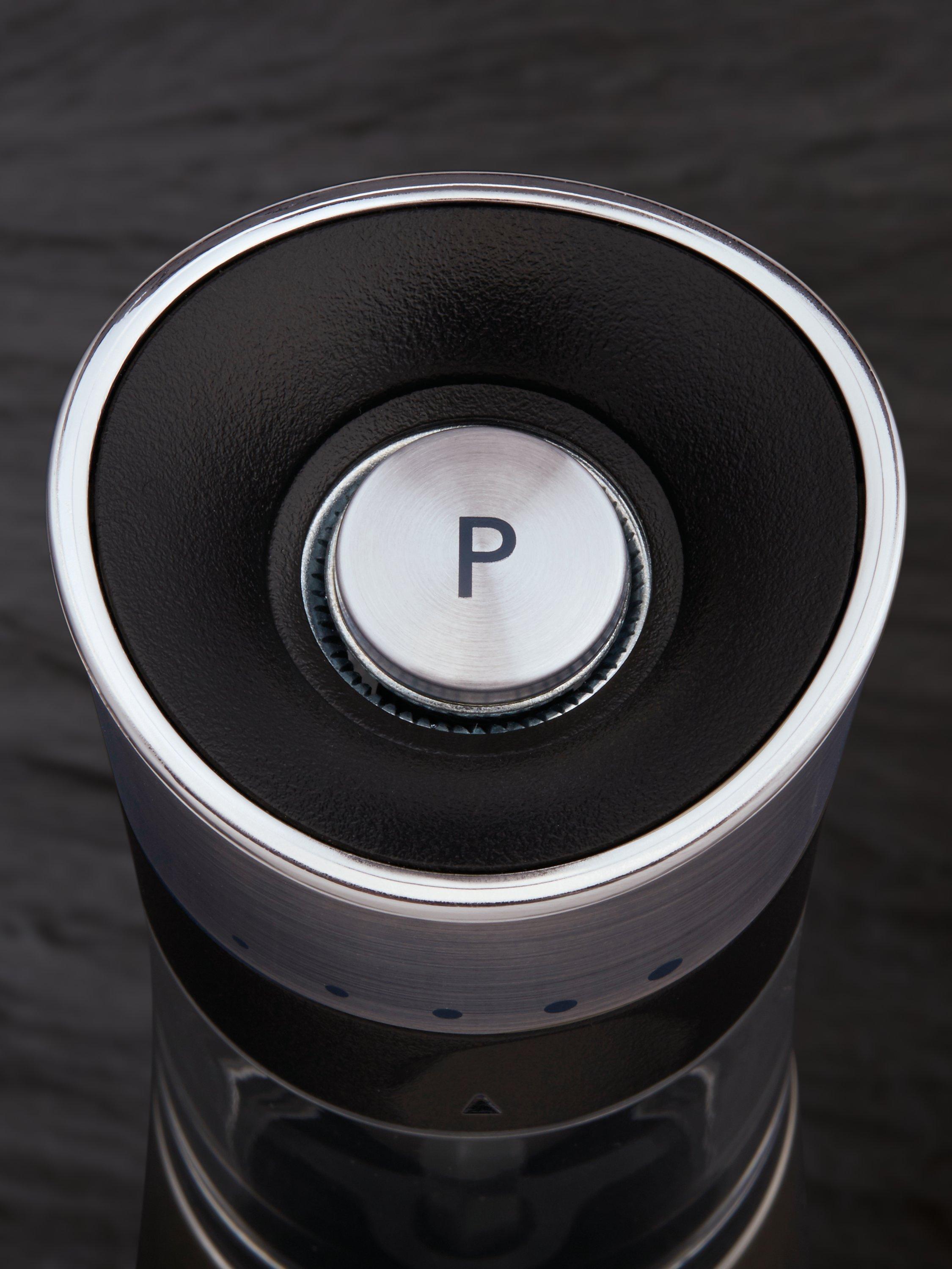 The premium chrome-finish mill has a modern shape and style meets function. The mill stands upside down to stop residue from being left behind on your table. The high-quality carbon steel grinding mechanism ensures the best output. To adjust the grind, simply twist the black textured band to move the arrow to line up with your preferred grind size.