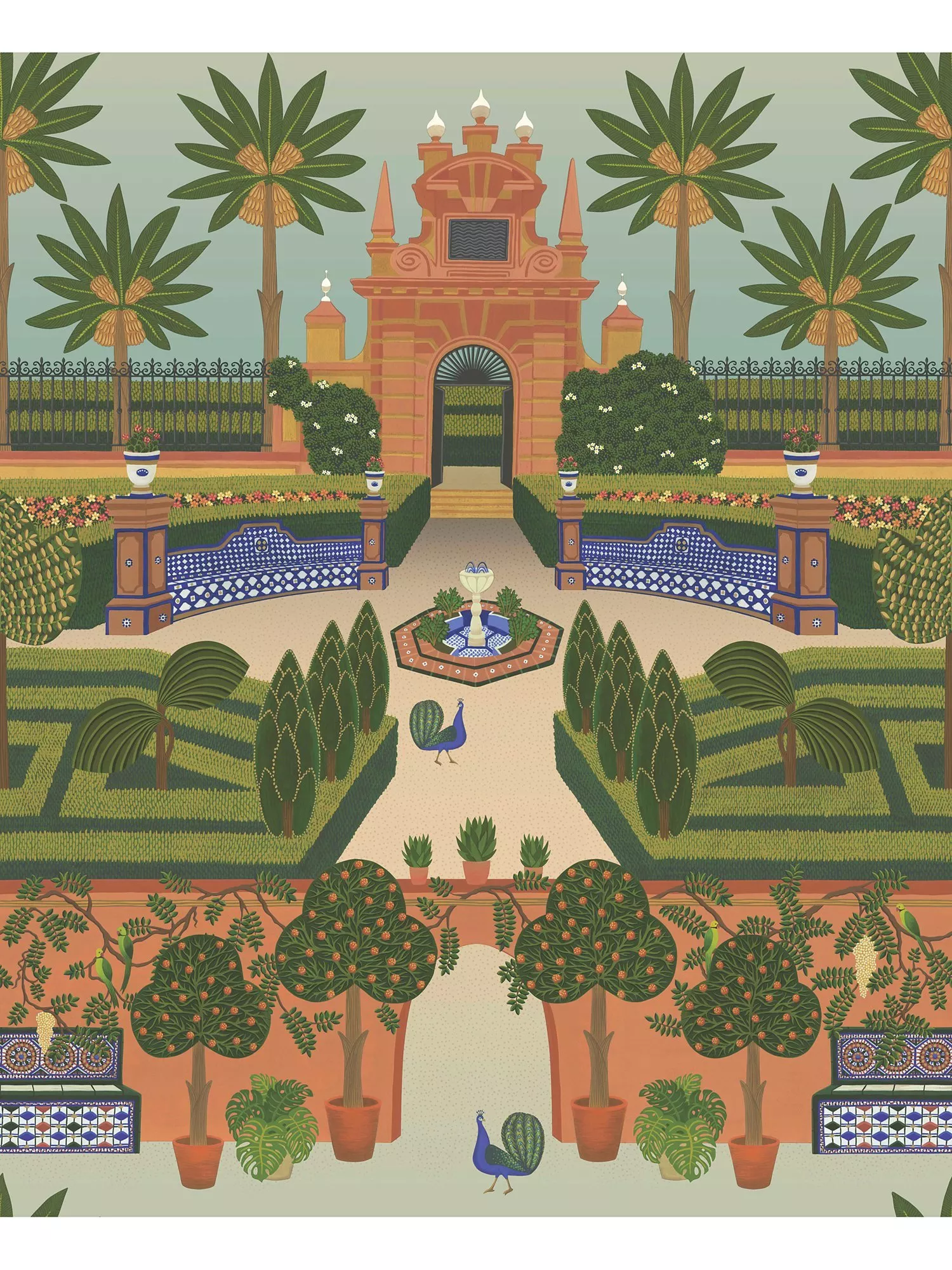 An enduring architectural icon of the city of Seville, the Real Alcázar is a stunning testament to a centuries-old blend of Mudéjar architecture and ornamentation. Now a UNESCO World Heritage Site, the Alcázar left an indelible impression on the Cole & Son design studio, leading to this fantastical interpretation of the fortress palace s gardens. Illustrative and pictorial in style, it is a unique artwork piece presented in a classic Terracotta & Spring Green Multicolour palette.