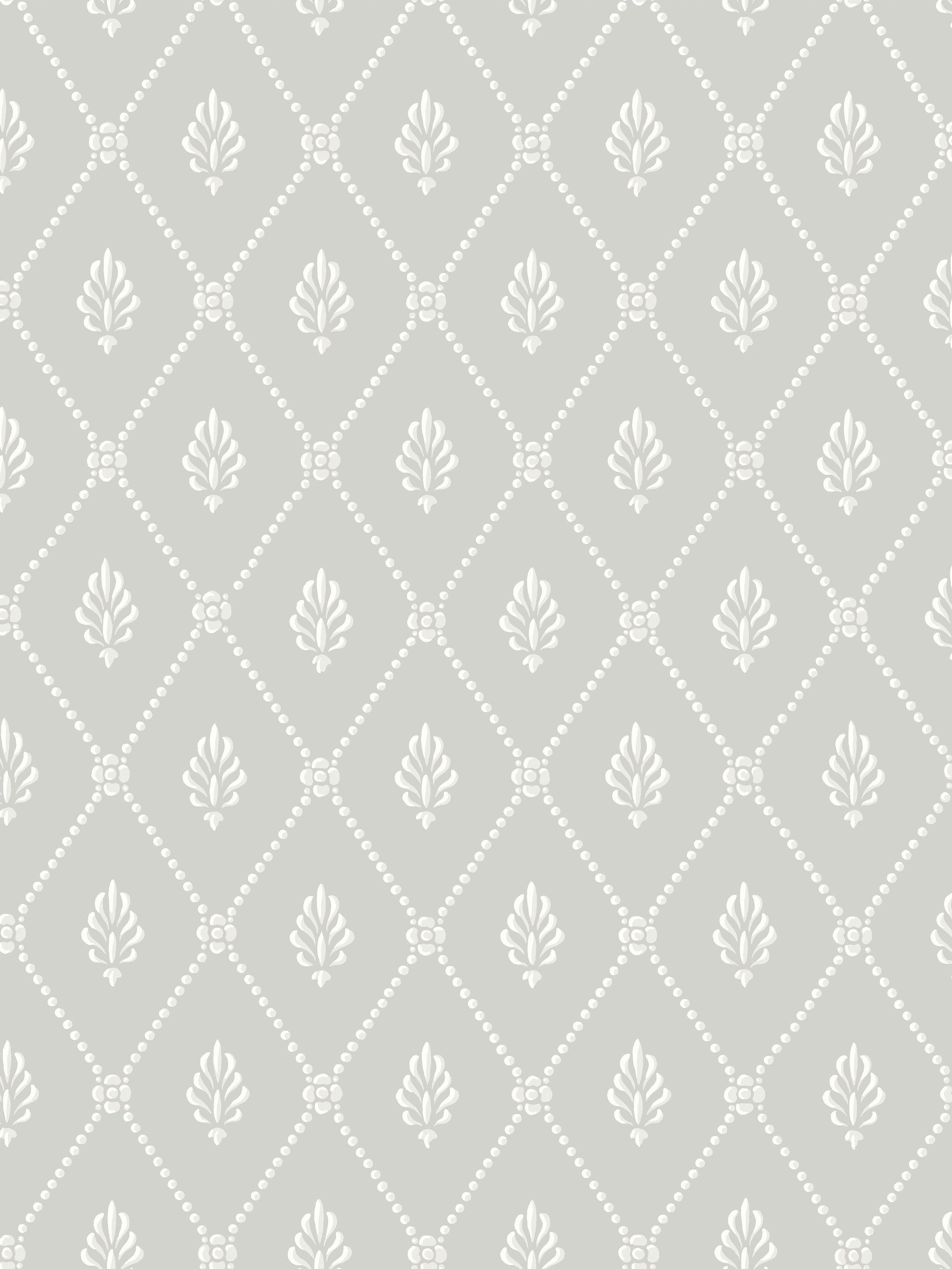 A small-scale diamond trellis enclosing a simple sprig leaf motif.