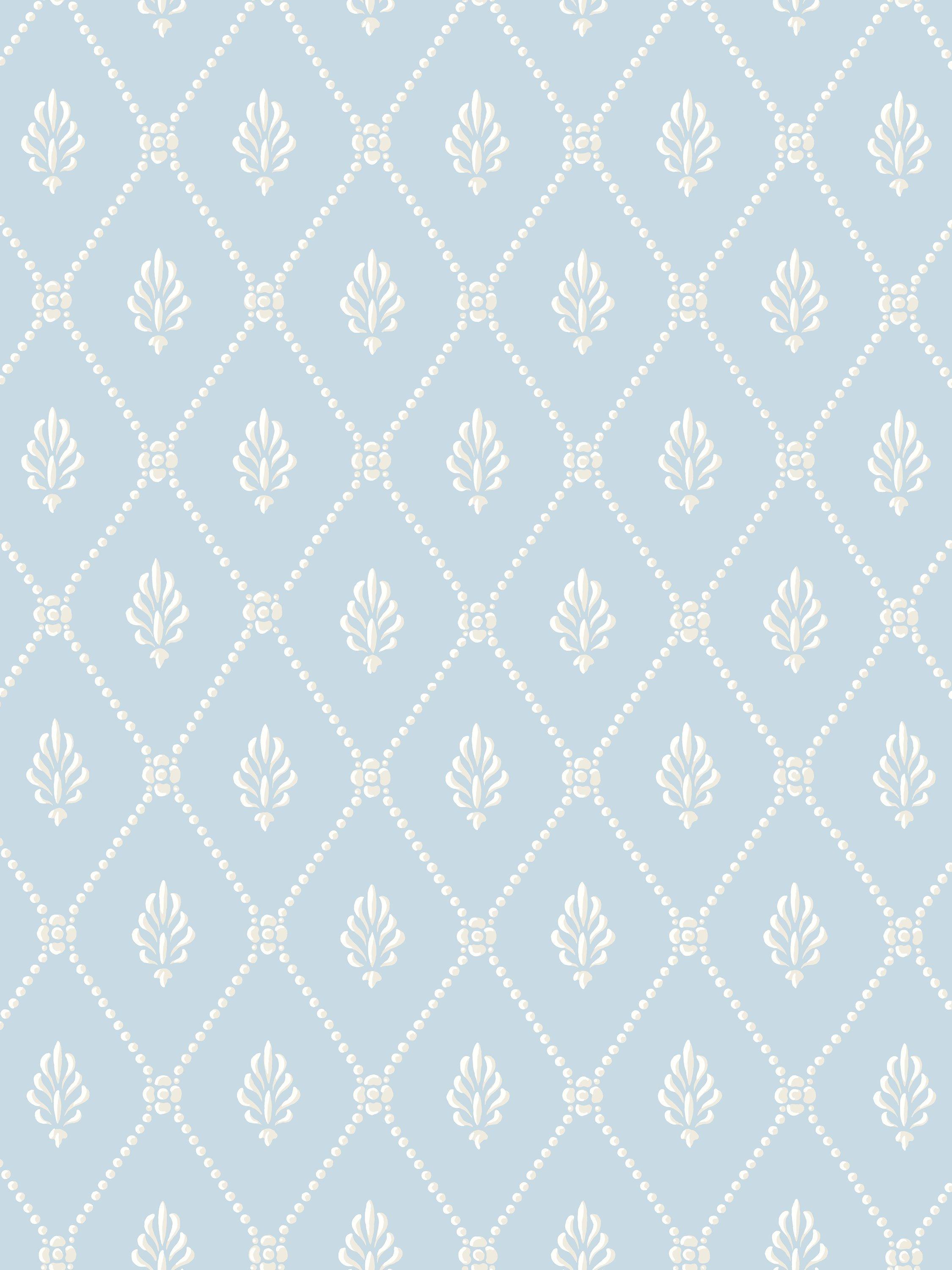 A small-scale diamond trellis enclosing a simple sprig leaf motif.