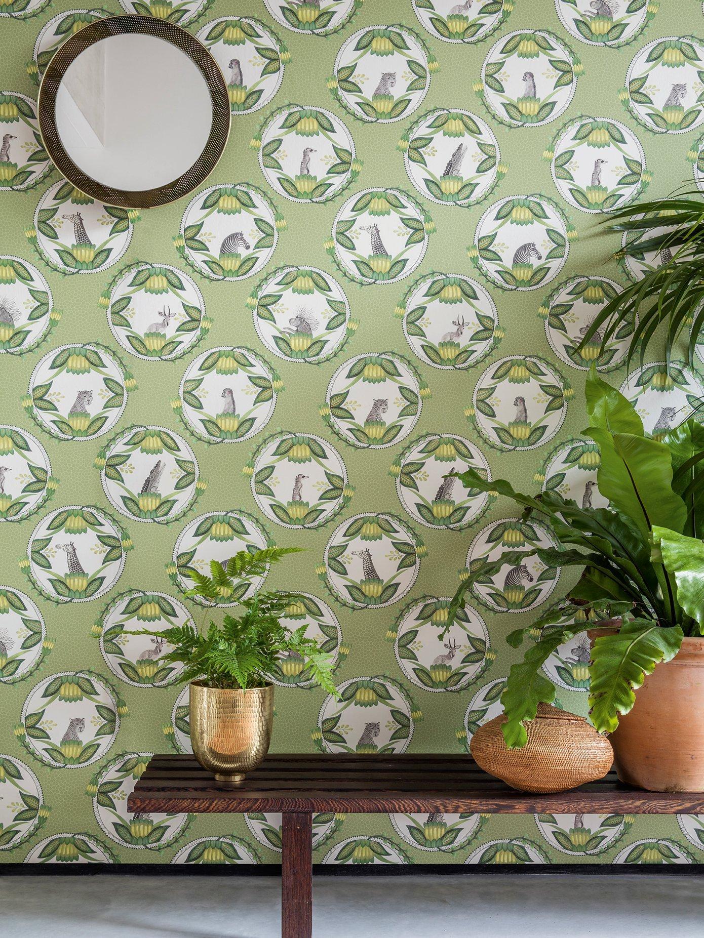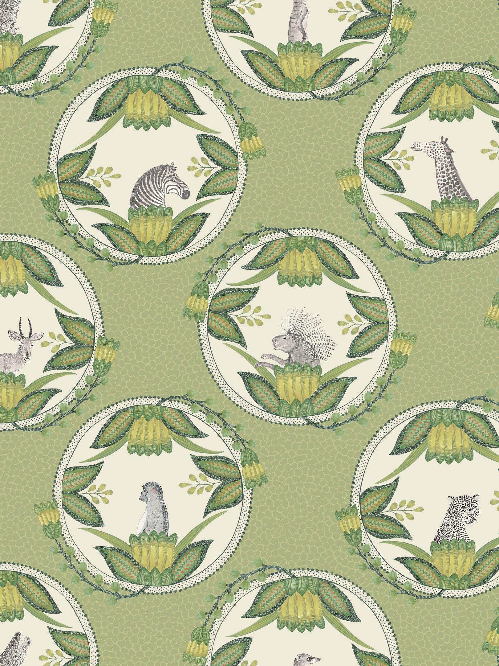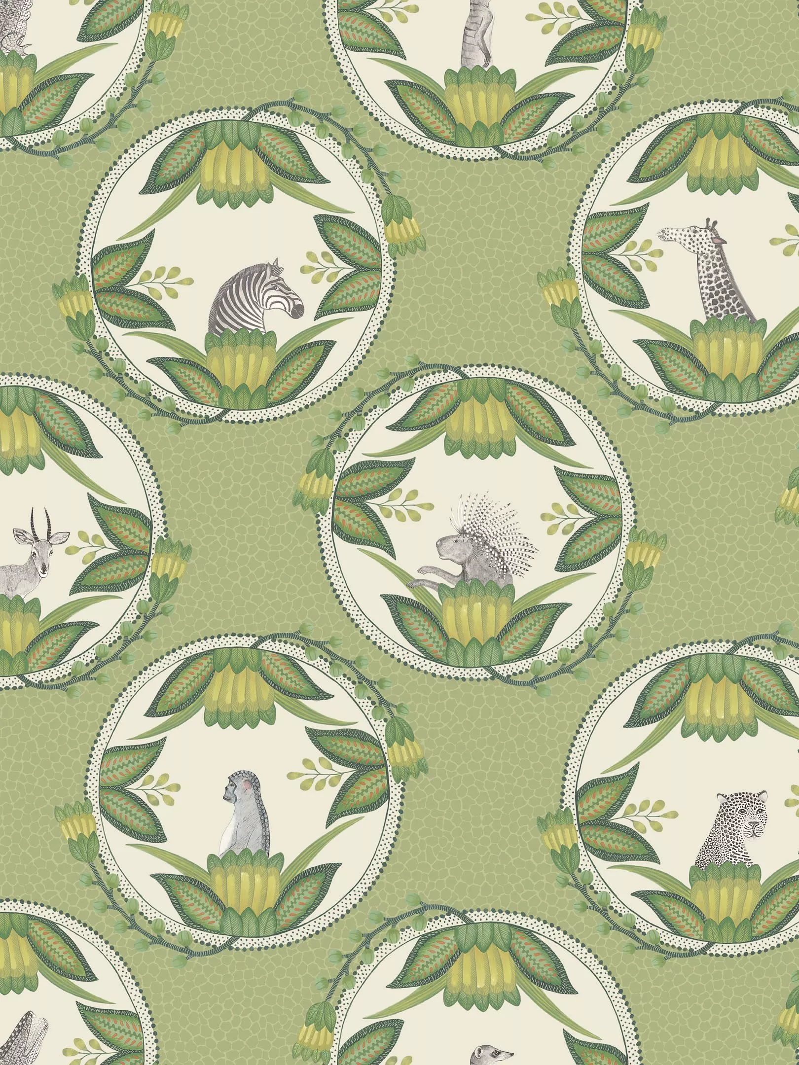 Ardmore Cameos is a very personal representation of a series of plates which were created originally as a wedding gift. Each animal portrait, including a rather haughty zebra and a quizzical leopard is set against a backdrop of softly drawn giraffe spots in this delightful cartouche wallpaper.