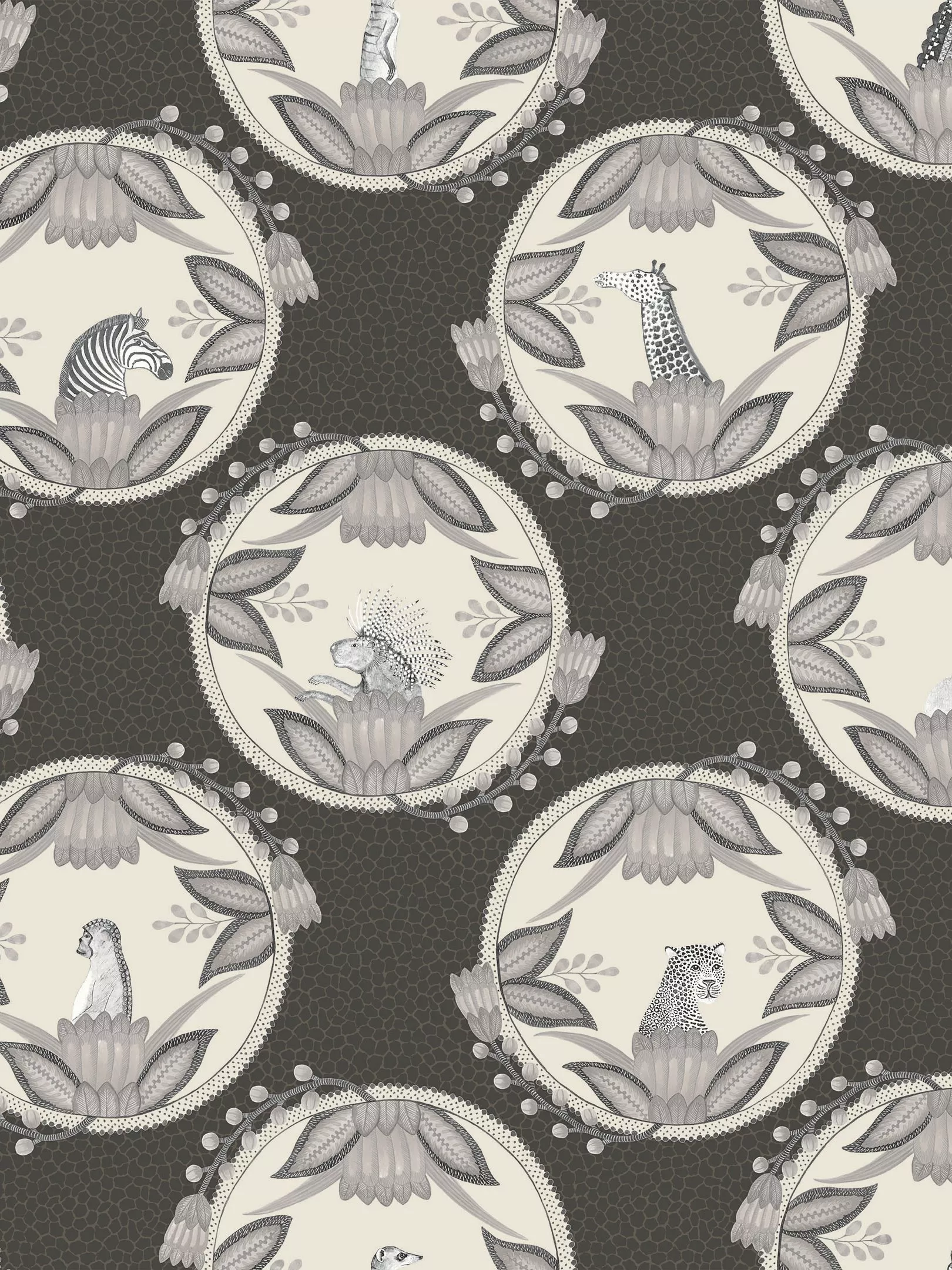 Ardmore Cameos is a very personal representation of a series of plates which were created originally as a wedding gift. Each animal portrait, including a rather haughty zebra and a quizzical leopard is set against a backdrop of softly drawn giraffe spots in this delightful cartouche wallpaper.