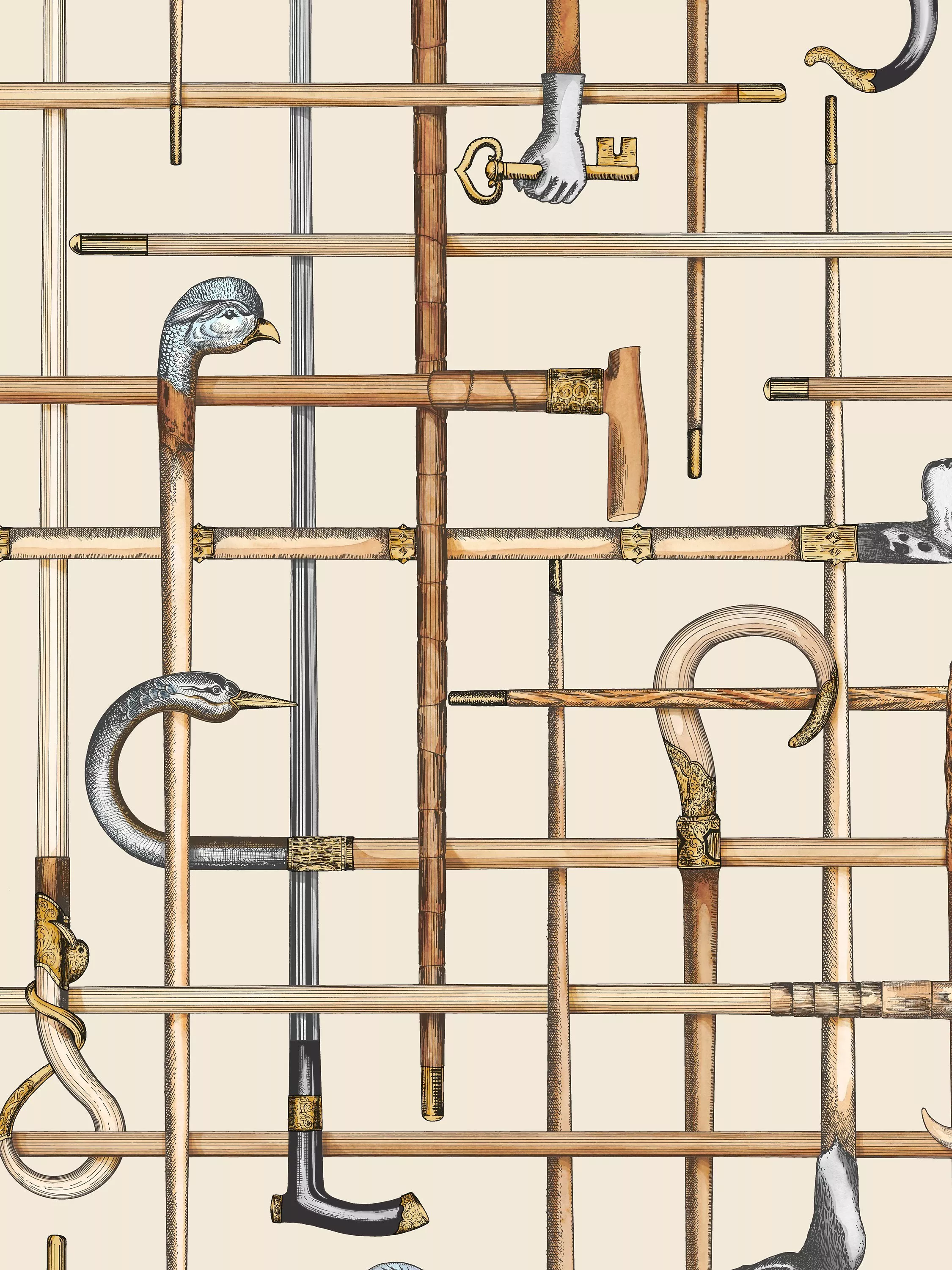 Originating as a silk scarf print from the 1940s, the canes of Bastoni reflect the eclectic nature of the house of Fornasetti, brimming with umbrella and hat stands full of antique walking canes.