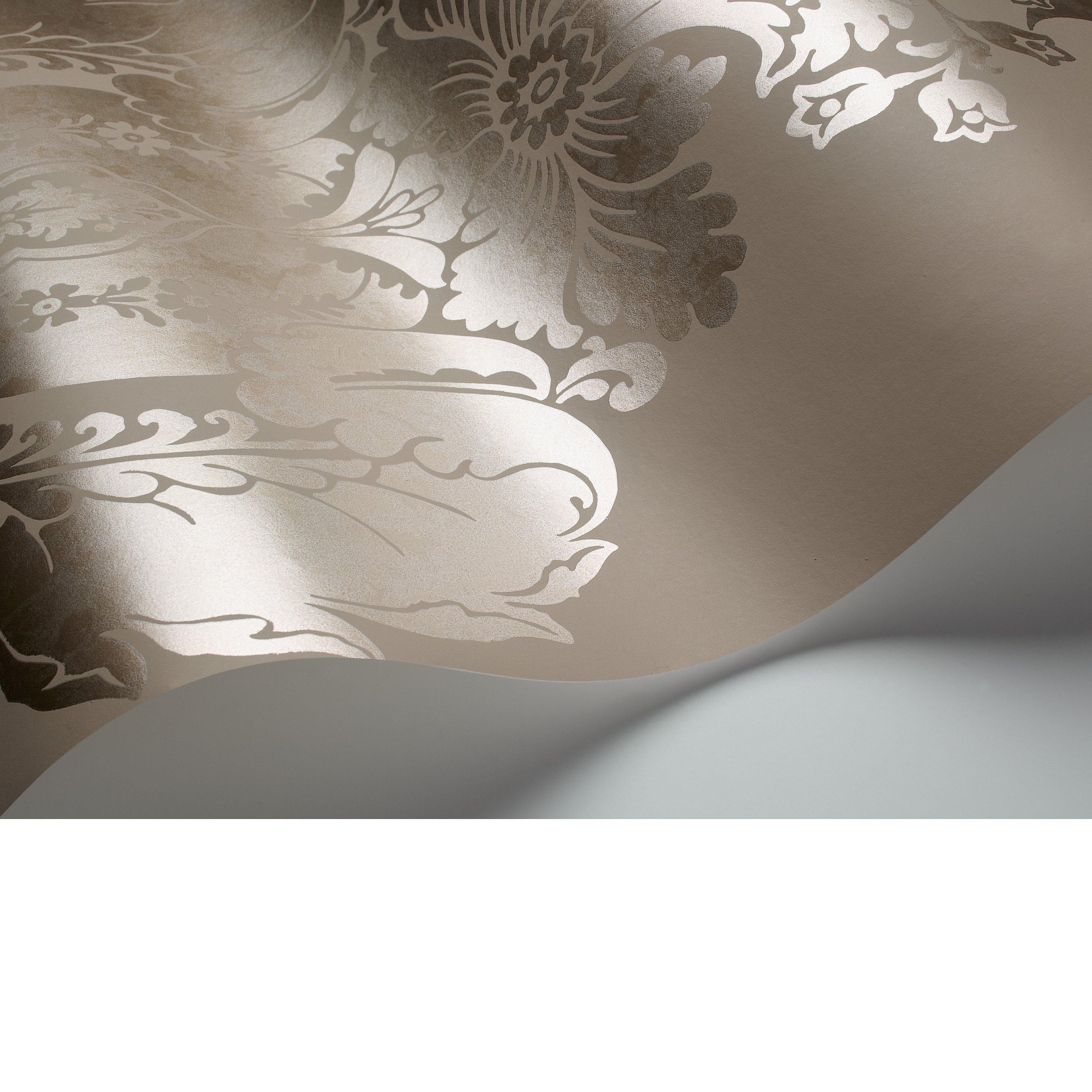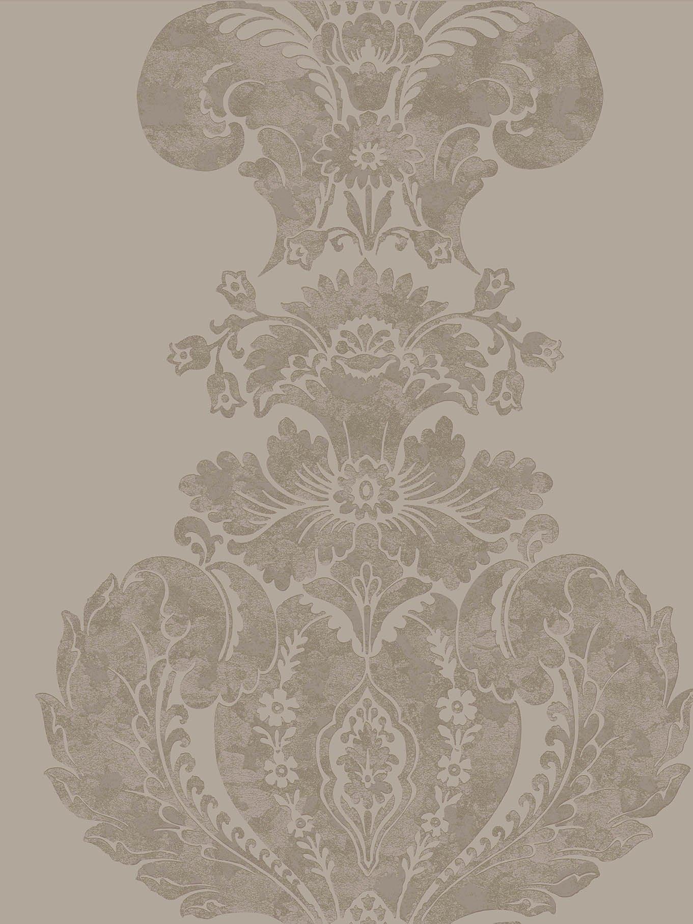 The print references the fashion for gilding with ornamental gold leaf and other precious metals. This elegant wallpaper pattern of feathered plumes is designed as a panel and features burnished metallics on a range of neutral grounds. Available in five colourways including linen with gold, mole with silver, black with bronze, ivory with white, and grey with silver.