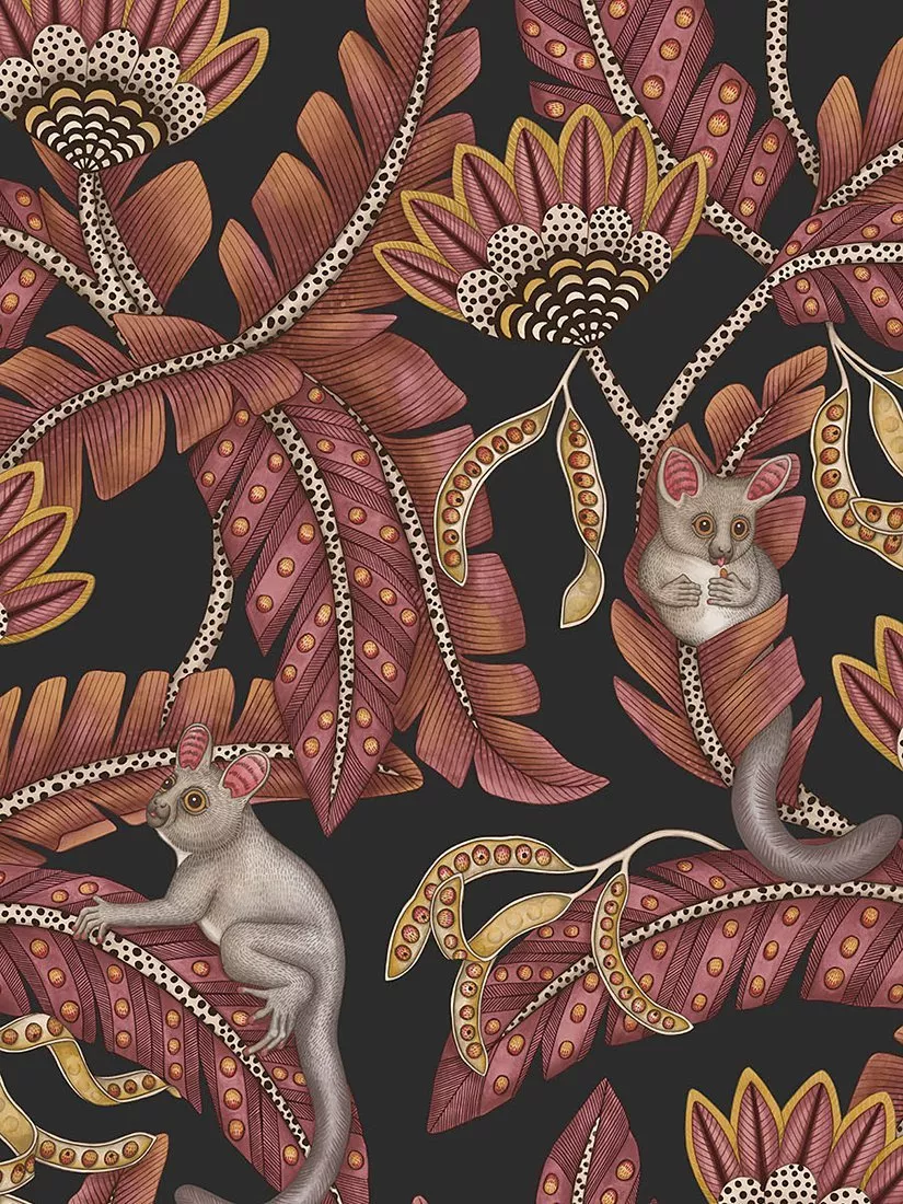 Adorable bush babies perch among luscious leaves in this paste the wall wallpaper.