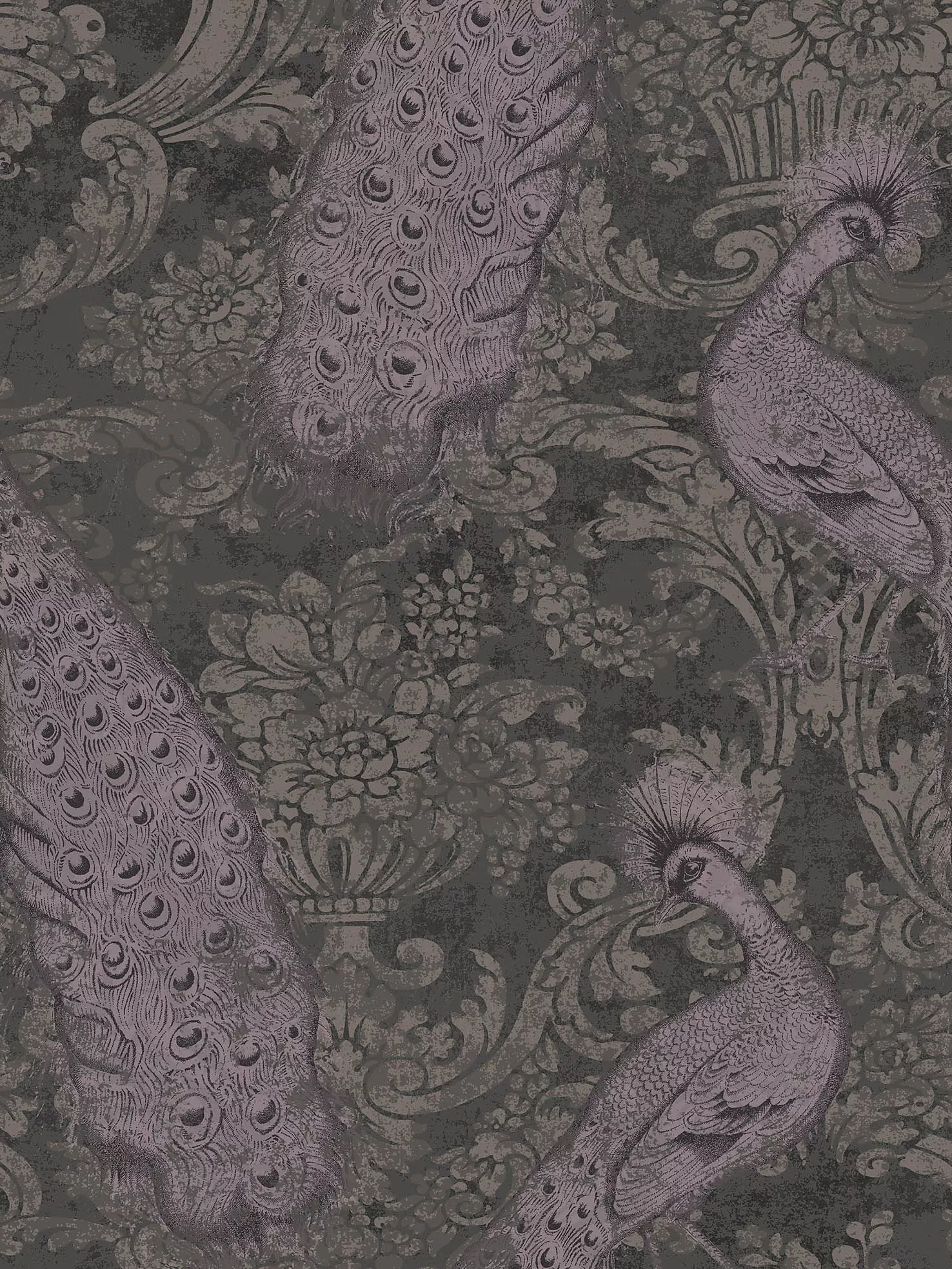 An elegant damask wallpaper featuring gilded peacocks in precious mineral hues of emerald, copper, teal, pewter and graphite. Inspired by the Victorian love of ornamental birds, the print is opulent and exotic. Available in six colourways of teal, amethyst, charcoal, silver, pewter and gold.