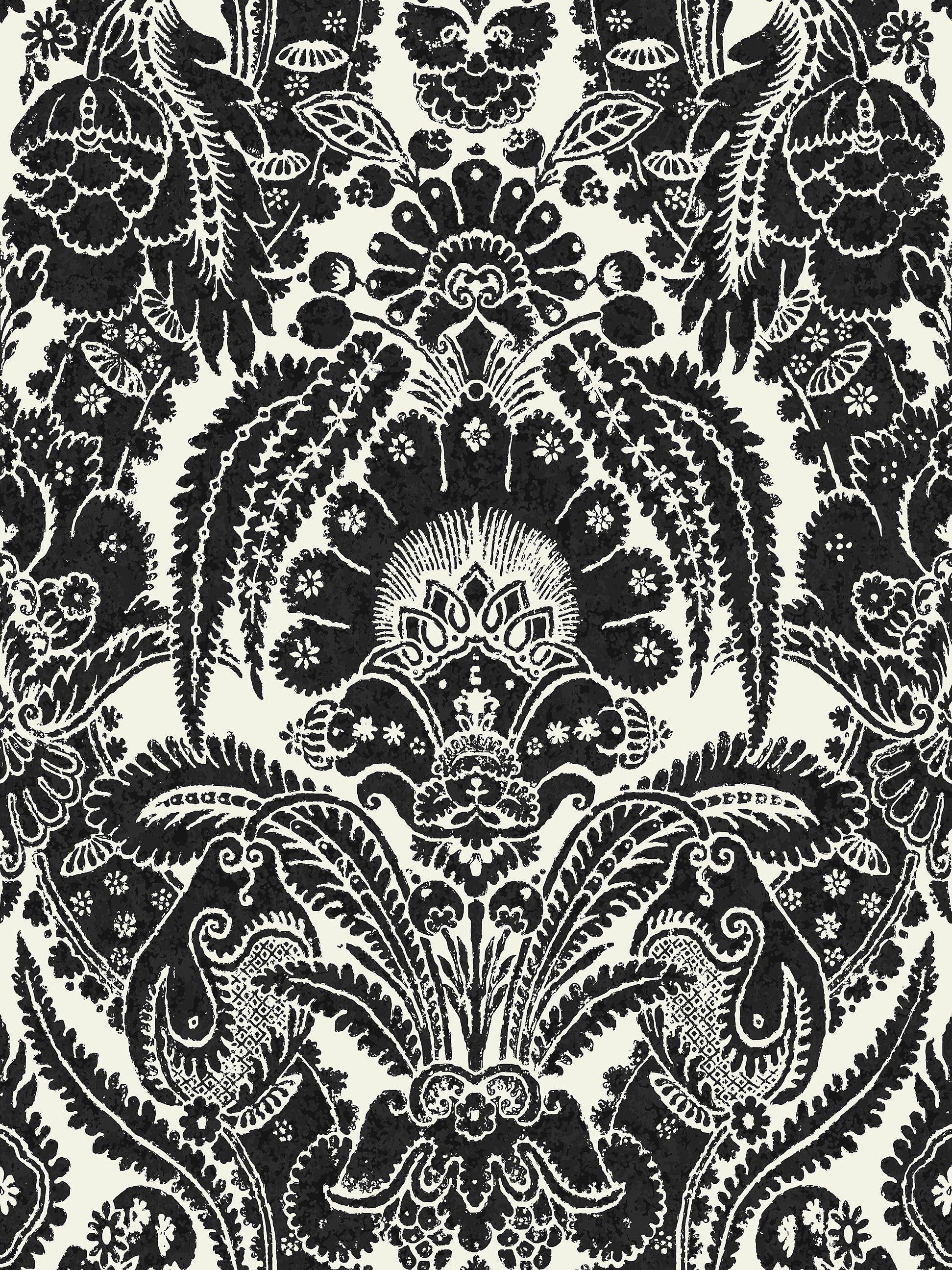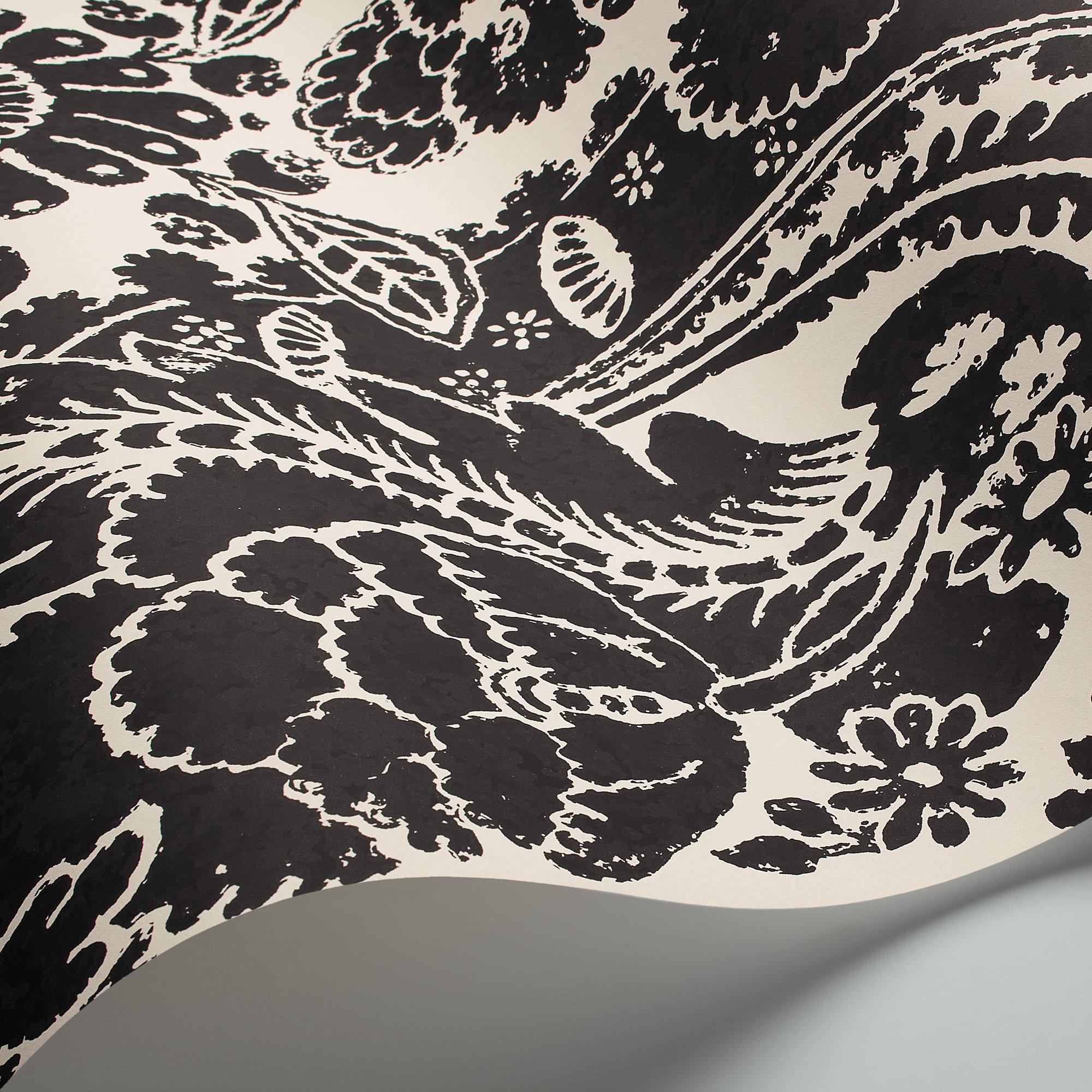 An extra wide width wallpaper (68.5cm) featuring decorative fern leaves and exotic fruits printed in cool chalky hues of white and stone on coloured grounds. The pattern is based on an old Cole & Son archive design, re-coloured and re-invented for the contemporary interior. Available in of shell, linen, black, pale blue, blue and yellow.