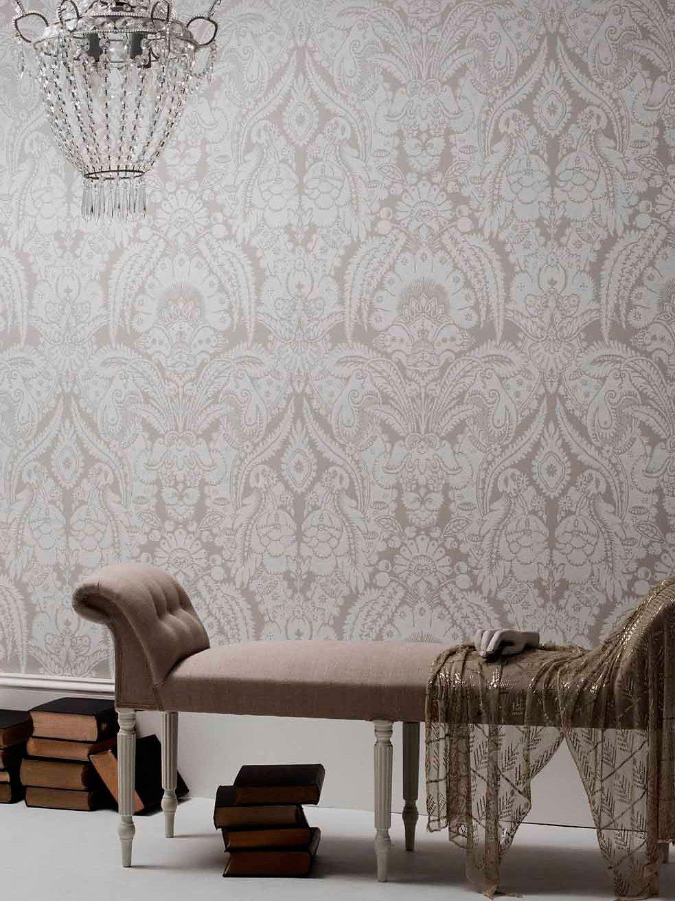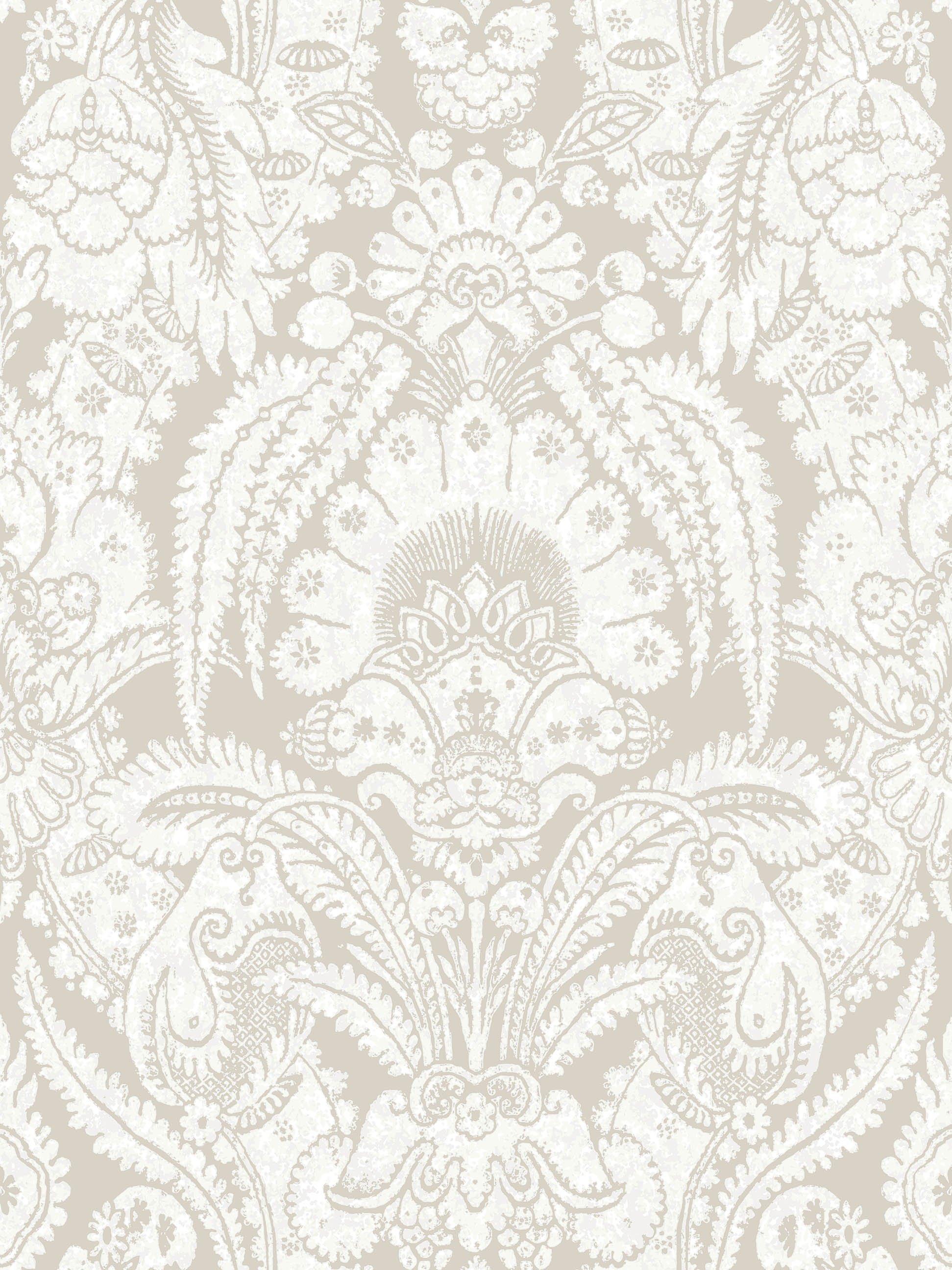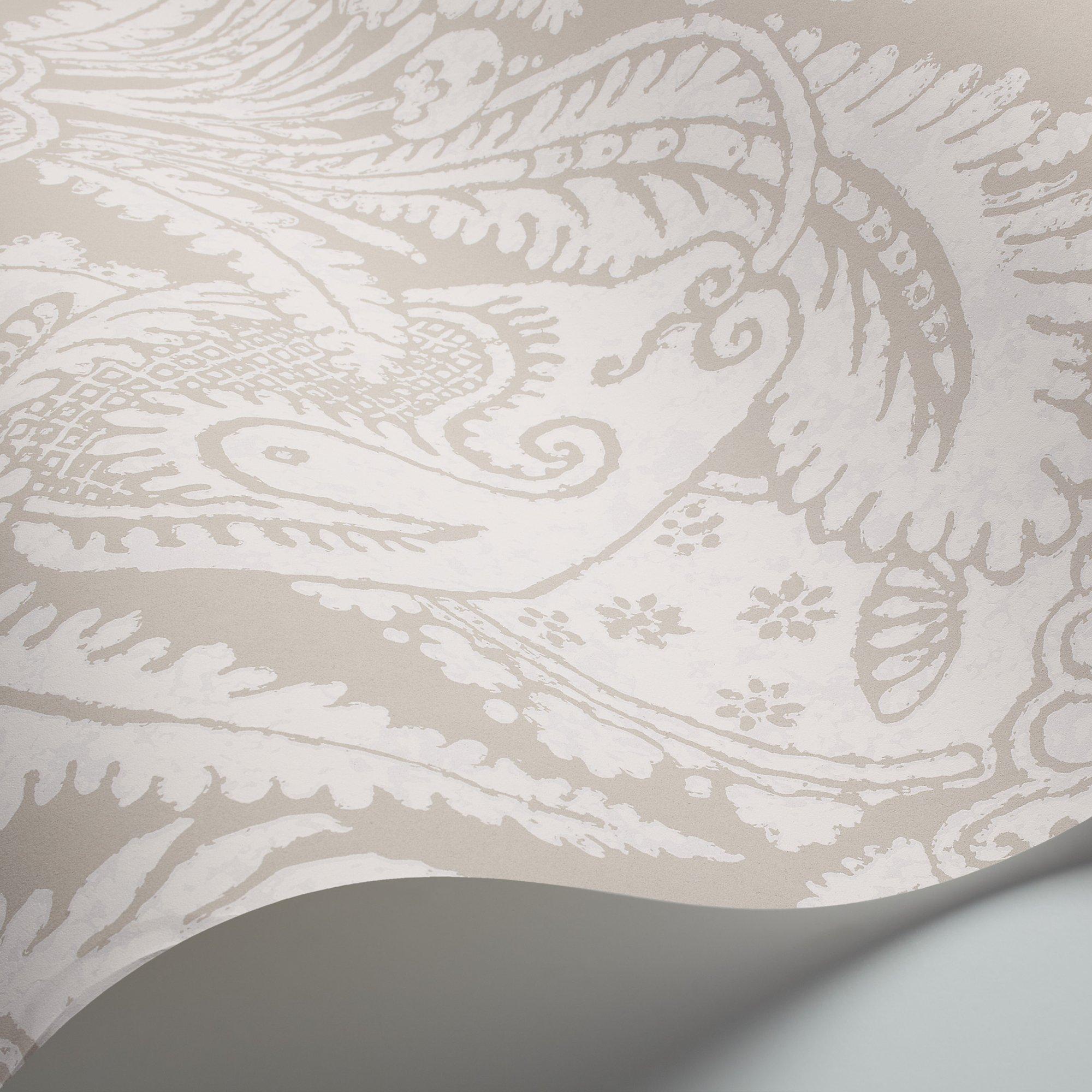 An extra wide width wallpaper (68.5cm) featuring decorative fern leaves and exotic fruits printed in cool chalky hues of white and stone on coloured grounds. The pattern is based on an old Cole & Son archive design, re-coloured and re-invented for the contemporary interior. Available in of shell, linen, black, pale blue, blue and yellow.