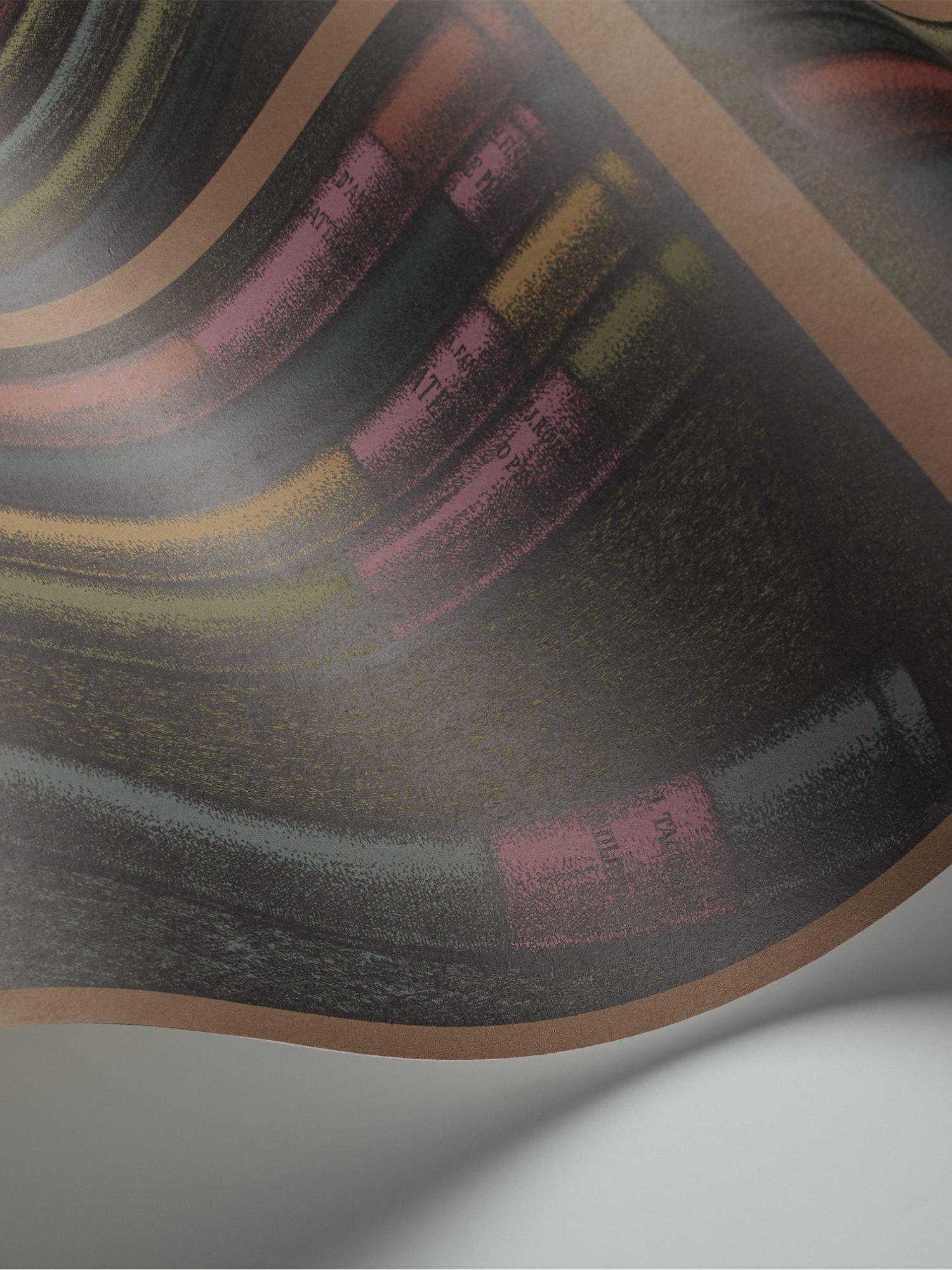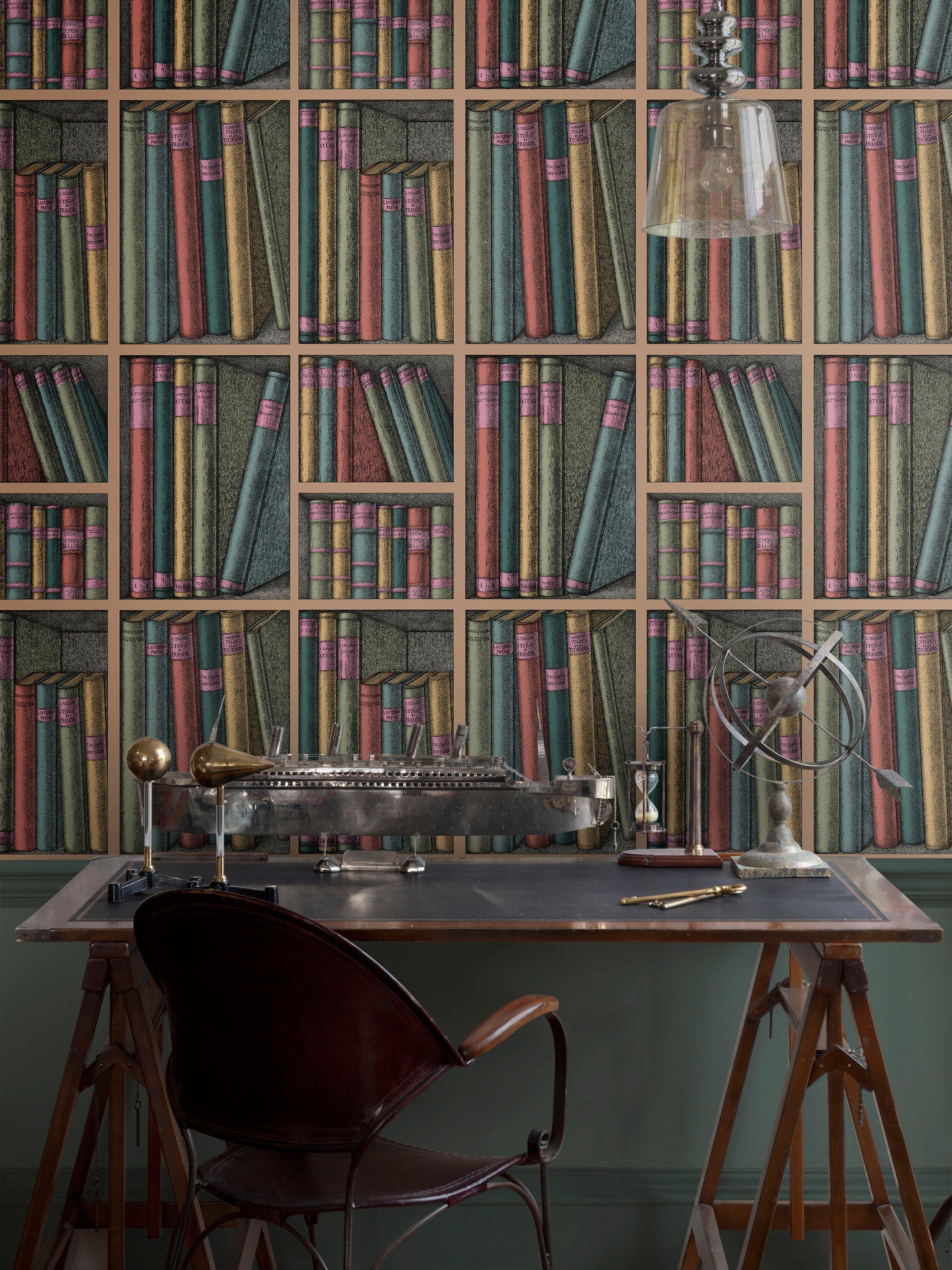 This library Trompe l’oeil scene, abundant in leather-bound books, is adapted from a 1953 screen. The Forest colourway comprises of pine and fern green deliciously accented with bright tones of rich tomato, cerise and decadent saffron, creating a vibrant and conversational wall covering.