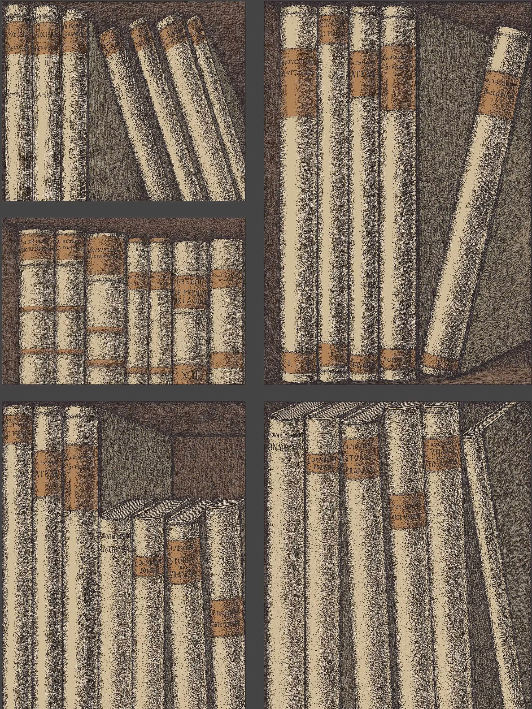 An avid collector of literature volumes on the applied arts, Fornasetti used books as a recurring theme which can be found throughout the Atelier s archive. This library Trompe l'oeil scene, abundant in leather-bound books, is adapted from a 1953 screen.