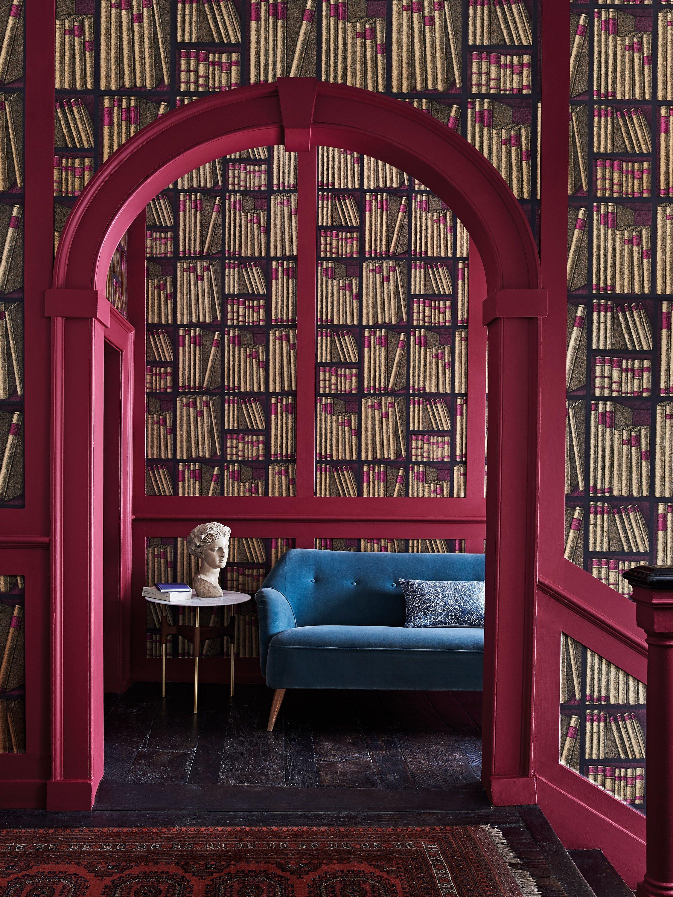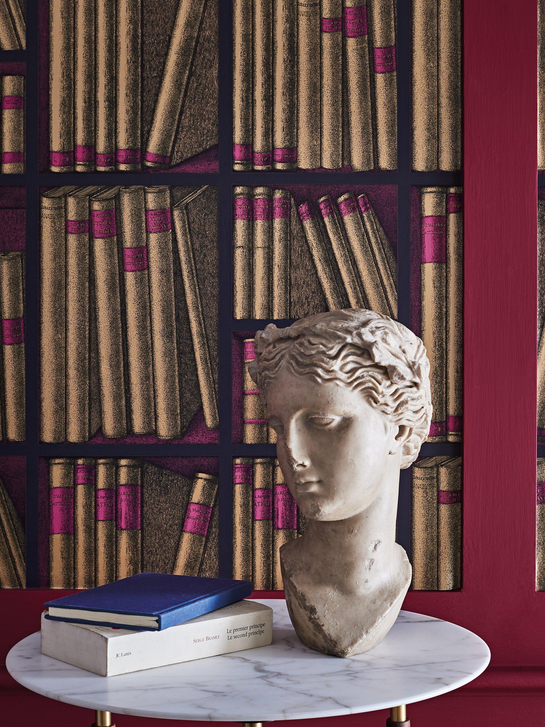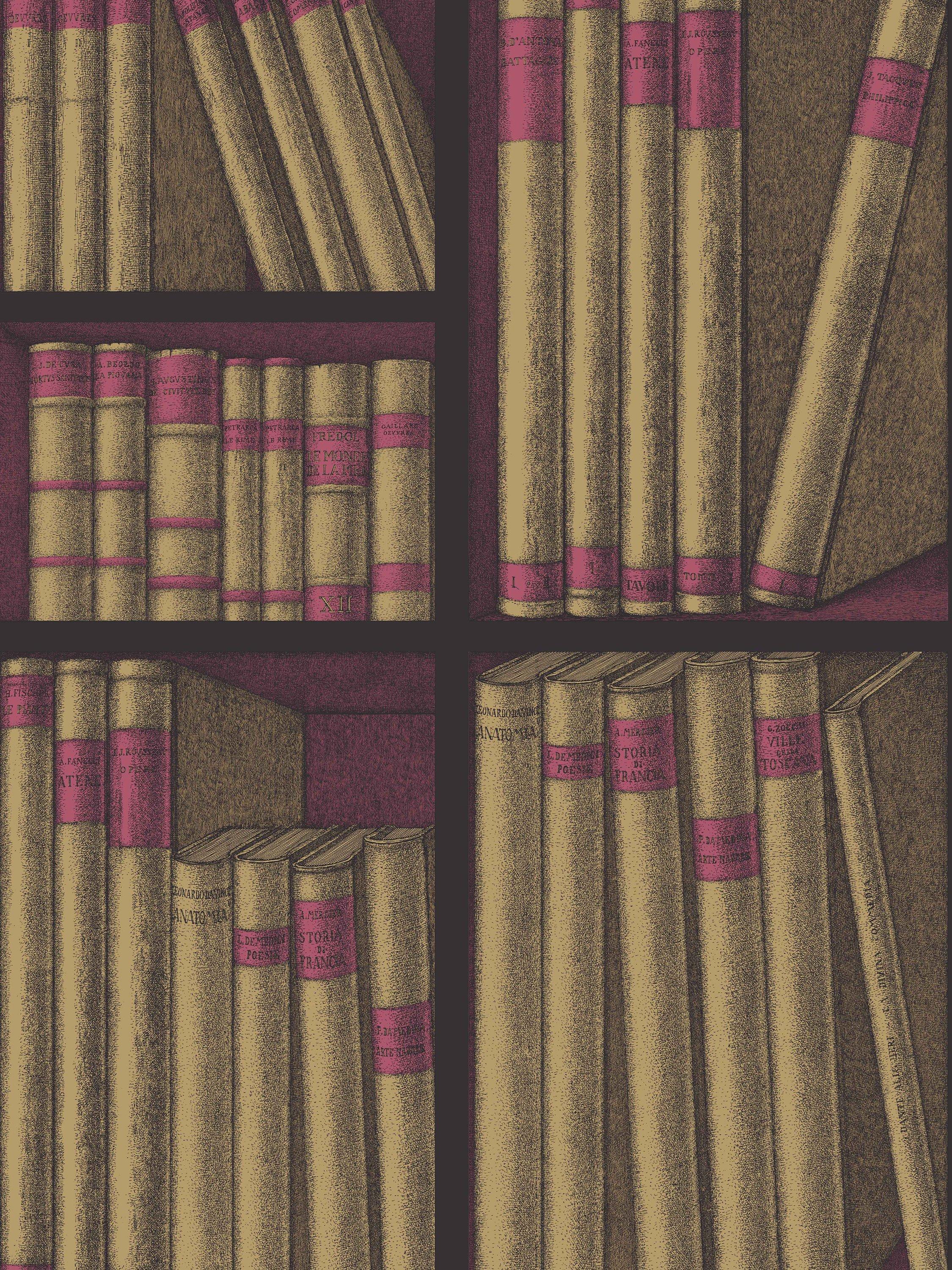 An avid collector of literature volumes on the applied arts, Fornasetti used books as a recurring theme which can be found throughout the Atelier s archive. This library Trompe l'oeil scene, abundant in leather-bound books, is adapted from a 1953 screen.