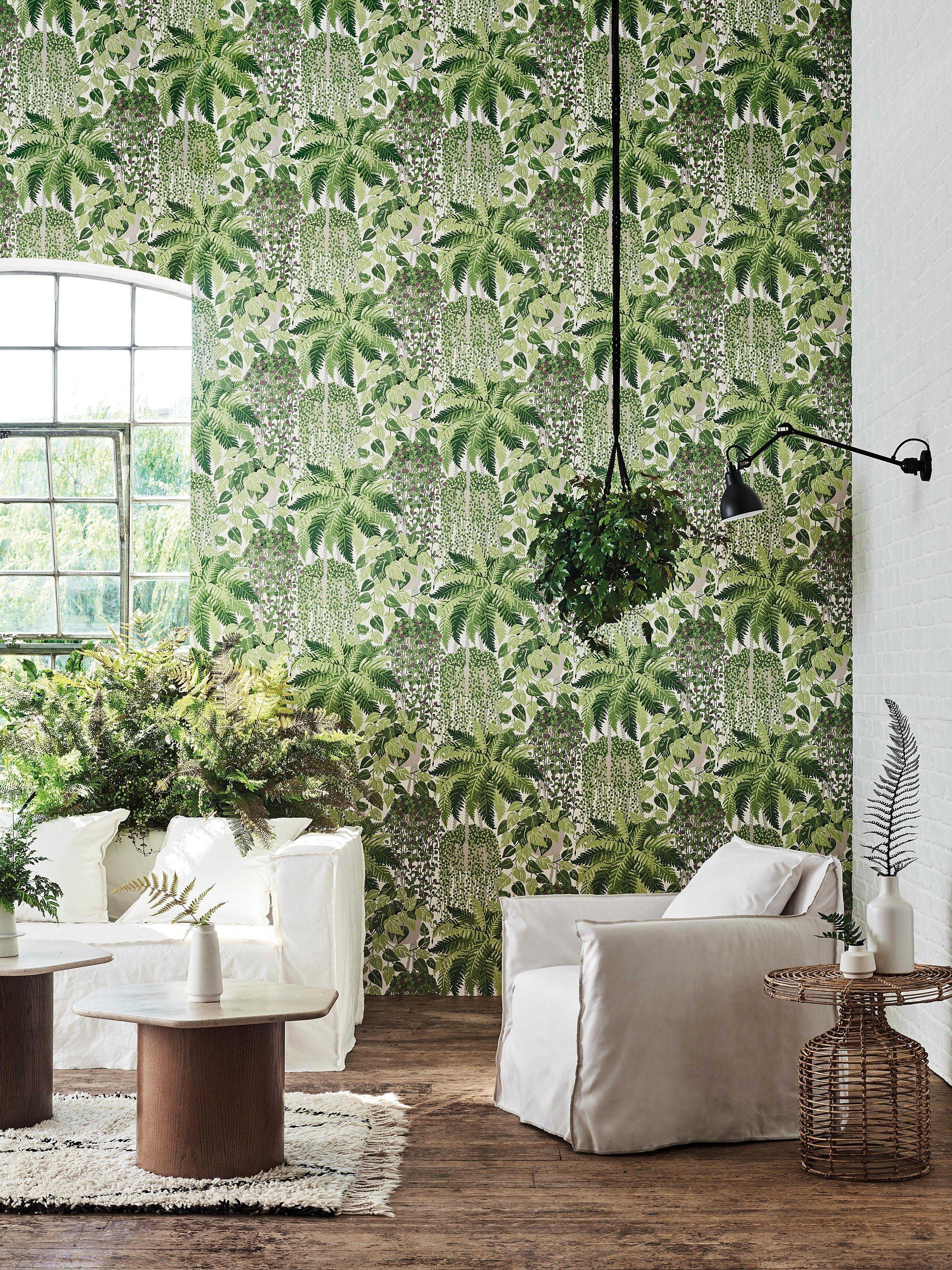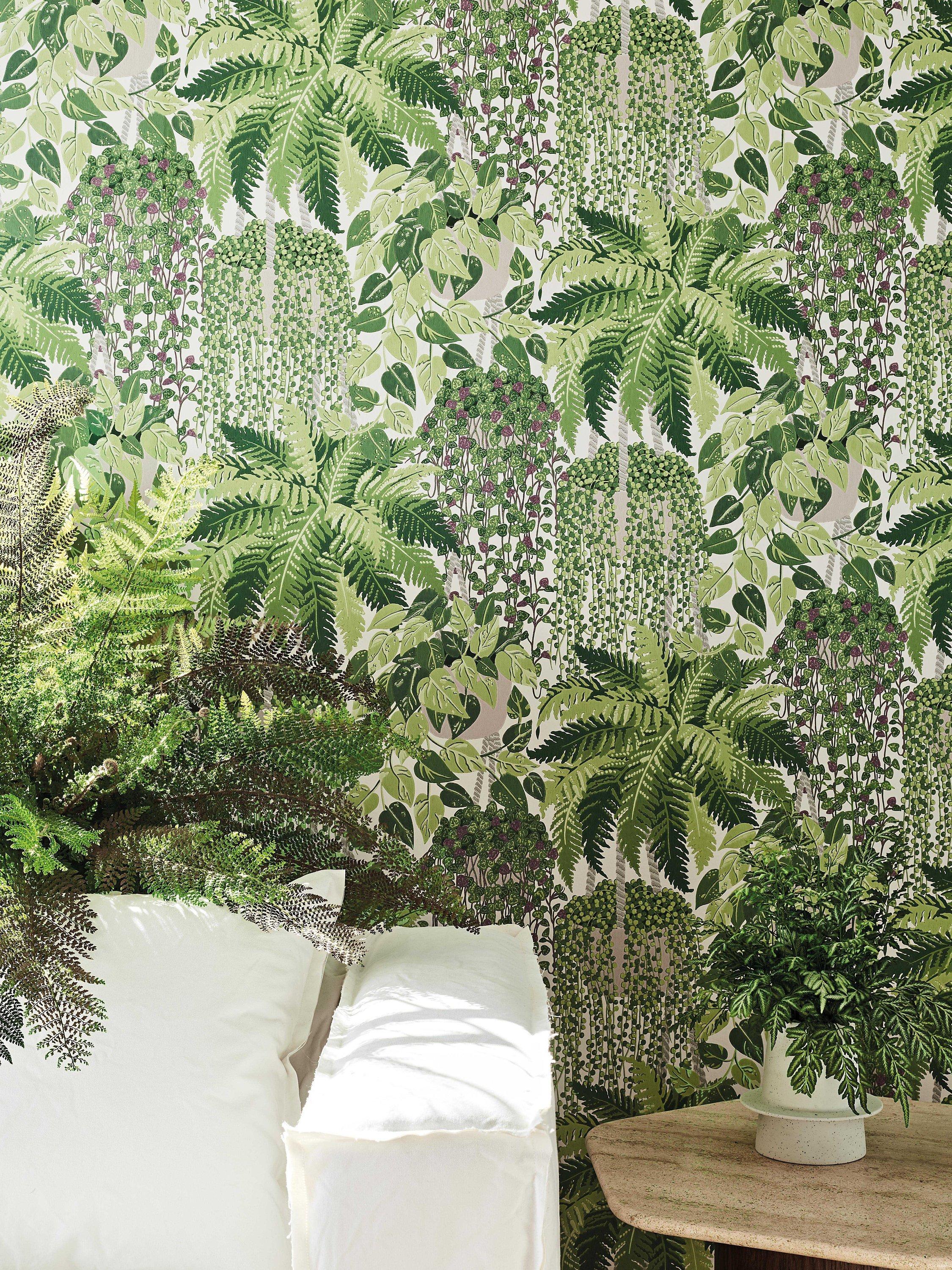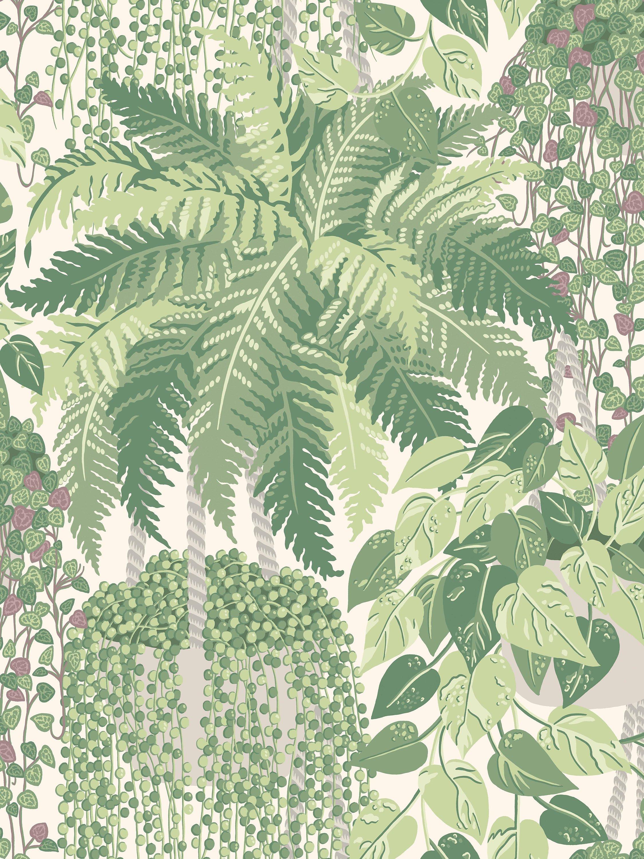 Fern takes us from the garden to the glasshouse where trailing String of Pearl plants spill from handmade macramé baskets and planters. This distinctly British botanical is a continuation of Cole & Son's many striking studies of plant life.