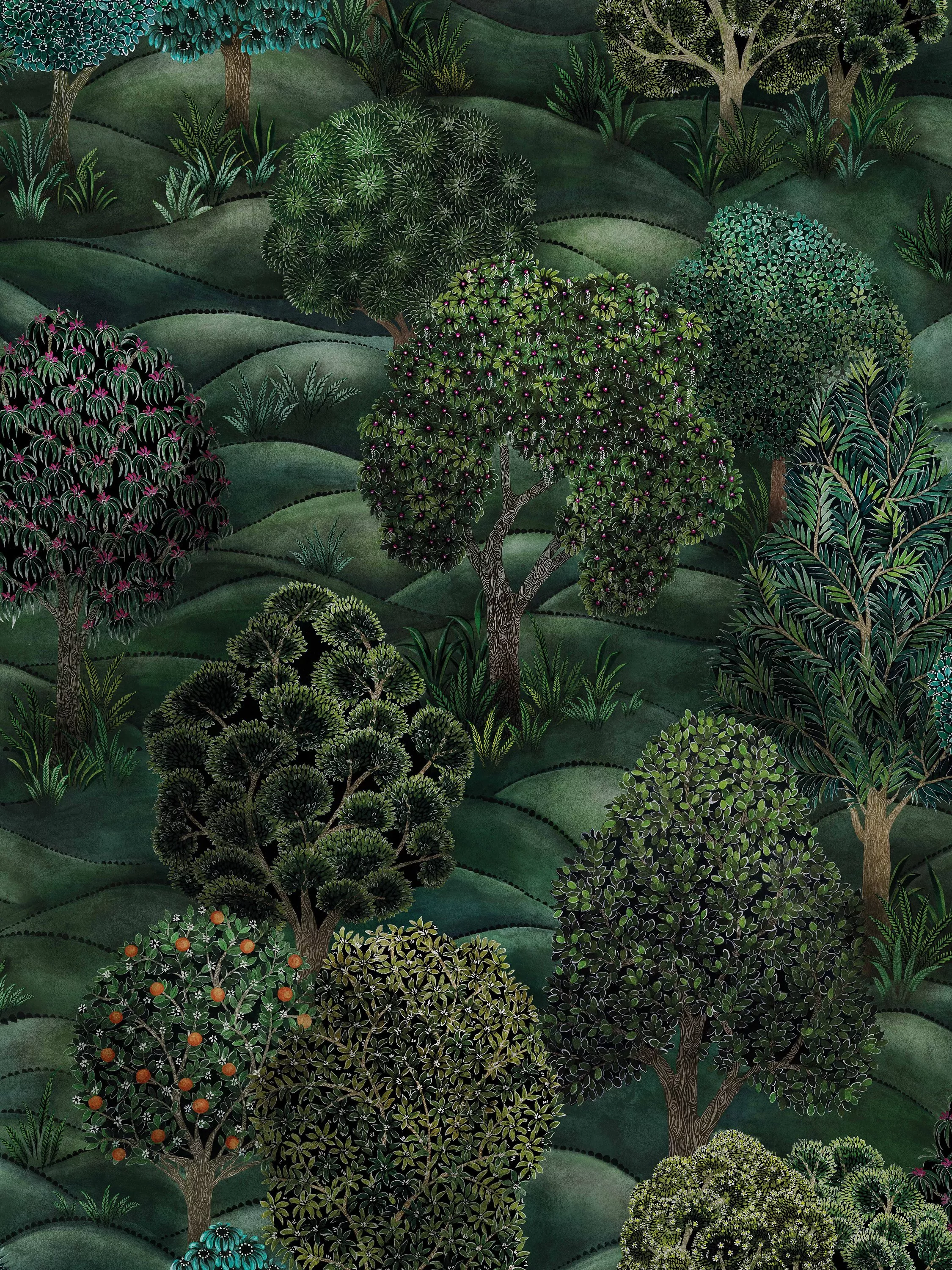 It's no wonder that Silvan forests feature so heavily throughout literature and folklore; the sense of being wholly enveloped upon stepping into an array of trees and undergrowth as far and wide as the eye can see creating an awe-inspiring feeling. Translated here in Forest's large-scale, intricately hand-painted, fantastical trees, the dappled light traverses through far off branches as the dense ground cover emits the warm and welcoming woody fragrance of childhood memories.