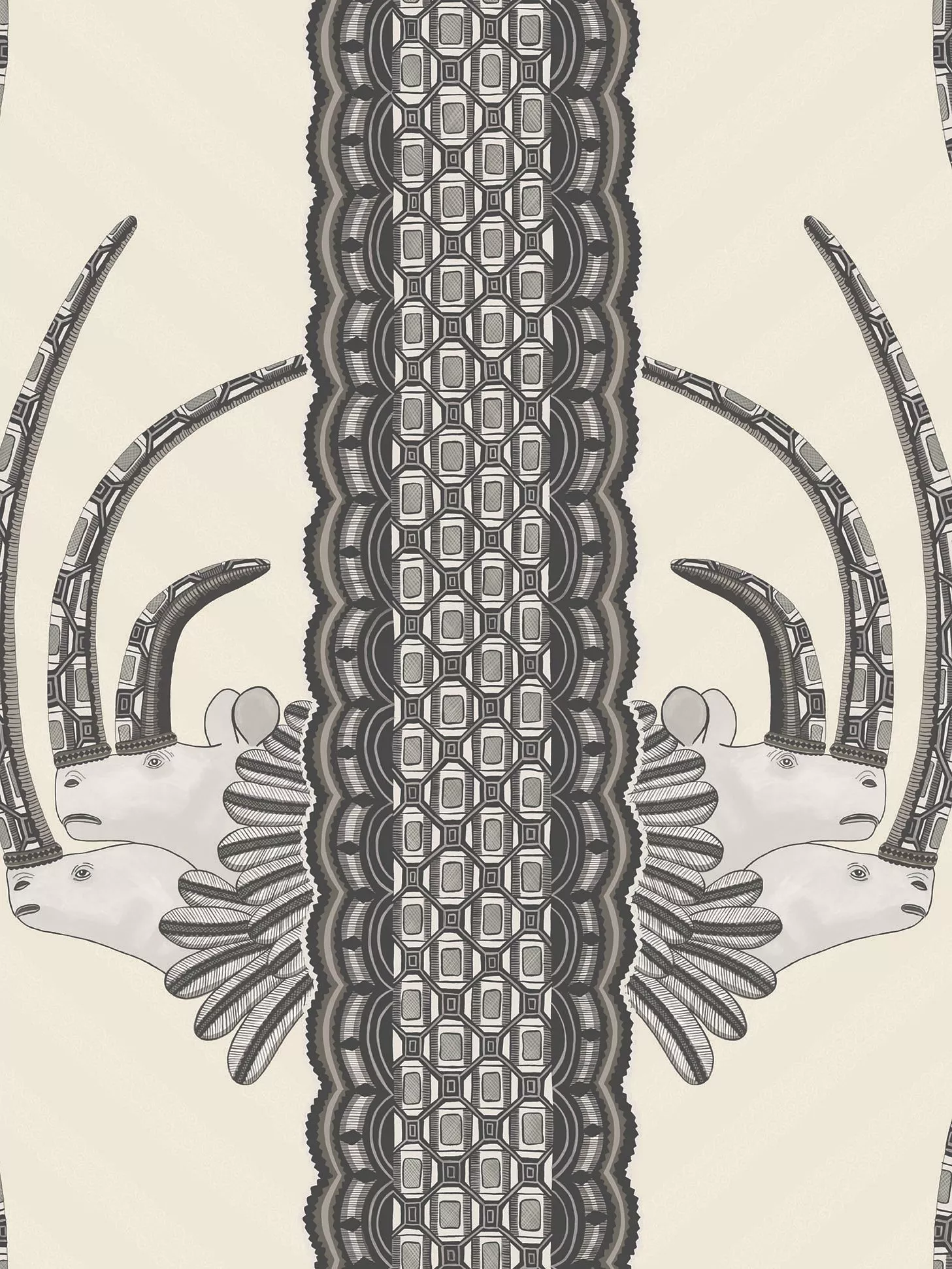 A design inspired by sculptural rhino hand coiled vessels made by Ardmore Ceramics. The markings on these pots have been used to create a wonderfully rich and vibrant vertical stripe, out of which peek a pair of regal white rhinos, complete with adorned horns and feathered ruffs.