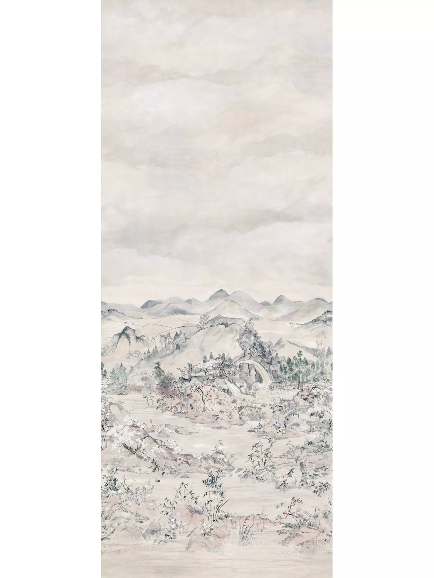 A breathtaking chinoiserie that is a culmination of several sceneries resonating from the most beautiful gardens of Japan. Let the calligraphy strokes guide you through the landscape. Immerse yourself through hills, trees, flowers and the flowing water that cascades throughout the panel. Experience the charming blossoms of the iconic Sakura tree that poetically and aesthetically bloom in the natural landscape.
