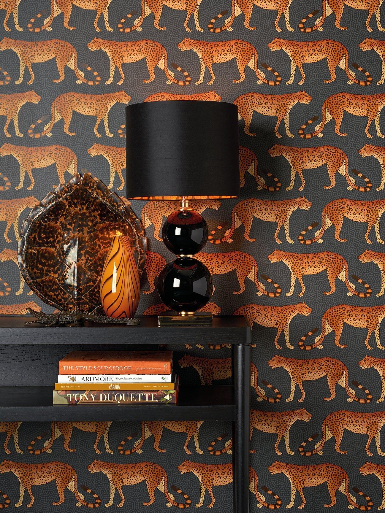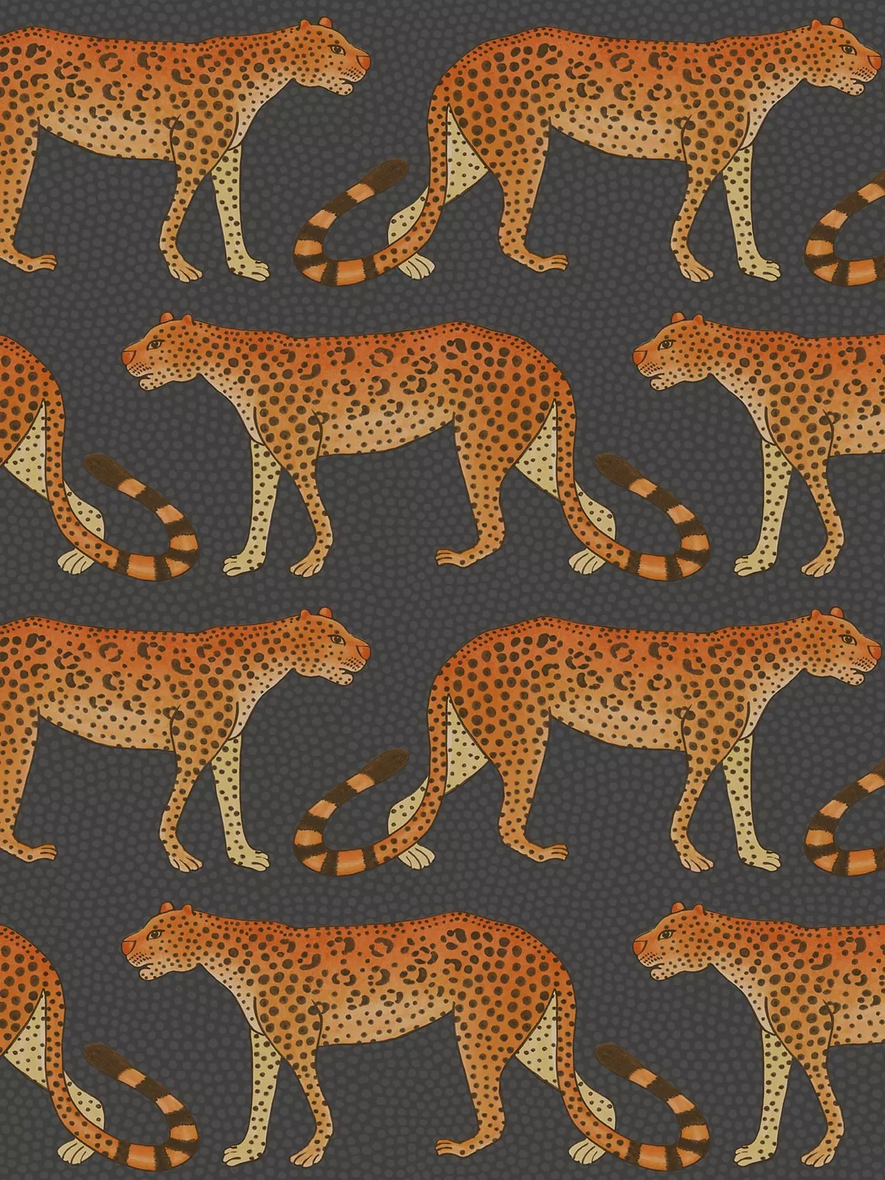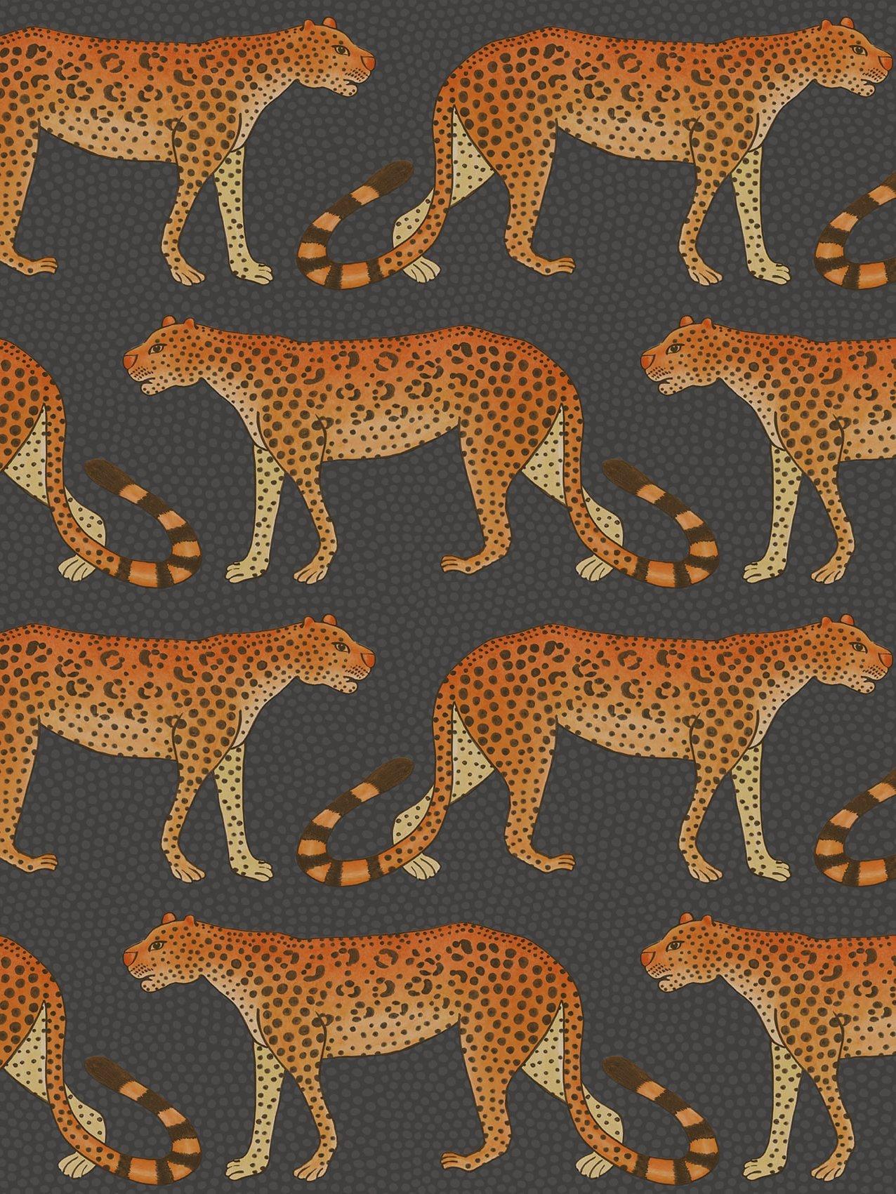Leopards march left and right across this wallpaper, their tails forming patterns and rhythms associated with Zulu dance and music.