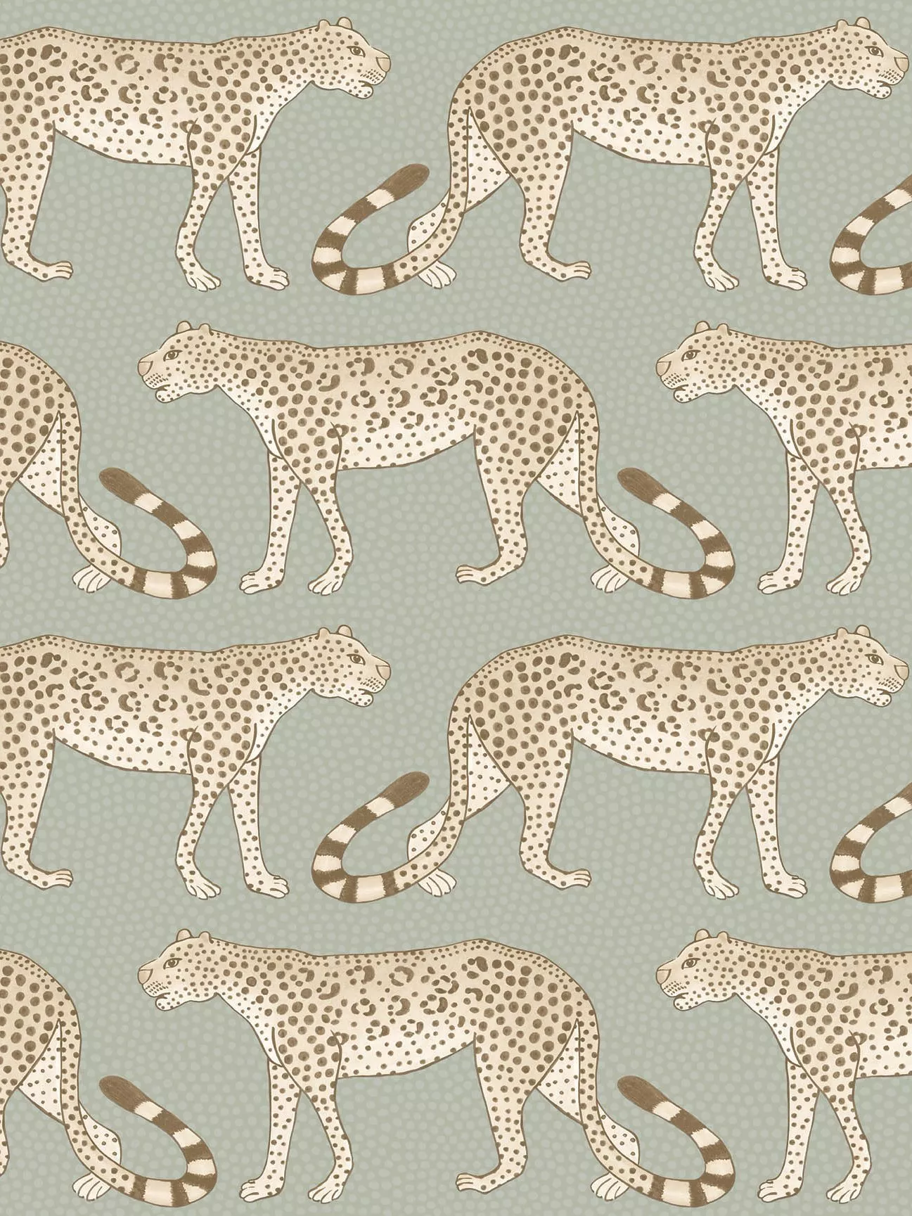 Leopards march left and right across this wallpaper, their tails forming patterns and rhythms associated with Zulu dance and music.
