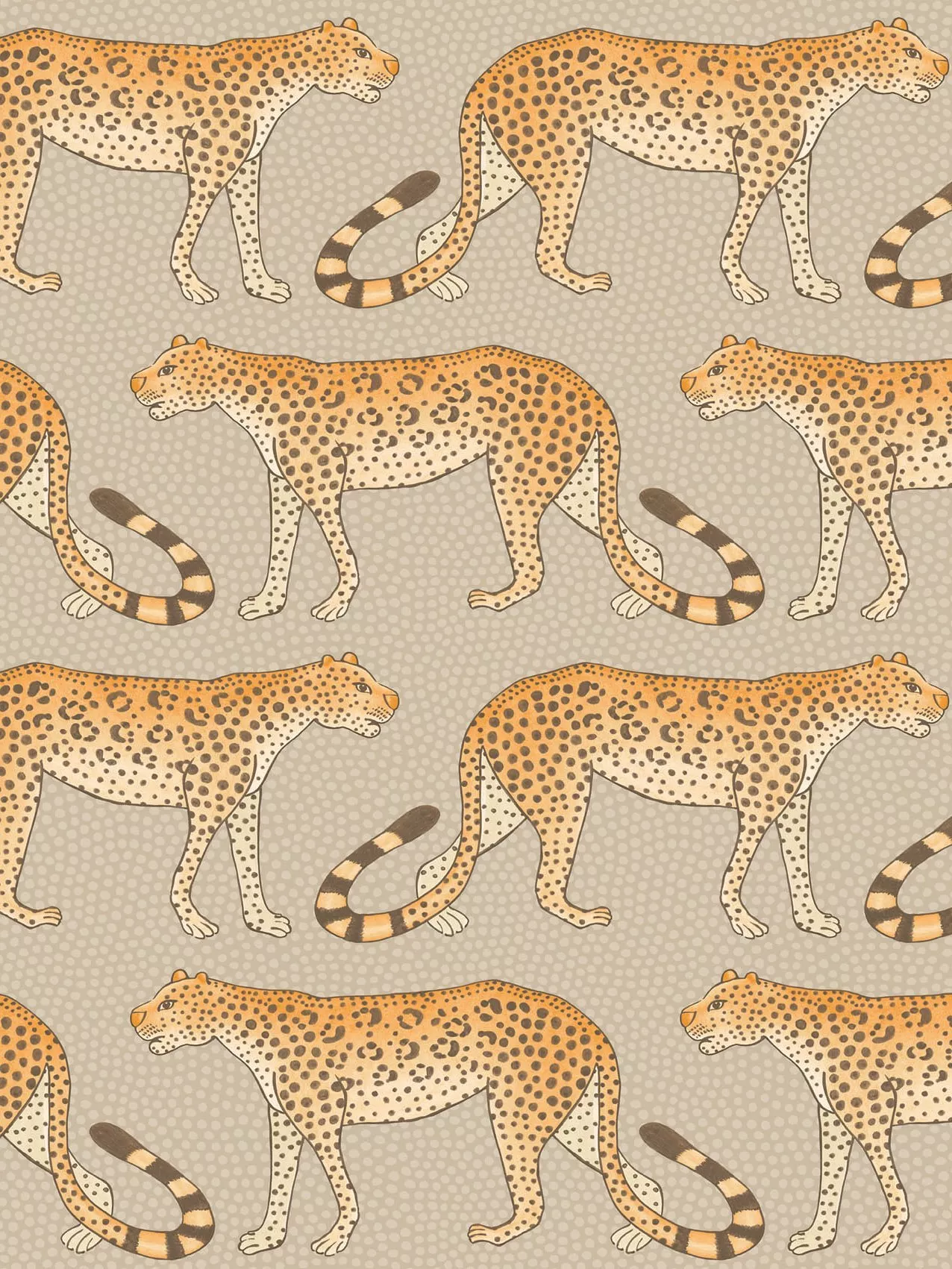 Leopards march left and right across this wallpaper, their tails forming patterns and rhythms associated with Zulu dance and music.