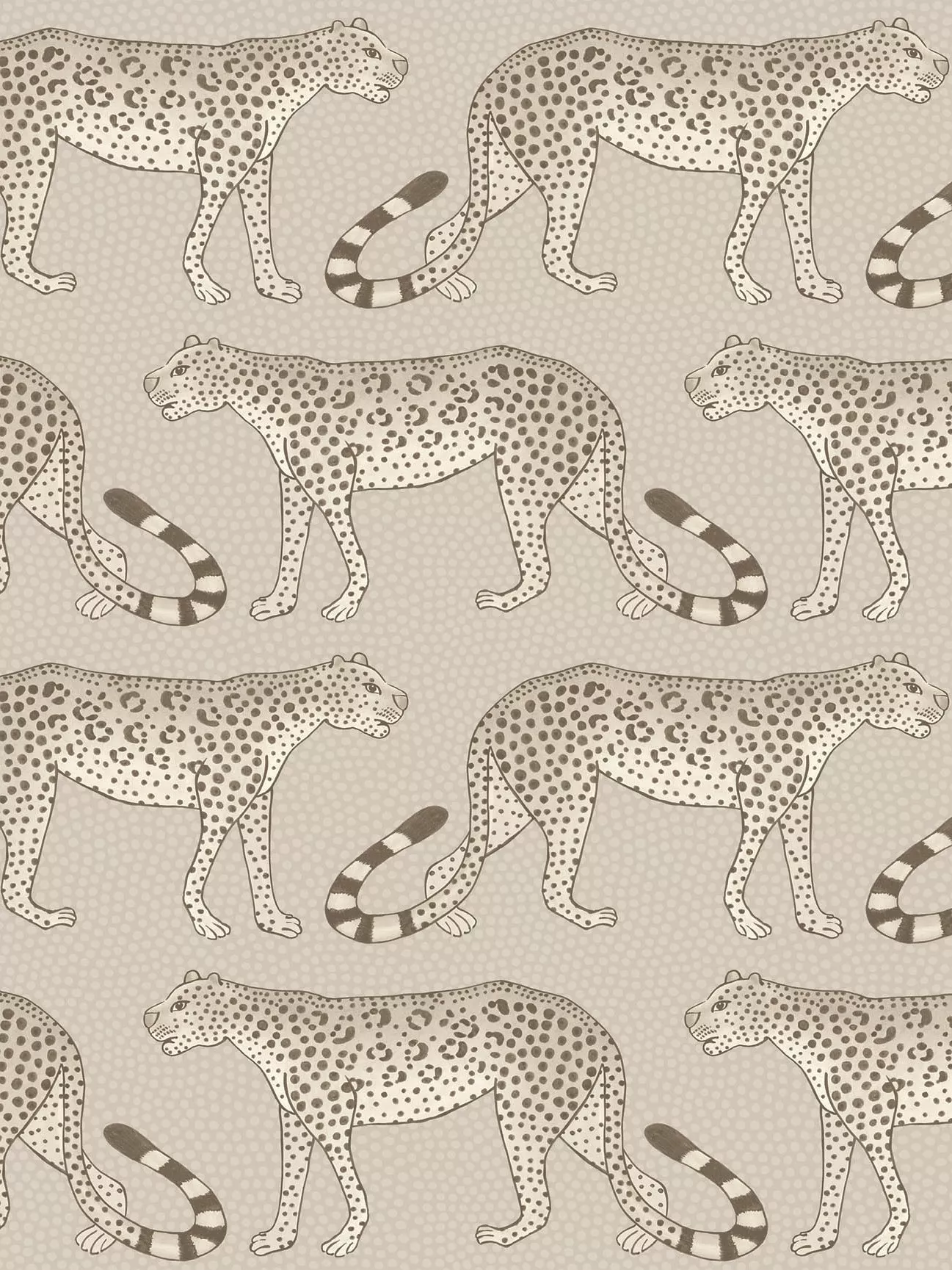 Leopards march left and right across this wallpaper, their tails forming patterns and rhythms associated with Zulu dance and music.
