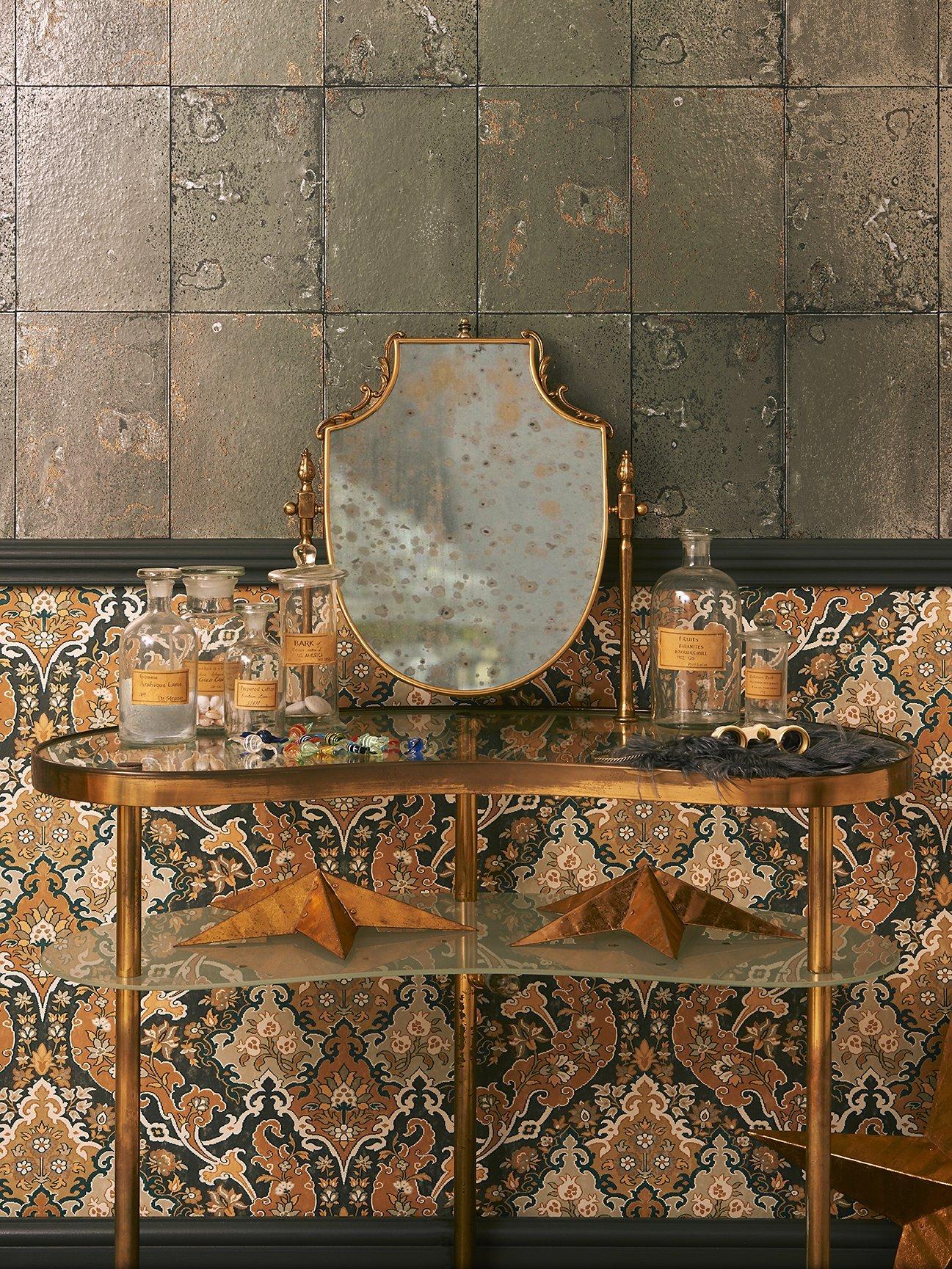 Foxed metallic panels on a foil base paper create the illusion of an aged mirror.